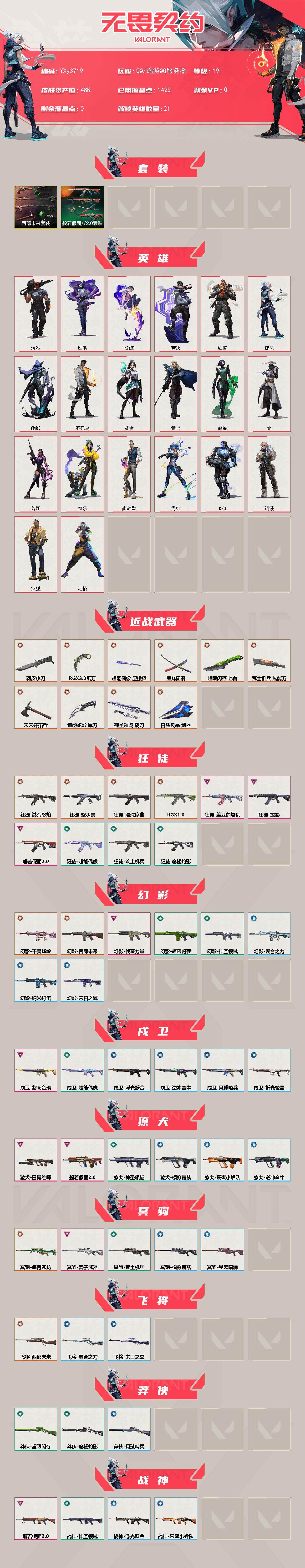 冻结三分钟内解除,短信通知重新上即可!喜欢收藏不迷路、游戏异常进小黑屋、时间不够请提前续租或者不要开局 【套装】:西部未来套装,般若假面//2.0套装 【英雄】:幻棱,炼狱,维斯,暮蝶,钛狐,壹决,铁臂,捷风,幽影,不死鸟,贤者,猎枭,蝰蛇,零,芮娜,奇乐,尚勃勒,霓虹,K/O,钢锁 【近战武器】:近战武器-剥皮小刀,近战武器-RGX 11z Pro//3.0 爪刀,近战武器-鬼丸国纲,近战武器-未来开拓者,近战武器-超能偶像 应援棒,近战武器-超限闪存 匕首,近战武器-荒土机兵 热能刀,近战武器-诡秘蛇影 军刀,近战武器-神圣领域 战刀,近战武器-日耀风暴 遗器 【狂徒】:狂徒-洪荒怒焰,狂徒-混沌序曲,狂徒-塑水宗,狂徒-RGX 11z Pro,狂徒-般若假面//2.0,狂徒-掠影,狂徒-盖亚的复仇,狂徒-超能偶像,狂徒-荒土机兵,狂徒-诡秘蛇影 【幻影】:幻影-千灵华绽,幻影-西部未来,幻影-侦察力量,幻影-超限闪存,幻影-神圣领域,幻影-聚合之力,幻影-纳米打,幻影-末日之翼,幻影-西部未来 【戍卫】:戍卫-紫阙金琅,戍卫-超能偶像,戍卫-浮光跃金,戍卫-逆冲蛮牛,戍卫-月球哨兵,戍卫-折光棱晶 【獠犬】:獠犬-般若假面//2.0,獠犬-日冕雄师,獠犬-神圣领域,獠犬-采蜜小蜂队,獠犬-模拟赫兹,獠犬-逆冲蛮牛 【冥驹】:冥驹-偃月苍龙,冥驹-离子武器,冥驹-荒土机兵,冥驹-模拟赫兹,冥驹-星云暗涌 【飞将】:飞将-西部未来,飞将-聚合之力,飞将-末日之翼 【莽侠】:莽侠-超限闪存,莽侠-诡秘蛇影,莽侠-月球哨兵 【战神】:战神-般若假面//2.0,战神-神圣领域,战神-采蜜小蜂队,战神-浮光跃金 【奥丁】:奥丁-西部未来,奥丁-纳米击,奥丁-末日之翼 【判官】:判官-超能偶像,判官-诡秘蛇影,判官-采蜜小蜂队,判官-纳米打x 【雄鹿】:雄鹿-起源,雄鹿-模拟赫兹,雄鹿-逆冲蛮牛,雄鹿-月球哨兵 【骇灵】:骇灵-荒土机兵,骇灵-浮光跃金,骇灵-星云暗涌 【蜂刺】:蜂刺-超限闪存,蜂刺-聚合之力,蜂刺-星云暗涌,蜂刺-折光棱晶 【标配】:标配-超能偶像,标配-荒土机兵,标配-浮光跃金,标配-折光棱晶 【VCT手枪】:标配-VCT25 x TH 【正义】:正义-奇点,正义-西部未来,正义-超限闪存,正义-纳米击,正义-月球哨兵 【鬼魅】:鬼魅-天界神兵,鬼魅-诡秘蛇影,鬼魅-采蜜小蜂队,鬼魅-模拟赫兹,鬼魅-星云暗涌 【狂怒】:狂怒-般若假面//2.0,狂怒-神圣领域,狂怒-聚合之力,狂怒-逆冲蛮牛 【短炮】:短炮-归零者,短炮-末日之翼 【卡面】:终章:激斗汉堡 卡面,进入射程 卡面,分崩离析 卡面,纳米击 卡面,抑制技术 卡面,激斗汉堡 卡面,瓦娃雪糕 P2 卡面,从黄昏到黎明 卡面,荒土机兵 卡面,银弹猎手 卡面,逆冲蛮牛 卡面,《双城之战》拥抱 卡面,精灵大战 卡面,欢迎来到底城 卡面,南瓜盛典 卡面,VCT CN首冠 卡面,唱片的故事 卡面,钢弓与箭弦 卡面,无畏契约:暮蝶 卡面,排除故障 卡面,战术桌游 卡面,悠享食光 卡面,修车达人 卡面,热舞环节 卡面,模拟赫兹 卡面,浮光跃金 卡面,超限闪存 卡面,维斯工牌 卡面,正义的化身 卡面,终章:生意人麦宝 卡面,铁之华 卡面,失而复得 卡面,时间到 卡面,最高舞台 卡面,复活专家 卡面,归乡 // 蝰蛇 卡面,超能偶像 卡面,生意人麦宝 卡面,声感陷阱设计图 卡面,红鳞松叶 卡面,钢锁工牌 卡面,战术小伙伴的夏日 卡面,采蜜小蜂队 卡面,聚合之力 卡面,梦幻奶茶 卡面,无畏契约GO!一卷:芮娜 卡面,无畏契约GO!卷:零 卡面,《双城之战》金克丝 卡面,战术小伙伴 卡面,无畏契约GO!一卷:贤者 卡面,胡桃狂想 卡面,代号红色 卡面,新兵报到 卡面,V契约 卡面,无畏契约 卡面 【喷漆】:小小心意 喷漆,战“素”兔 喷漆,宇宙的指引 喷漆,请求重启 喷漆,逆冲蛮牛 喷漆,纳米击 喷漆,鼻尖上的蝴蝶 喷漆,简笔画黯兽 喷漆,独守蝰腹 喷漆,他们将落荒而逃 喷漆,通缉:战术鹅 喷漆,荒土机兵 喷漆,别挡我吃球! 喷漆,嗨宝南瓜灯 喷漆,嘭! 喷漆,都算到了 喷漆,控场勿近 喷漆,皮蛋呼呼 喷漆,像素星礈 喷漆,图谋不轨的零 喷漆,伤心心 喷漆,小丑猫 喷漆,模拟赫兹 喷漆,高丽风情小熊 喷漆,蹲到一个 喷漆,全力集中 喷漆,超限闪存 喷漆,RUA一下 喷漆,熊抱 喷漆,蛋糕还是爆能器? 喷漆,高丽风情小虎 喷漆,记在小本本 喷漆,防弹鹅 喷漆,高丽风情小蛙 喷漆,又被闪了 喷漆,终极羞辱 喷漆,超级粉丝 喷漆,黯兽卖萌 喷漆,捷风差距 喷漆,惊声尖叫 喷漆,2021冠军巡回赛花火 喷漆,五人成星 喷漆,超能偶像 喷漆,放我出去 喷漆,掩护我 喷漆,大佬发枪 喷漆,边缘试探 喷漆,拼一枪 喷漆,聚合之力 喷漆,采蜜蜂队 喷漆,梦幻小队 喷漆,五个全都齐了 喷漆,一个人的孤岛 喷漆,买装还是存钱 喷漆,关门放狗 喷漆,无畏契约GO一卷:芮娜 喷漆,无畏契约GO!一卷:贤者 喷漆,胜利属于无畏契约 喷漆,GLHF 喷漆,无畏契约 喷漆 【挂饰】:终章:猫猫木乃伊 挂饰,荒土机兵 挂饰,悠闲鸡块 挂饰,猫猫木乃伊 挂饰,水壶 挂饰,纳米击 挂饰,逆冲蛮牛 挂饰,可爱糖糖 挂饰,伞绳 挂饰,《双城之战》小蛋糕 挂饰,第九季//第三幕 纪念币 挂饰,拳击战术熊 挂饰,工具腰带 挂饰,无畏契约GO!一卷 芮娜 挂饰,无畏契约GO!一卷 零 挂饰,暗藏猫腻 挂饰,高丽风情 挂饰,鱼骨头 挂饰,熔岩灯 挂饰,超限闪存 挂饰,瞬云履 挂饰,迷你K/O 挂饰,模拟赫兹 挂饰,第九季//第二幕 纪念币 挂饰,薰衣草之心 挂饰,终章:这瓜保熟 挂饰,炼狱雪糕 挂饰,糖葫芦 挂饰,袖珍捷风 挂饰,冲上云霄 挂饰,超能偶像 挂饰,迷你浓缩 挂饰,这瓜保熟 挂饰,Z世代特饮 挂饰,动力机箱 挂