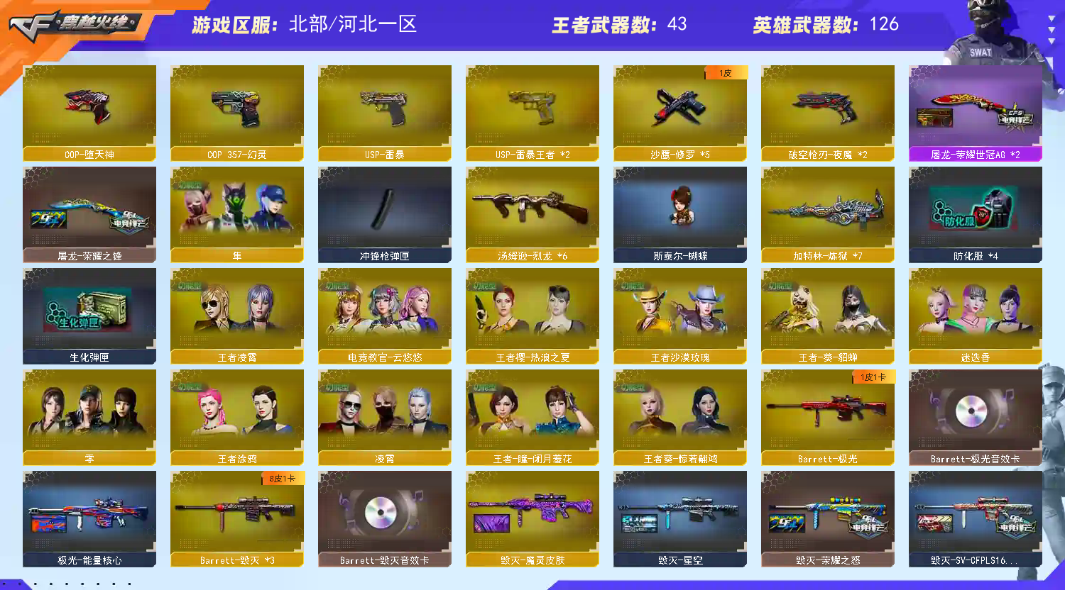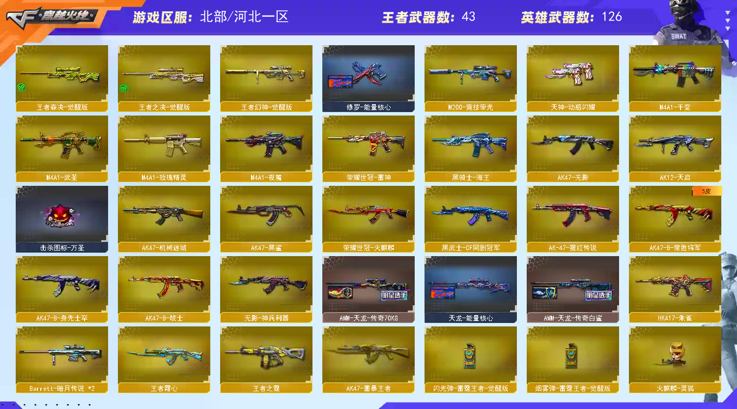【商品标题】:北部河北一区-134V-可二次实名-【Lv.100.2-高阶大元帅】-【段位:荣耀枪王】 【稀有武器】:传说光耀/传说辉光/传说圣灵/传说梦魇/M200-幻神/Kar98K-星神/G36C-幻影/ScarLight-白虎/HK417-朱雀/M4A1-夜魔/USP-雷暴/COP-堕天神/破空枪刃-夜魔(2)/COP357-幻灵/柯尔特-竞技荣光/天神-动感闪耀/荣耀世冠-柯尔特(2)/COP357-雷霆王者-觉醒版/柯尔特-冠军之特/QBZ03-金色蔷薇/AK47-火麒麟(2)/M4A1-黑龙/M4A1-雷神/M4A1-黑骑士/AK47-无影/荣耀世冠-火麒麟/荣耀世冠-雷神/Barrett-毁灭(3)/Barrett-极光/AWM-裁决/M200-竞技荣光/加特林-炼狱(7)/汤姆逊-烈龙(6)/麒麟刺-堕天神/龙啸-堕天神(2)/马来剑-夜魔/幻灵之锋/擎天-竞技荣光 【王者武器】:王者之心-觉醒版/QBZ-03-王者蔷薇-觉醒版/王者之怒-觉醒版/王者之决-觉醒版/王者幻神-觉醒版/王者森决-觉醒版/王者之霆/王者玉锋 【热门角色】:传说女帝/电竞教官-云悠悠/凌霄/迷迭香/隼/乔伊教练/王者-葵-貂蝉/王者凌霄/王者沙漠玫瑰/王者涂鸦/潘多拉-X/兔囡囡/幽/职业选手/潘多拉 【热门音效卡】:M200-幻神音效卡/AWM-裁决音效卡/Scar Light-白虎音效卡(2)/QBZ03-金色蔷薇音效卡/M4A1-雷神音效卡/Barrett-毁灭音效卡/M4A1-黑骑士音效卡(2)/AK47-火麒麟音效卡/Barrett-极光音效卡 【热门皮肤】:幻神-宠儿-2021MVP/幻神-星火小队签名臻藏版皮肤/幻神-AG-CFPLS17冠军/幻神-CFS2022/幻神-电流骇客皮肤/幻神-周瑜皮肤/QBZ03-CFS2024皮肤/火麒麟-白虎/裁决-羽掣皮肤/火麒麟-荣耀世冠AG/雷神-R.LGD-CFPLS18冠军/屠龙-荣耀世冠AG(2)/雷神-荣耀世冠AG/火麒麟-巅峰荣耀/雷神-宠儿-2019MVP/雷神-传奇N9/AK47-火麒麟-传奇EVEN/ScarLight-白虎-暗星/火麒麟-冠军之心/毁灭-冠军之怒/黑骑士-AG-S4冠军典藏/屠龙-荣耀之锋/毁灭-荣耀之怒/雷神-冠军之魄/毁灭-CFS2020/雷神-荣耀之魄 【其他亮点】:斯泰尔-蝴蝶/Knife-冠军之刃(2)/幻神-魅影/黄金猫猫手套-白鲨/金刚伞-电玩红兔/烟雾弹-荣耀世冠白鲨2023 (截图展示段位不代表实际段位,如赛季更新等不可抗拒因素发生变化,其余道具看截图或咨询客服);USP-雷暴,USP-雷暴王者,荣耀世冠-柯尔特,柯尔特-冠军之特,Knife-冠军之刃,传说女帝,隼,