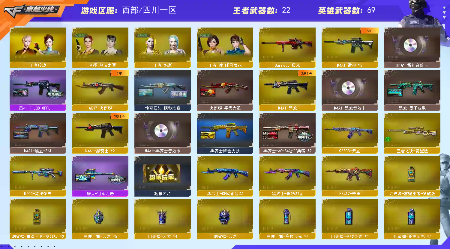 传说女帝,传说影煞,炽芒蝶刃,幻神m200(冠军之幻,白鲨2023,音效卡)白虎,星神,cop雷霆王者,传说光耀,传说破晓,传说幽瞳,传说幽冥,传说暗裔;柯尔特-荣耀世冠白鲨2023,传说幽冥,柯尔特-冠军之特,炽芒蝶刃,传说影煞,传说女帝,QBZ03-金色蔷薇,