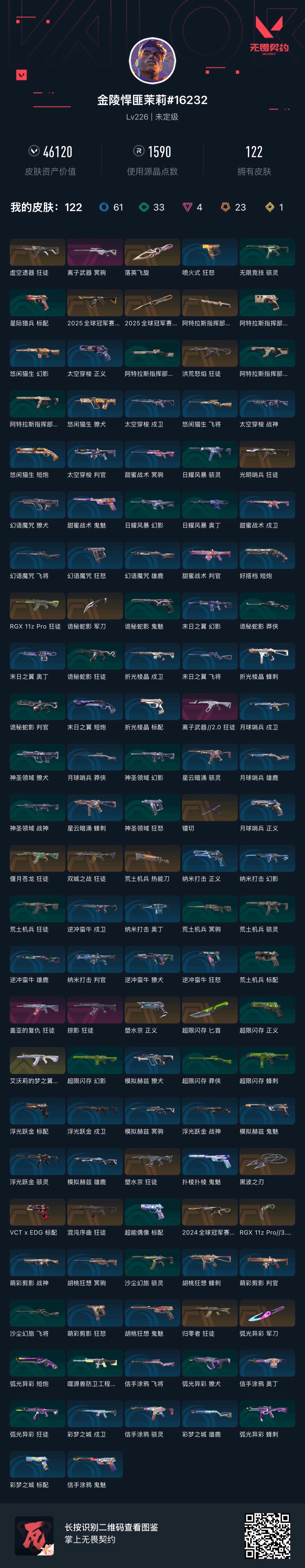 可排位 英雄28 武器皮肤数量122;黑波之刃,镭切,盖亚的复仇 狂徒,虚空遗器 狂徒,洪荒怒焰 狂徒,掠影 狂徒,RGX 11z Pro 狂徒,