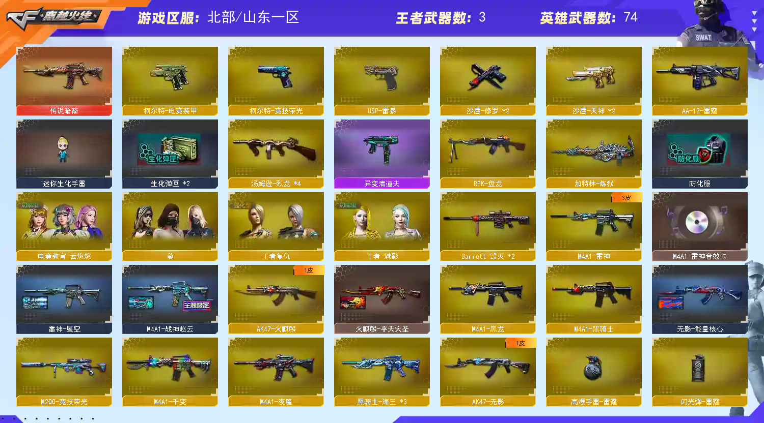 100V传说暗裔/幻神竞技荣光全套/雷暴USP/王者之势.魄.魅.赵云.黑龙吞噬者 AK47-火麒麟 x 1 M4A1-雷神 x 1 M4A1-黑龙 x 1 M4A1-黑骑士 x 1 Barrett-毁灭 x 2 M4A1-千变 x 1 RPK-盘龙 x 1 汤姆逊-烈龙 x 4 M240B-苍雷 x 1 M4A1-樱 x 1 加特林-炼狱 x 1 AK-47-A x 1 死亡之眼 x 2 M4A1-电音 x 2 A180-蓝色骑士 x 1 炫金雷神 x 1 炫金雷神 x 1 9A91-烈火 x 1 异变清道夫 x 1 AA-12-雷霆 x 1 M4A1-夜魔 x 1 天启-悦智-觉醒版 x 1 王者之魄-觉醒版 x 1 王者之势-觉醒版 x 1 M200-竞技荣光 x 1 黑骑士-海王 x 3 副武器 Desert Eagle-A x 1 沙鹰-修罗 x 2 Desert Eagle-S x 1 沙鹰-天神 x 2 胜利之火 x 1 炫金修罗 x 2 凤凰之火 x 1 迷你手枪 x 1 沙鹰-青龙 x 1 USP-雷暴 x 1 Cop357-迷彩 x 1 Colt 1911-大黄蜂 x 1 柯尔特-电竞装甲 x 1 修罗-年鹏 x 1 柯尔特-竞技荣光 x 1 近身武器 擎天-竞技荣光 x 2 断离 x 1 龙啸 x 1 擎天 x 1 屠龙 x 5 破天斩魔剑 x 1 金砖 x 1 斩神刀 x 2 冰火魔兽 x 2 冰火神拳 x 2 斩神刀 x 2 等离切割者 x 1 军用铁锹-飞龙在天 x 1 收割者 x 1 不灭之拳 x 1 黄金丛林匕首 x 1 唐刀-盛世太平 x 1 雷霆之锋 x 1 迷你牛牛 x 1 投掷武器 激浪烟雾弹 x 2 绿色烟雾弹 x 2 高爆手雷 x 1 音乐手雷 x 1 高爆手雷-雷霆 x 1 闪光弹-雷霆 x 1 烟雾弹-雷霆 x 1 高爆手雷-雷蛇 x 2 闪光弹-掌火 x 1 闪光弹-竞技荣光 x 10 烟雾弹-竞技荣光 x 9 恶棍-电竞装甲 x 2 闪光弹-电竞装甲 x 2 高爆手雷-竞技荣光 x 7 烟雾弹-电竞装甲 x 2 道具 金蛇戒 x 1 银蛇戒 x 1 防弹衣 x 2 C4工具钳 x 1 手雷包 x 1 生化弹匣 x 1 炫彩背包 x 1 雷神-星空 x 1 M4A1-雷神音效卡 x 1 火麒麟-平天大圣 x 1 M4A1-战神赵云 x 1 无影-能量核心 x 1 极光-能量核心 x 1 角色 电竞教官-云悠悠 葵 王者复仇 甜心灵狐 王者-魅影;USP-雷暴,电竞教官-云悠悠,RPK-盘龙,传说暗裔,