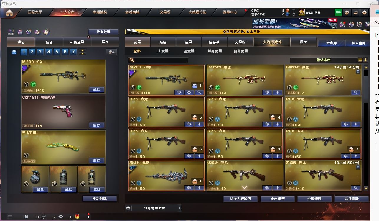 【亮点解析 幻神三件套 生化高配】【m200幻神+音效卡+巅峰荣耀】【6盘龙 炼狱 烈龙 】【传说辉光】【白虎电玩蓝兔】【qbz金色蔷薇】【hk417朱雀】【火麒麟+卡+冠军之心】【黑龙】【雷神+卡+荣耀之魄】【黑骑士+卡】【毁灭+卡】【极光】 【武器:王者之幻 王者冰魄 】 【手枪:修罗*3】 【8刀具:屠龙*2 龙啸 尼泊尔雷霆 麒麟刺堕天神 王者之击 王者玉锋】 【3雷套:雷霆*2 堕天神雷】 【小人枪:雷神精英刀锋 天龙曼陀罗 】 【音效卡:火麒麟音效卡 幻神音效卡 黑骑士音效卡 雷神音效卡 毁灭音效卡 】 【角色:樱 】;RPK-盘龙,QBZ03-金色蔷薇,M200-幻神,