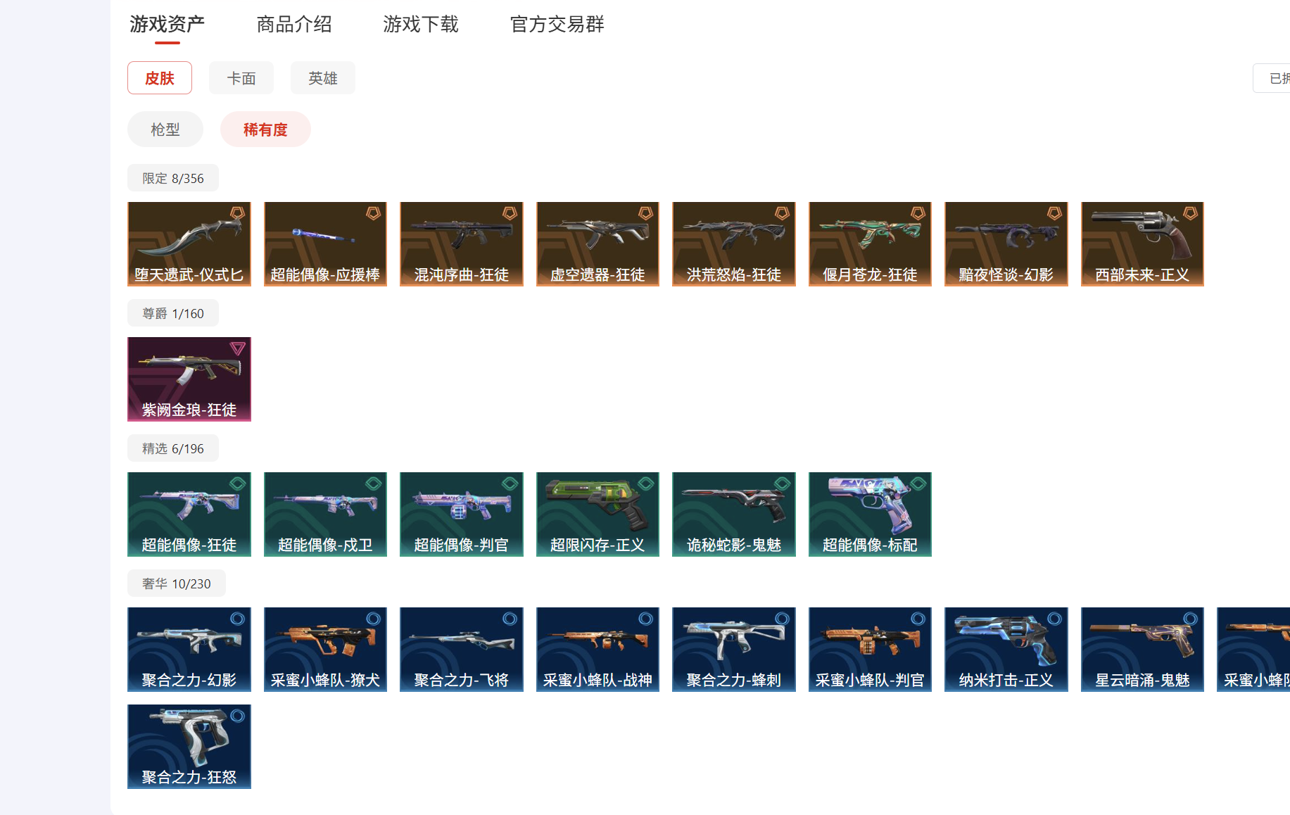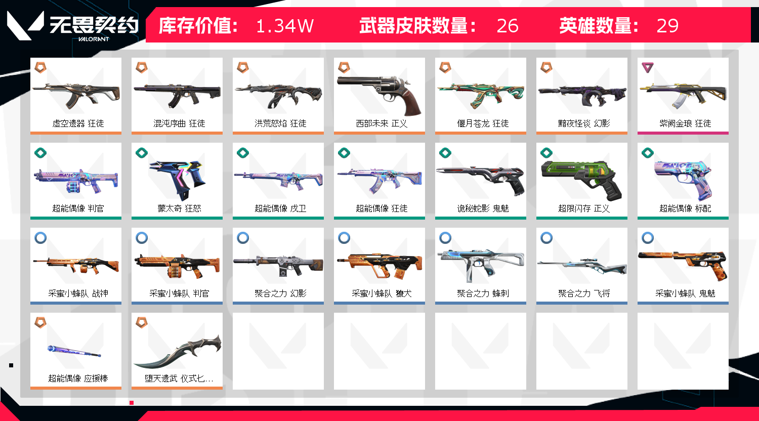 可排位 英雄27 武器皮肤数量25;虚空遗器 狂徒,洪荒怒焰 狂徒,紫阙金琅 狂徒,混沌序曲 狂徒,西部未来 正义,