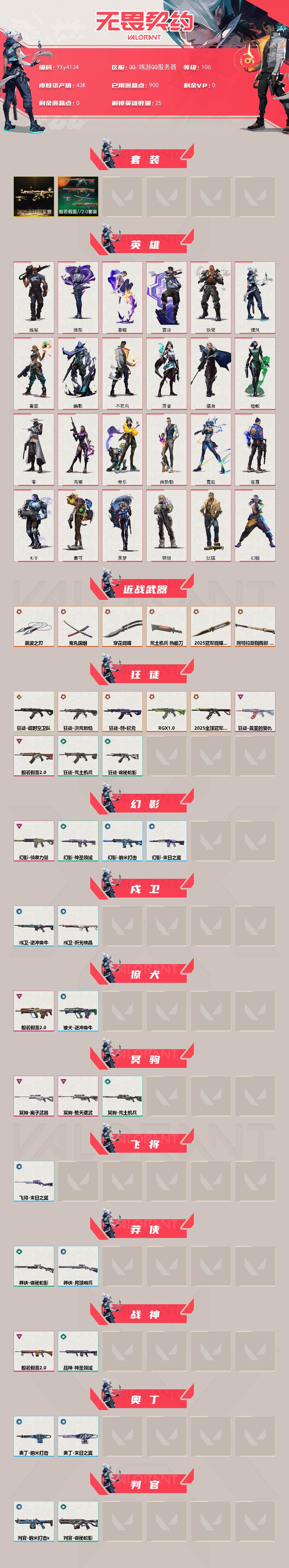 冻结三分钟内解除,短信通知重新上即可!喜欢收藏不迷路、游戏异常进小黑屋、时间不够请提前续租或者不要开局 【套装】:2025全球冠军赛套装,般若假面//2.0套装 【英雄】:幻棱,炼狱,维斯,暮蝶,钛狐,壹决,铁臂,捷风,雷兹,幽影,不死鸟,贤者,猎枭,蝰蛇,零,芮娜,奇乐,尚勃勒,霓虹,夜露,K/O,盖可,黑梦,钢锁 【近战武器】:近战武器-2025全球冠军赛 蝴蝶刀,近战武器-穿花蝴蝶,近战武器-黑波之刃,近战武器-鬼丸国纲,近战武器-荒土机兵 热能刀,近战武器-阿特拉斯指挥部 甩棍 【狂徒】:狂徒-超时空卫队,狂徒-2025全球冠军赛,狂徒-洪荒怒焰,狂徒-创·纪元,狂徒-RGX 11z Pro,狂徒-般若假面//2.0,狂徒-盖亚的复仇,狂徒-荒土机兵,狂徒-诡秘蛇影 【幻影】:幻影-侦察力量,幻影-神圣领域,幻影-纳米击,幻影-末日之翼 【戍卫】:戍卫-逆冲蛮牛,戍卫-折光棱晶 【獠犬】:獠犬-般若假面//2.0,獠犬-逆冲蛮牛 【冥驹】:冥驹-堕天遗武,冥驹-离子武器,冥驹-荒土机兵 【飞将】:飞将-末日之翼 【莽侠】:莽侠-诡秘蛇影,莽侠-月球哨兵 【战神】:战神-般若假面//2.0,战神-神圣领域 【奥丁】:奥丁-纳米击,奥丁-末日之翼 【判官】:判官-诡秘蛇影,判官-纳米击x 【雄鹿】:雄鹿-离子武器,雄鹿-逆冲蛮牛,雄鹿-月球哨兵 【骇灵】:骇灵-荒土机兵,骇灵-星云暗涌 【蜂刺】:蜂刺-星云暗涌,蜂刺-折光棱晶 【标配】:标配-紫阙金琅,标配-荒土机兵,标配-折光棱晶 【正义】:正义-奇点,正义-西部未来,正义-离子武器,正义-纳米击,正义-月球哨兵 【鬼魅】:鬼魅-源能者娱乐系统,鬼魅-破败军械 【狂怒】:狂怒-般若假面//2.0,狂怒-神圣领域,狂怒-逆冲蛮牛 【短炮】:短炮-蛇吻,短炮-末日之翼 【卡面】:终章:激斗汉堡 卡面,进入射程 卡面,分崩离析 卡面,纳击 卡面,抑制技术 卡面,激斗汉堡 卡面,瓦娃雪糕 P2 卡面,从黄昏到黎明 卡面,荒土机兵 卡面,银弹猎手 卡面,逆冲蛮牛 卡面,《双城之战》拥抱 卡面,精灵大战 卡面,欢迎来到底城 卡面,南瓜盛典 卡面,至黑之夜 卡面,树懒大作战 卡面,无畏契约:蝰蛇 卡面,无畏契约GO!一卷:芮娜 卡面,无畏契约GO!一卷:零 卡面,无垠星环 卡面,《双城之战》金克丝 卡面,无畏契约GO!一卷:贤者 卡面,代号红色 卡面,新兵报到 卡面,V契约 卡面,无畏契约 卡面 【喷漆】:小小心意 喷漆,战“素”兔 喷漆,宇宙的指引 喷漆,请求重启 喷漆,逆冲蛮牛 喷漆,纳米打 喷漆,鼻尖上的蝴蝶 喷漆,简笔画黯兽 喷漆,独守蝰腹 喷漆,他们将落荒而逃 喷漆,通缉:战术鹅 喷漆,荒土机兵 喷漆,别挡我吃球! 喷漆,嗨宝南瓜灯 喷漆,嘭! 喷漆,都算到了 喷漆,控场勿近 喷漆,蝰蛇 喷漆,致命毒素 喷漆,喜欢哪种毒? 喷漆,买装还是存钱 喷漆,酷熊冲浪 喷漆,无畏契约GO!一卷:芮娜 喷漆,暴走萝莉 喷漆,放下武器 喷漆,胜利属于无畏契约 喷漆,GLHF 喷漆,无畏契约 喷漆 【挂饰】:终章:猫猫木乃伊 挂饰,荒土机兵 挂饰,悠闲鸡块 挂饰,猫猫木乃伊 挂饰,水壶 挂饰,纳米打 挂饰,逆冲蛮牛 挂饰,可爱糖糖 挂饰,伞绳 挂饰,《双城之战》小蛋糕 挂饰,第九季//第三幕 纪念币 挂饰,鱼骨头 挂饰,Z世代特饮 挂饰,动力机箱 挂饰,化学容器 挂饰,天外飞客 挂饰,《双城之战》魄罗 挂饰,无畏契约 纪念币 挂饰;黑波之刃,盖亚的复仇 狂徒,洪荒怒焰 狂徒,侦察力量 幻影,RGX 11z Pro 狂徒,堕天遗武 冥驹,离子武器 冥驹,