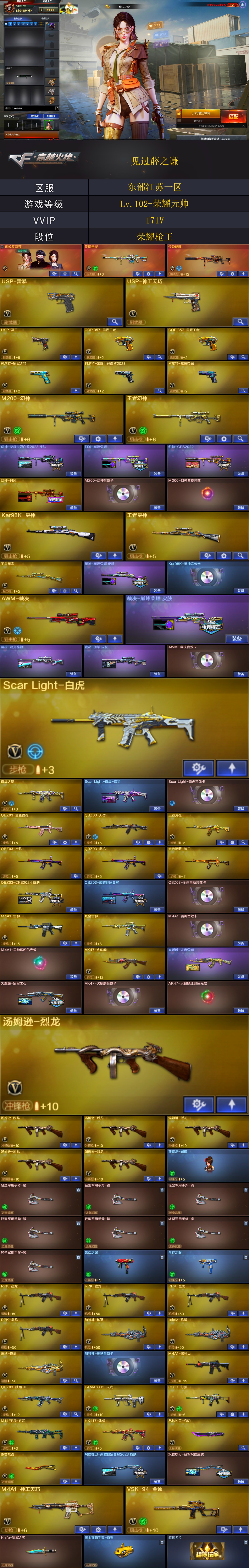 【商品标题】:东部江苏一区-171V-可二次实名-【Lv.102-荣耀元帅】-【段位:荣耀枪王】 【稀有武器】:传说圣灵/传说幽瞳/M200-幻神/Kar98K-星神/VSK-94-金蚀/G36C-幻影/ScarLight-白虎/M14EBR-玄武/HK417-朱雀/QBZ03-天罚/M4A1-神工天巧/USP-雷暴/柯尔特-竞技荣光/USP-神工天巧/天神-动感闪耀/柯尔特-荣耀世冠白鲨2023/修罗-古蛇迷踪/COP357-雷霆王者-觉醒版(2)/柯尔特-冠军之特/金色蔷薇-古蛇迷踪/QBZ03-金色蔷薇/AK47-火麒麟(2)/M4A1-黑龙/M4A1-雷神(2)/M4A1-黑骑士/AK47-无影(2)/AK47-黑武士/Barrett-毁灭(5)/Barrett-极光/AWM-裁决/RPK-盘龙(4)/加特林-炼狱(2)/汤姆逊-烈龙(6)/AA-12-雷霆/炽芒蝶刃/斩神刀-雷暴(2)/马来剑-夜魔/幻灵之锋 【王者武器】:白虎之魄-觉醒版/王者芳薇-觉醒版/王者之光-觉醒版/王者幻神-觉醒版/王者星神-觉醒版/王者之光/王者之力/王者星霆 【热门角色】:传说艾莉莎/鹰/堕落女神/奇洋探员/乔伊教练/蛇隐宗/王者-零/王者潘多拉/潘多拉 【热门音效卡】:M200-幻神音效卡/Kar98K-星神音效卡/AWM-裁决音效卡/Scar Light-白虎音效卡/QBZ03-金色蔷薇音效卡/加特林-炼狱音效卡/QBZ03-天罚音效卡/M4A1-雷神音效卡/Barrett-毁灭音效卡(2)/M4A1-黑骑士音效卡/AK47-火麒麟音效卡 【热门皮肤】:幻神-荣耀世冠白鲨2023皮肤/幻神-巅峰荣耀/幻神-CFS2022/幻神-丹凤/裁决-巅峰荣耀皮肤/QBZ03-CFS2024皮肤/屠龙-星耀皮肤/裁决-羽掣皮肤/擎天-冠军之击/星神-巅峰荣耀 皮肤/裁决-流光秘银/火麒麟-大唐荣光/QBZ03-荣耀世冠白鲨/ScarLight-白虎-暗星/炽芒蝶刃-荣耀世冠白鲨2023皮肤/火麒麟-冠军之心/毁灭-冠军之怒/屠龙-荣耀之锋/毁灭-荣耀之怒/龙啸-冠军之啸/毁灭-CFS2020/炽芒蝶刃-冠军炽芒皮肤 【其他亮点】:斯泰尔-蝴蝶/Knife-冠军之刃/贝雷塔687-射手座/黄金猫猫手套-白鲨/金刚伞-电玩红兔/烟雾弹-荣耀世冠白鲨2023(2)/超核名片 (截图展示段位不代表实际段位,如赛季更新等不可抗拒因素发生变化,其余道具看截图或咨询客服);USP-雷暴,柯尔特-荣耀世冠白鲨2023,柯尔特-冠军之特,炽芒蝶刃,Knife-冠军之刃,传说艾莉莎,RPK-盘龙,