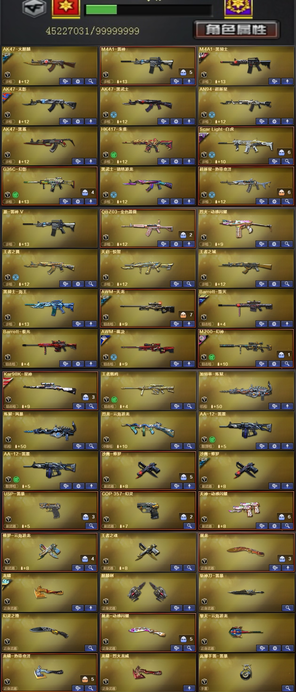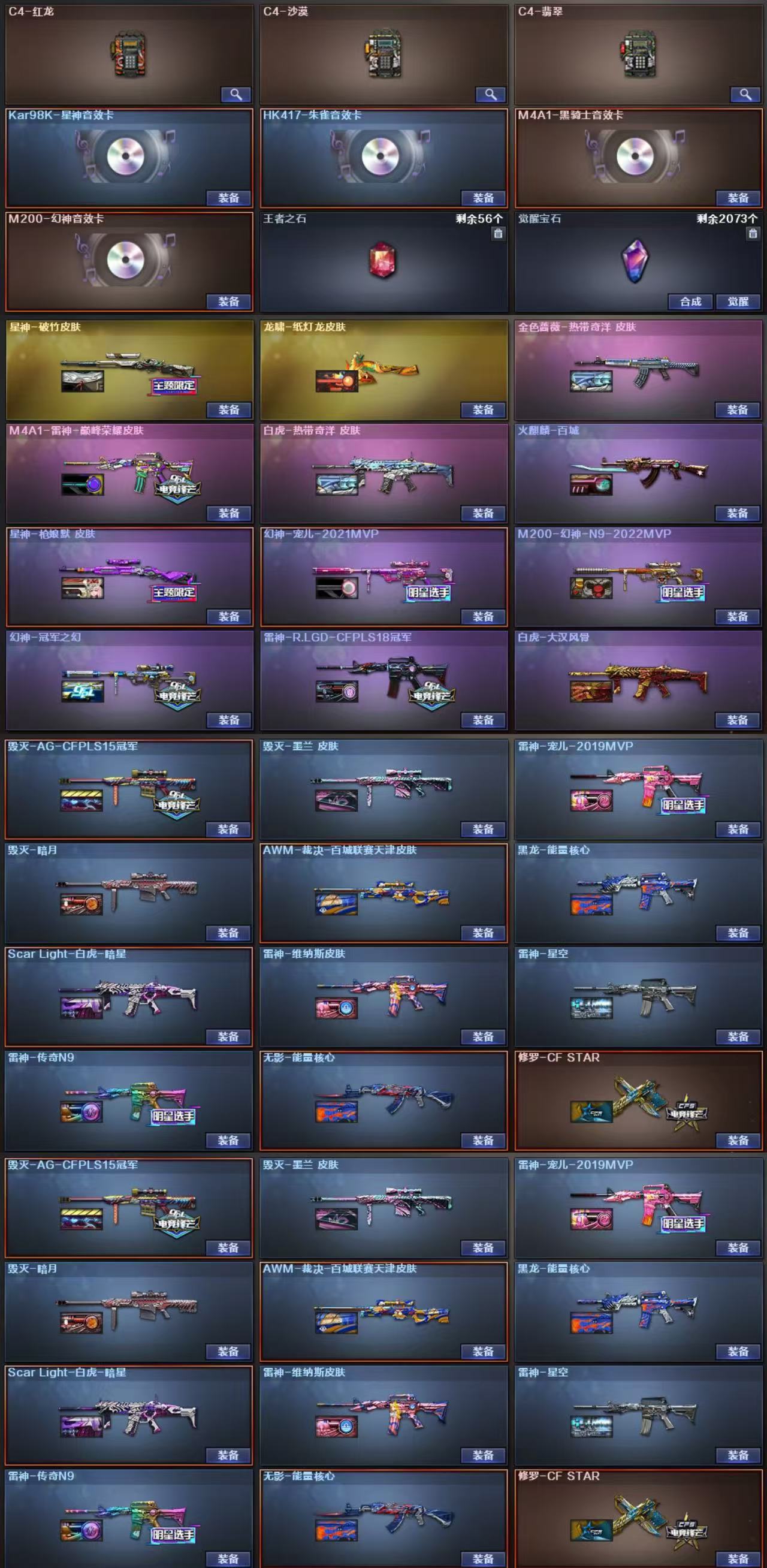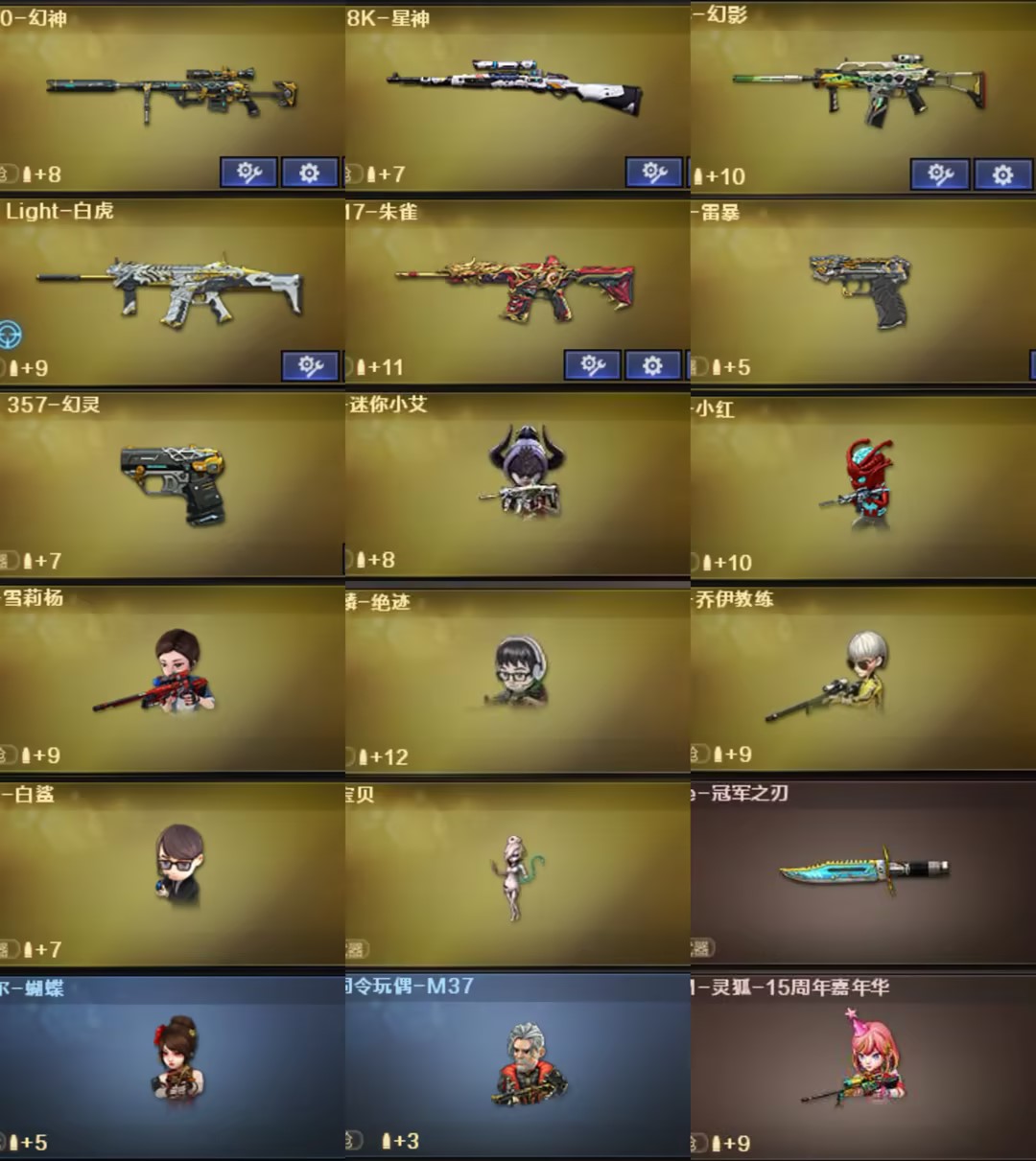 80v 二字ID G36C-幻影✨幻神-宠儿.N9.冠军之幻+音效✨星神-枪娘默.破竹+音效✨白虎-热带.大汉.暗星✨蔷薇-热带海洋✨USP-雷暴+COP幻灵✨冠军之刃✨朱雀+音效✨斯泰尔-蝴蝶/毁灭-AG.墨兰/雷神-宠儿.N9.巅峰.维纳斯.R.LGD冠军/火麒麟-STAR.百城/黑骑士-AG冠军+音效/裁决-百城/修罗-STAR/龙啸-冠军/岚兮儿/关小雨/奇洋探员/乔伊教练/王者-魅影.潘多拉.涂鸦/云海玲珑/暗夜审判/幽/樱-战斗天使等;USP-雷暴,Knife-冠军之刃,QBZ03-金色蔷薇,G36C-幻影,M200-幻神,Scar Light-白虎,Kar98K-星神,