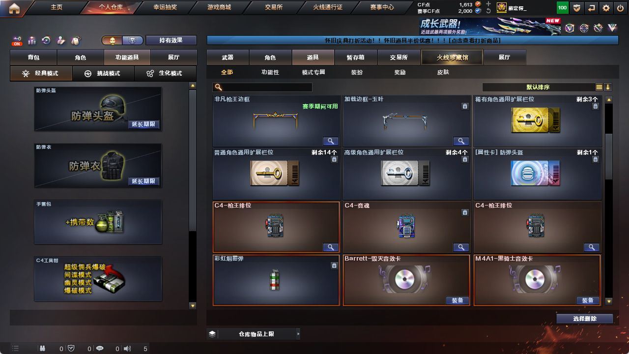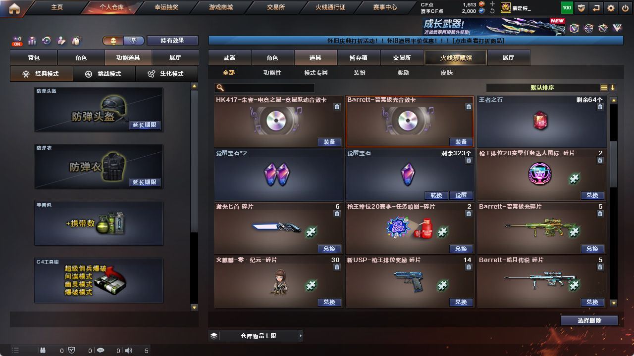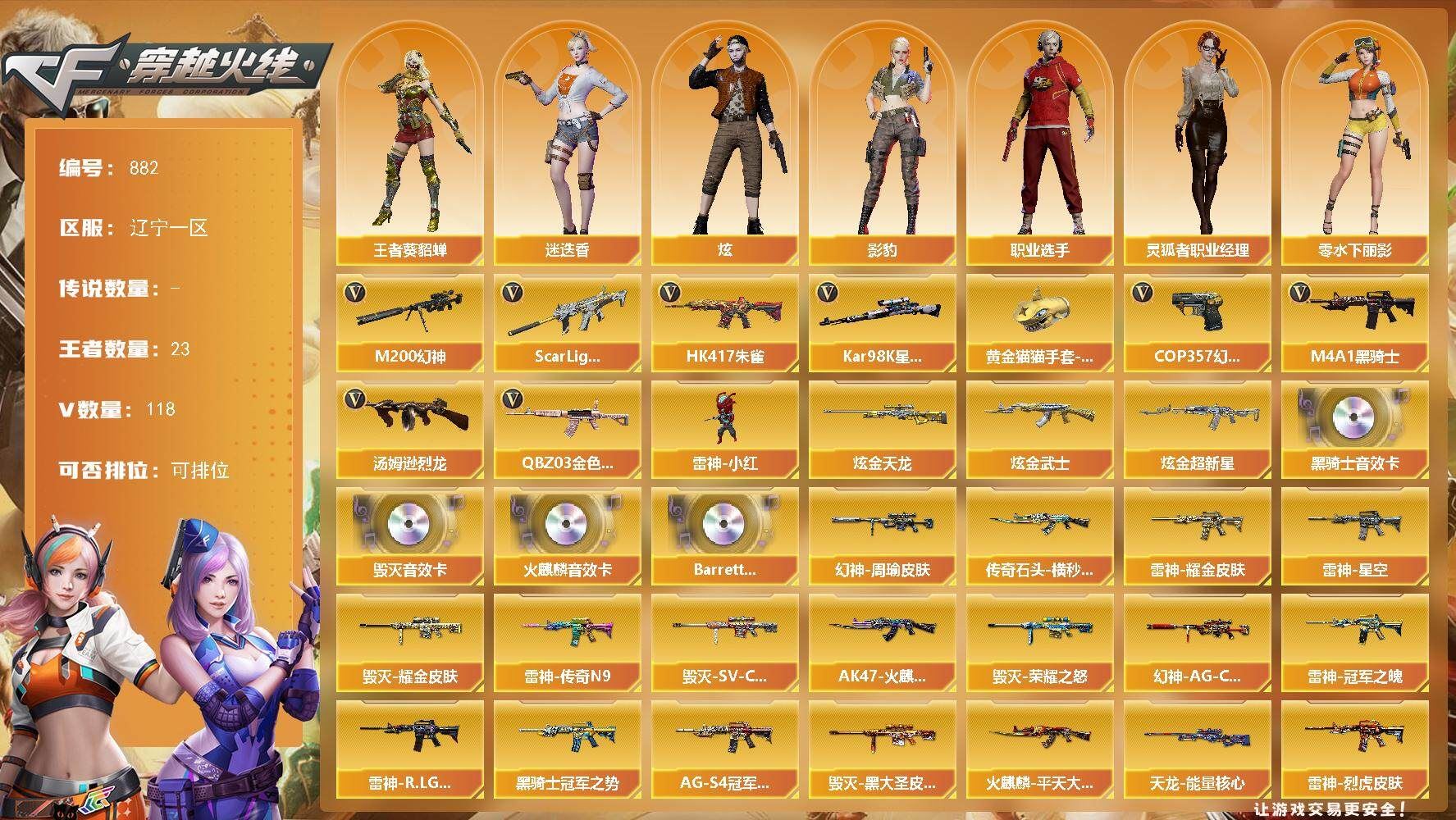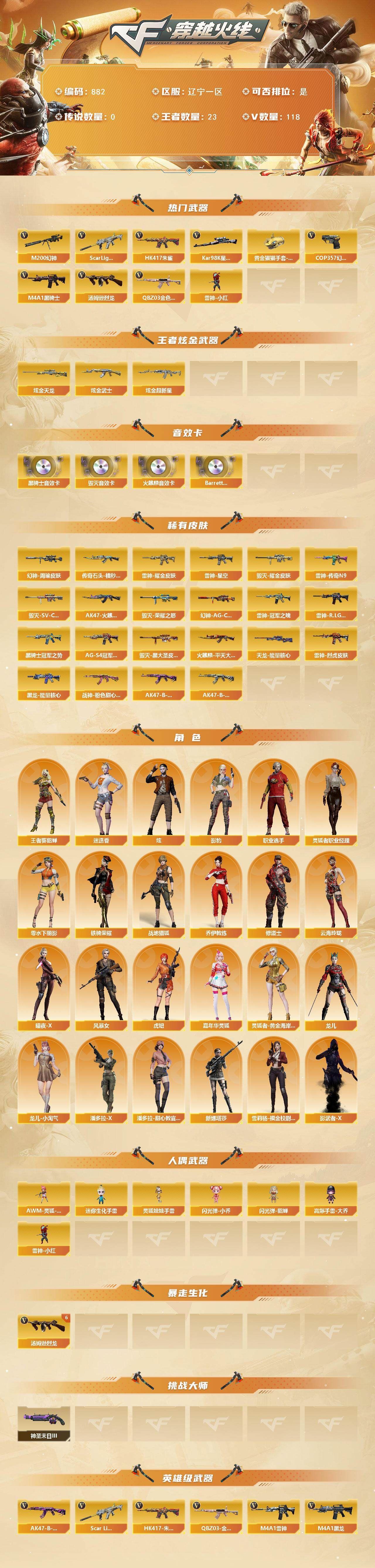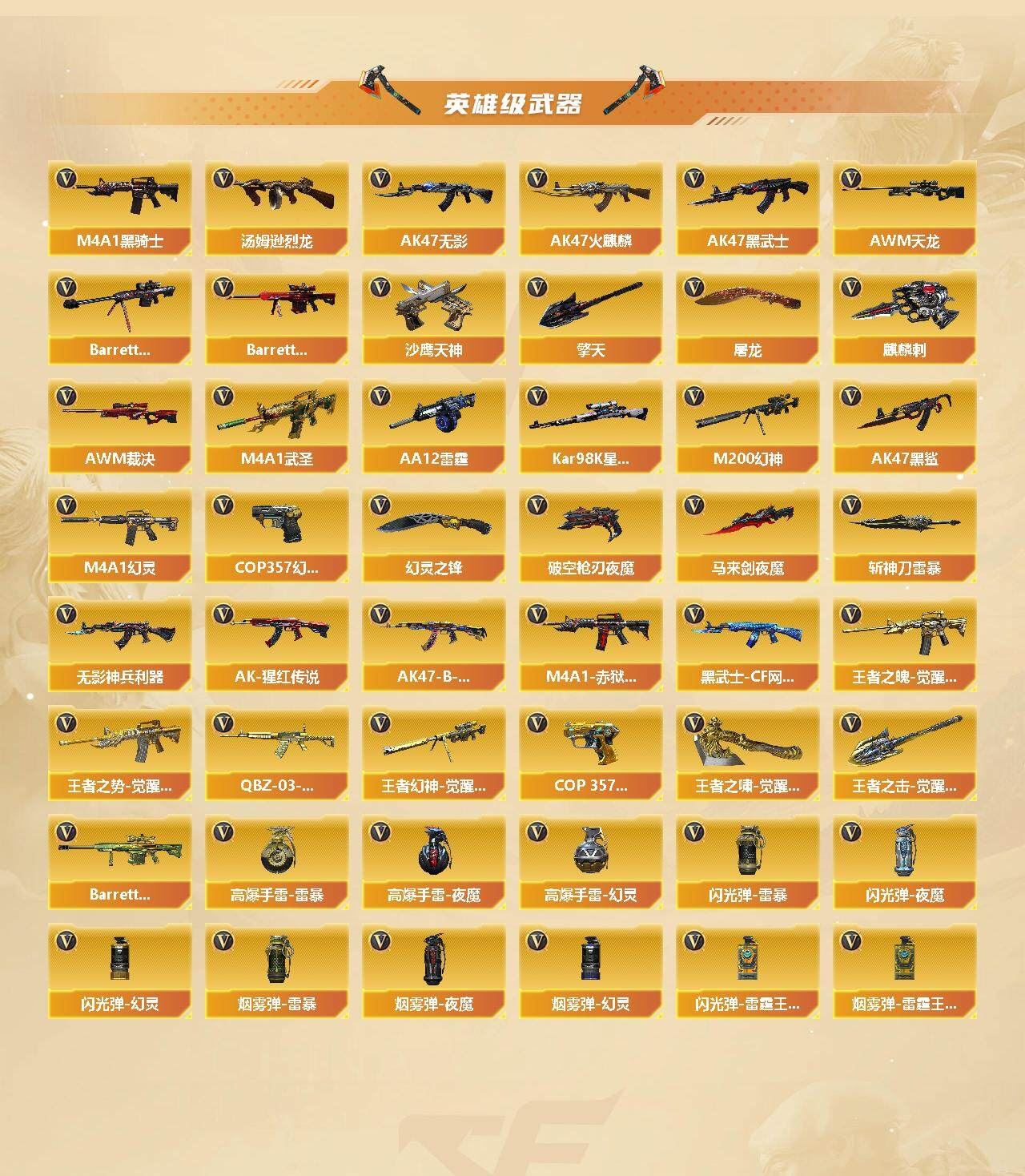 【热门武器】:QBZ03-金色蔷薇,Scar Light-白虎,HK417-朱雀,M200-幻神,Kar98K-星神,M4A1-黑骑士,汤姆逊-烈龙*6,雷神-小红,COP 357-幻灵*2,黄金猫猫手套-白鲨【王者炫金武器】:炫金武士,炫金超新星,炫金天龙【音效卡】:AK47-火麒麟音效卡,M4A1-黑骑士音效卡,Barrett-毁灭音效卡,Barrett-碧霄极光音效卡*3【皮肤】:幻神-周瑜皮肤,幻神-AG-CFPLS17冠军,雷神-星空,雷神-耀金皮肤,雷神-冠军之魄,雷神-传奇N9,雷神-R.LGD-CFPLS18冠军,雷神-烈虎皮肤,AK47-火麒麟-传奇EVEN,传奇石头-横秒之巅,火麒麟-平天大圣,毁灭-荣耀之怒,毁灭耀金皮肤,毁灭-SV-CFPLS16冠军,毁灭-黑大圣皮肤,黑龙-能量核心,黑骑士-冠军之势,黑骑士-AG-S4冠军典藏,战神-粉色甜心皮肤,AK47-B-常胜将军-曹操*2,AK47-B-常胜将军-刘备*2,天龙-能量核心【角色】:炫,迷迭香,影豹,战地猎狐,王者-葵-貂蝉,乔伊教练,修道士,云海玲珑,暗夜-X,风暴女*2,虎妞,嘉年华灵狐,零-水下丽影,灵狐者-黄金海岸,灵狐者-职业经理,龙儿,龙儿-小淘气,潘多拉-X,潘多拉-甜心教官,铁骑荣耀,新娜塔莎,雪莉杨-摸金校尉,影武者-X,职业选手【人偶武器】:雷神-小红,AWM-灵狐-15周年嘉年华,迷你生化手雷,闪光弹-小乔,闪光弹-貂蝉,高爆手雷-大乔,灵狐娃娃手雷【挑战大师】:神圣爆裂者-末日III【英雄级武器】:AK47-火麒麟,M4A1-黑龙*2,M4A1-雷神,M4A1-黑骑士,AK47-无影,AK47-黑武士,M4A1-武圣*2,AK47-黑鲨*2,HK417-朱雀,Scar Light-白虎,M4A1-幻灵,无影-神兵利器,QBZ03-金色蔷薇,王者之魄-觉醒版,王者之势-觉醒版,AK-47-猩红传说*2,AK47-B-战神,AK47-B-常胜将军,QBZ-03-王者蔷薇-觉醒版,黑武士-CF网剧冠军,AWM-天龙,Barrett-毁灭*2,Barrett-极光,AWM-裁决,M200-幻神,Kar98K-星神,王者幻神-觉醒版,汤姆逊-烈龙*6,AA-12-雷霆,沙鹰-天神*2,COP 357-雷霆王者-觉醒版*2,COP 357-幻灵*2,破空枪刃-夜魔*2,屠龙*3,马来剑-夜魔,擎天,麒麟刺,幻灵之锋*3,斩神刀-雷暴,王者之啸-觉醒版,王者之击-觉醒版,高爆手雷-雷暴,高爆手雷-夜魔*3,高爆手雷-幻灵*9,闪光弹-雷暴,闪光弹-夜魔*3,闪光弹-幻灵*8,闪光弹-雷霆王者-觉醒版*3,烟雾弹-雷暴,烟雾弹-夜魔*3,烟雾弹-幻灵*10,烟雾弹-雷霆王者-觉醒版*3,M4A1-赤狱骑士,Barrett-碧霄极光【道具】:BS战队炫彩背包,EP战队炫彩背包,KZ战队炫彩背包,Q9战队炫彩背包,XROCK炫彩背包,亚洲杯纪念炫彩背包,战舰背包,炫彩背包,老虎背包,超级背包,女皇终结者-魔龙之吻,救世主-黑桃战神,绿色巨人,灵魂忍者,变异宝贝,迷雾幽灵*2,生化弹匣,夺命之镰,防化服*3,金色流光-枪王排位*2,星辰流光-枪王排位,巅峰赛先锋-金色流光,流光-鎏金之域,流光-再燃火线,枪王排位28赛季金色流光,斯沃特表情,防弹头盔*6,防弹衣*5,C4工具钳*4,手雷包*4【特殊枪械】:1白虎,1黑骑士,6烈龙;QBZ03-金色蔷薇,M200-幻神,Scar Light-白虎,Kar98K-星神,