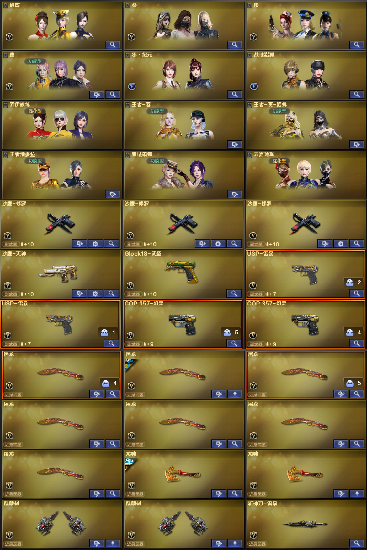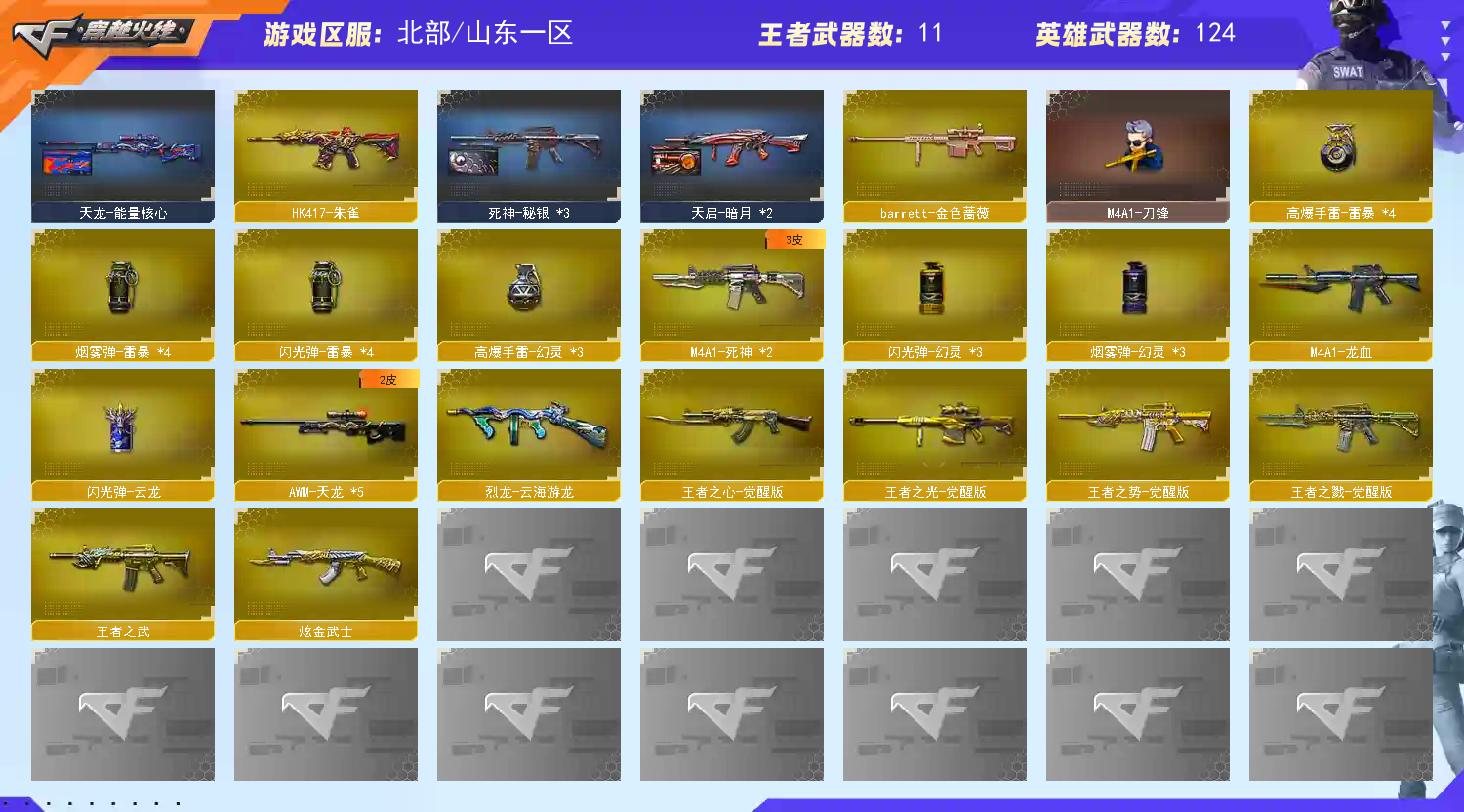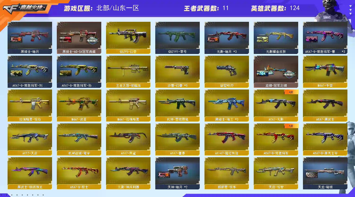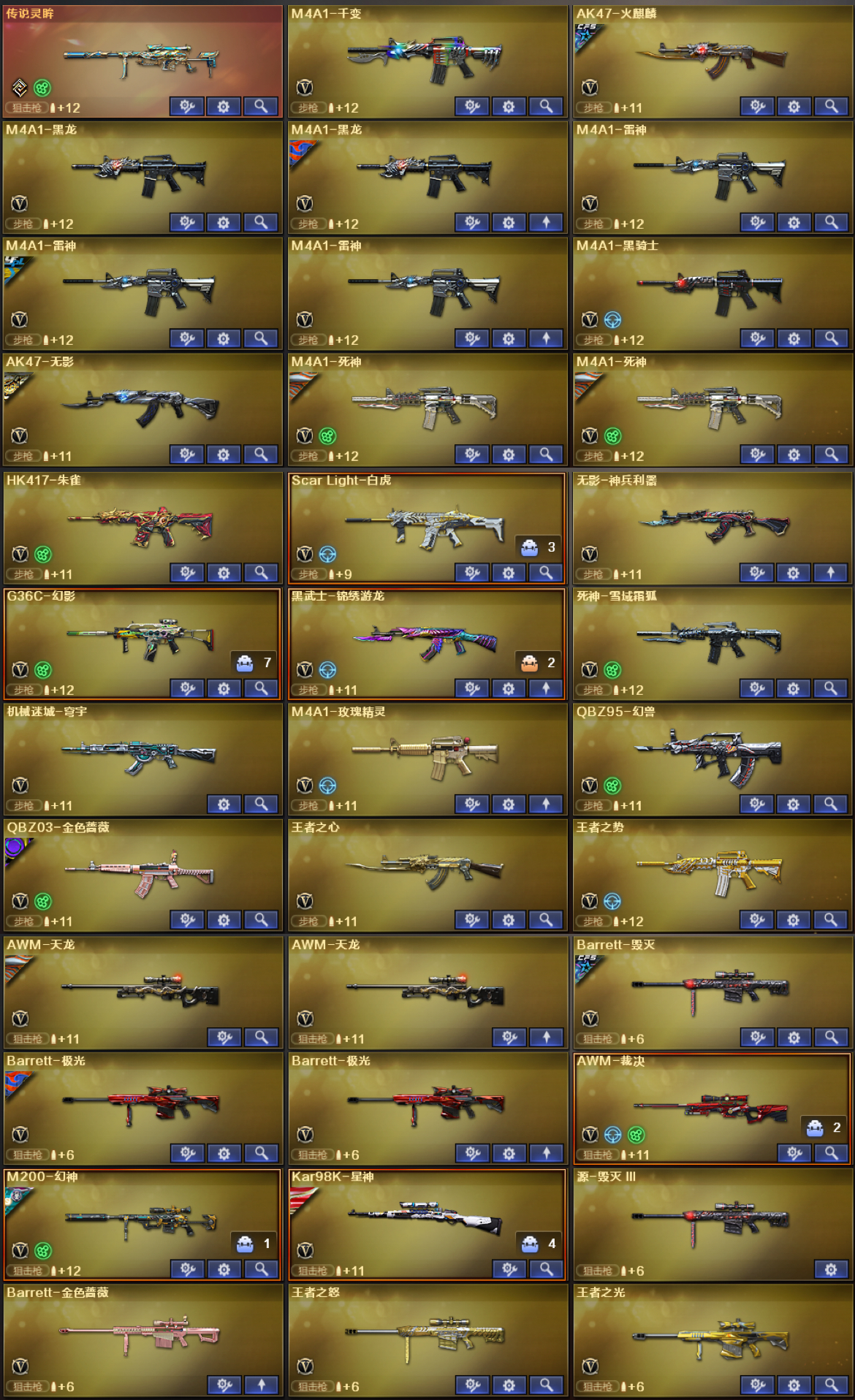 老板玩的开心;USP-雷暴,Knife-冠军之刃,QBZ03-金色蔷薇,G36C-幻影,M200-幻神,Scar Light-白虎,传说灵眸,