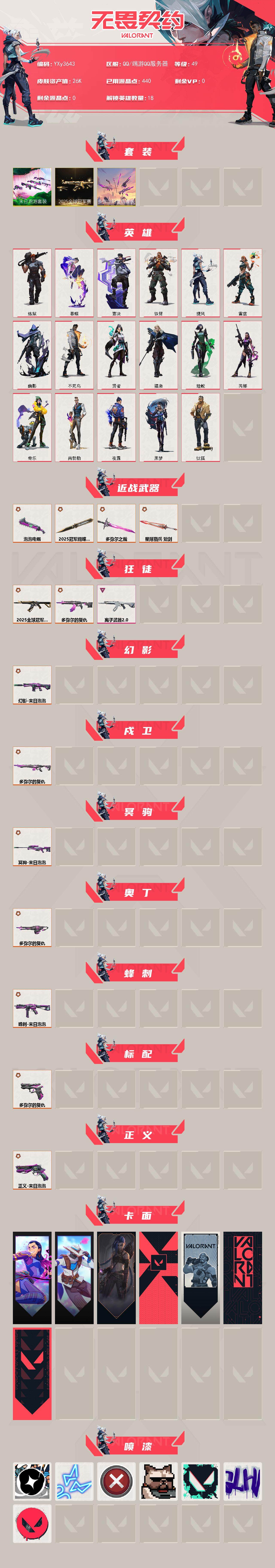 冻结三分钟内解除,短信通知重新上即可!喜欢收藏不迷路、游戏异常进小黑屋、时间不够请提前续租或者不要开局 【套装】:2025全球冠军赛套装,多弥尔的复仇套装,末日泡泡套装 【英雄】:炼狱,暮蝶,钛狐,壹决,铁臂,捷风,雷兹,幽影,不死鸟,贤者,猎枭,蝰蛇,芮娜,奇乐,尚勃勒,夜露,黑梦 【近战武器】:近战武器-2025全球冠军赛 蝴蝶刀,近战武器-多弥尔之裁,近战武器-泡泡电锯,近战武器-星际猎兵 短剑 【狂徒】:狂徒-2025全球冠军赛,狂徒-多弥尔的复仇,狂徒-离子武器//2.0 【幻影】:幻影-末日泡泡 【戍卫】:戍卫-多弥尔的复仇 【冥驹】:冥驹-末日泡泡 【奥丁】:奥丁-多弥尔的复仇 【蜂刺】:蜂刺-末日泡泡 【标配】:标配-多弥尔的复仇 【正义】:正义-末日泡泡 【卡面】:无畏契约GO!一卷:芮娜 卡面,无畏契约GO!一卷:零 卡面,《双城之战》金克丝 卡面,代号红色 卡面,新兵报到 卡面,V契约 卡面,无畏契约 卡面 【喷漆】:别挡我吃球! 喷漆,霓光四射 喷漆,买装还是存钱 喷漆,关门放狗 喷漆,胜利属于无畏契约 喷漆,GLHF 喷漆,无畏契约 喷漆 【挂饰】:无畏契约GO!一卷 零 挂饰,天外飞客 挂饰,无畏契约 纪念币 挂饰;离子武器//2.0 狂徒,