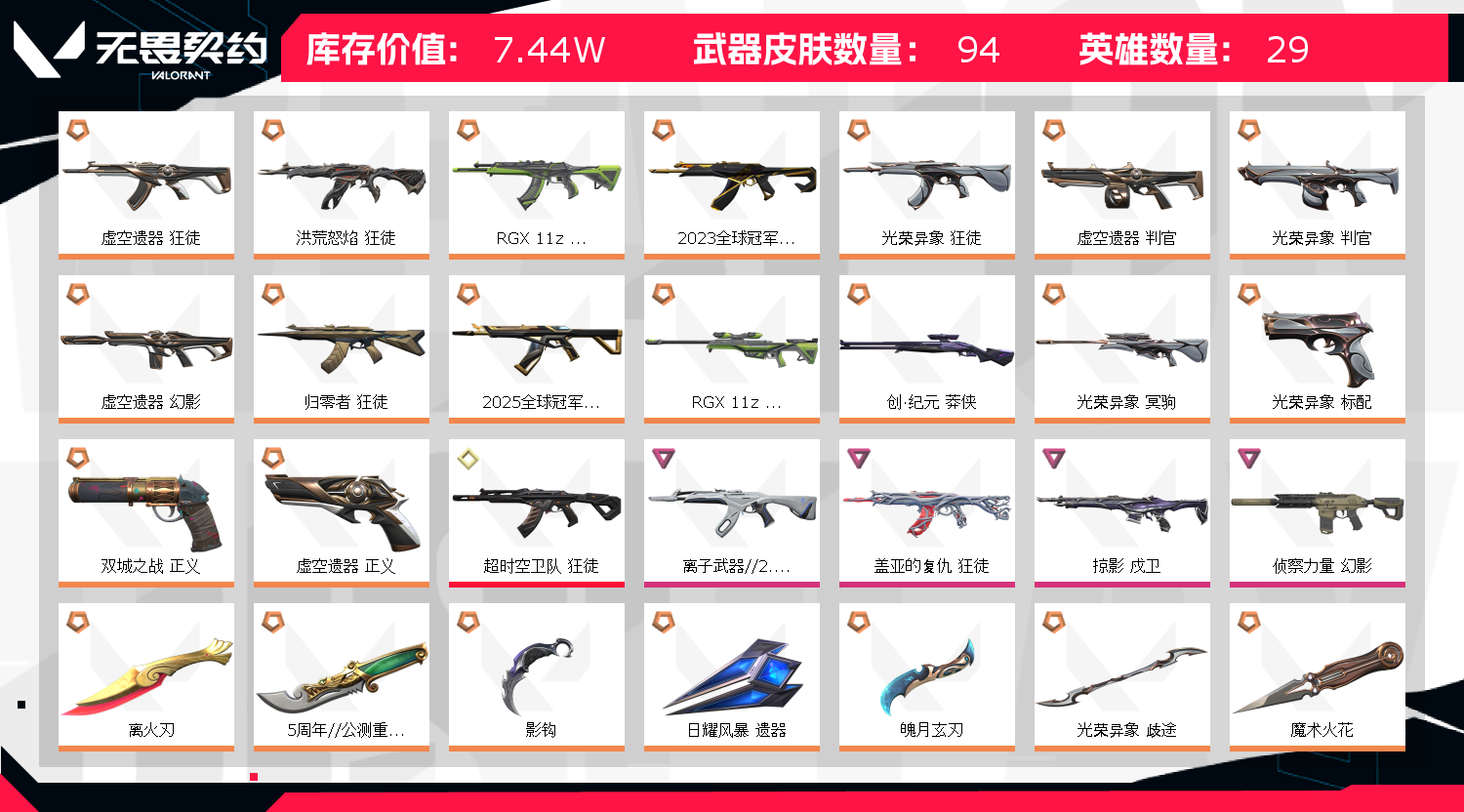 首页 > 租号大厅 > 无畏契约-wegame > wegame/wegame > 7.4w库存 允许排位 离火刃 冠军套 青龙刀 掠夺爪 t0很多质量高 英雄28 武器皮肤数量93