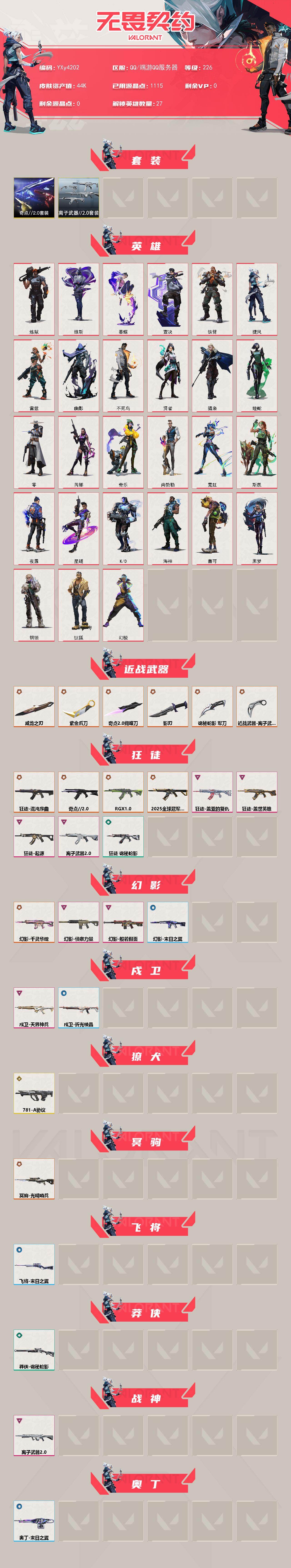 冻结三分钟内解除,短信通知重新上即可!喜欢收藏不迷路、游戏异常进小黑屋、时间不够请提前续租或者不要开局 【套装】:奇点//2.0套装,离子武器//2.0套装 【英雄】:幻棱,炼狱,维斯,暮蝶,钛狐,壹决,铁臂,捷风,雷兹,幽影,不死鸟,贤者,猎枭,蝰蛇,零,芮娜,奇乐,尚勃勒,霓虹,斯凯,夜露,星礈,K/O,海神,盖可,黑梦,钢锁 【近战武器】:近战武器-奇点//2.0 蝴蝶刀,近战武器-紫金爪刀,近战武器-威龙之刃,近战武器-离子武器//2.0 爪刀,近战武器-影刃,近战武器-诡秘蛇影 军刀 【狂徒】:狂徒-2025全球冠军赛,狂徒-混沌序曲,狂徒-奇点//2.0,狂徒-RGX 11z Pro,狂徒-盖世英雄,狂徒-盖亚的复仇,狂徒-起源,狂徒-离子武器//2.0,狂徒-诡秘蛇影 【幻影】:幻影-千灵华绽,幻影-般若假面,幻影-侦察力量,幻影-末日之翼 【戍卫】:戍卫-天界神兵,戍卫-折光棱晶 【獠犬】:獠犬-781-A协议 【冥驹】:冥驹-光明哨兵 【飞将】:飞将-末日之翼 【莽侠】:莽侠-诡秘蛇影 【战神】:战神-离子武器//2.0 【奥丁】:奥丁-末日之翼 【判官】:判官-诡秘蛇影 【骇灵】:骇灵-离子武器//2.0 【蜂刺】:蜂刺-折光棱晶 【标配】:标配-超能偶像,标配-最终庇护,标配-折光棱晶 【VCT手枪】:标配-VCT25 x LEV 【正义】:正义-千灵华绽,正义-超限闪存,正义-沙尘幻旅,正义-复古浪潮,正义-纳米击 【鬼魅】:鬼魅-奇点//2.0,鬼魅-流星兵团,鬼魅-诡秘蛇影,鬼魅-光导纤维,鬼魅-扑棱扑棱,鬼魅-宿怨,鬼魅-星云暗涌 【狂怒】:狂怒-离子武器//2.0 【短炮】:短炮-弧光异彩,短炮-梦魇恶魔,短炮-末日之翼 【卡面】:终章:激斗汉堡 卡面,进入射程 卡面,《双城之战》拥抱 卡面,精灵大战 卡面,欢迎来到底城 卡面,南瓜盛典 卡面,无畏契约:暮蝶 卡面,奇点//2.0 卡面,修车达人 卡面,正义的化身 卡面,终章:生意人麦宝 卡面,铁之华 卡面,时间到 卡面,最高舞台 卡面,音熊登场 卡面,声感陷阱设计图 卡面,红鳞松叶 卡面,梦幻奶茶 卡面,终章:打造专属狂徒 卡面,趁热吃 卡面,源能反应 卡面,零点嗅探设计图 卡面,表象之下 卡面,沙雕爆能器 卡面,无畏契约GO!一卷:芮娜 卡面,清除名单 卡面,无畏契约GO!一卷:零 卡面,终章:同步耍酷 卡面,龍记 卡面,化茧成蝶 卡面,完美调谐 卡面 ,暗枪 卡面,终章:黑影先生的咖啡! 卡面,铁臂vs雷兹 卡面,夯实根基 卡面,"Luie" 卡面,热烈欢迎 卡面,铁臂设计图 卡面,代号红色 卡面,冰淇淋店 卡面,新兵报到 卡面,友军火力 卡面,V契约 卡面,无畏契约 卡面,暗潮 卡面 【喷漆】:嗨宝南瓜灯 喷漆,嘭! 喷漆,都算到了 喷漆,控场勿近 喷漆,伤心心 喷漆,小丑猫 喷漆,奇点//2.0 喷漆,熊抱 喷漆,超级粉丝 喷漆,捷风差距 喷漆,惊声尖叫 喷漆,战术熊的巴拉莱卡琴 喷漆,拼一枪 喷漆,我觉得不行 喷漆,致命优雅 喷漆,我的刀呢? 喷漆,UWU 喷漆,新潮流 喷漆,双击点赞 喷漆,买装还是存钱 喷漆,醒狮贺春 喷漆,旅行小熊 喷漆,蕊形灯 喷漆,凌空惊吓 喷漆,老铁困了 喷漆,口袋贤者 喷漆,胜利属于无畏契约 喷漆,GLHF 喷漆,无畏契约 喷漆 【挂饰】:终章:猫猫木乃伊 挂饰,悠闲鸡块 挂饰,伞绳 挂饰,《双城之战》小蛋糕 挂饰,第九季//第三幕 纪念币 挂饰,工具腰带 挂饰,无畏契约GO!一卷 芮娜 挂饰,无畏契约GO!一卷 零 挂饰,奇点//2.0 挂饰,鱼骨头 挂饰,熔岩灯 挂饰,第九季//第二幕 纪念币 挂饰,薰衣草之心 挂饰,终章:这瓜保熟 挂饰,糖葫芦 挂饰,袖珍捷风 挂饰,丢麦 挂饰,迷你浓缩 挂饰,尤克里里 挂饰,Z世代特饮 挂饰,第九季//一幕 纪念币 挂饰,终章:迷你机甲 挂饰,战术河童 挂饰,改变者全球冠军赛奖杯 挂饰,荧光棒 挂饰,第八季//第三幕 纪念币 挂饰,终章:扭结饼干 挂饰 ,瓶中信 挂饰,传世莲华 挂饰,第八季//第二幕 纪念币 挂饰 ,天外飞客 挂饰,好运福爪 挂饰,终章:晒出笑 挂饰,红鳞松叶 挂饰,酷闪轮滑 挂饰,瞄这里 挂饰,第八季//一幕 纪念币 挂饰,终章:高音谱号 挂饰,彩糖面包 挂饰,冬日絮语 挂饰,海豹的认可 挂饰,第七季//第三幕 纪念币 挂饰,幸运中国结 挂饰,第七季//第二幕 纪念币 挂饰,无畏契约 纪念币 挂饰;紫金爪刀,威龙之刃,盖亚的复仇 狂徒,侦察力量 幻影,RGX 11z Pro 狂徒,天界神兵 戍卫,混沌序曲 狂徒,