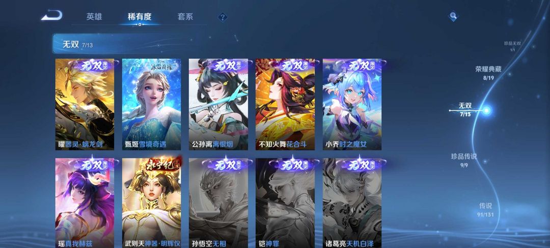 v10、12典藏520皮、马超无双飞将、韩信典藏、马可深海之熄、瑶珍品传说大耳狗之梦、青丘·九尾、枫霜尽、绯月行、前尘镜、至尊宝、天魔缭乱