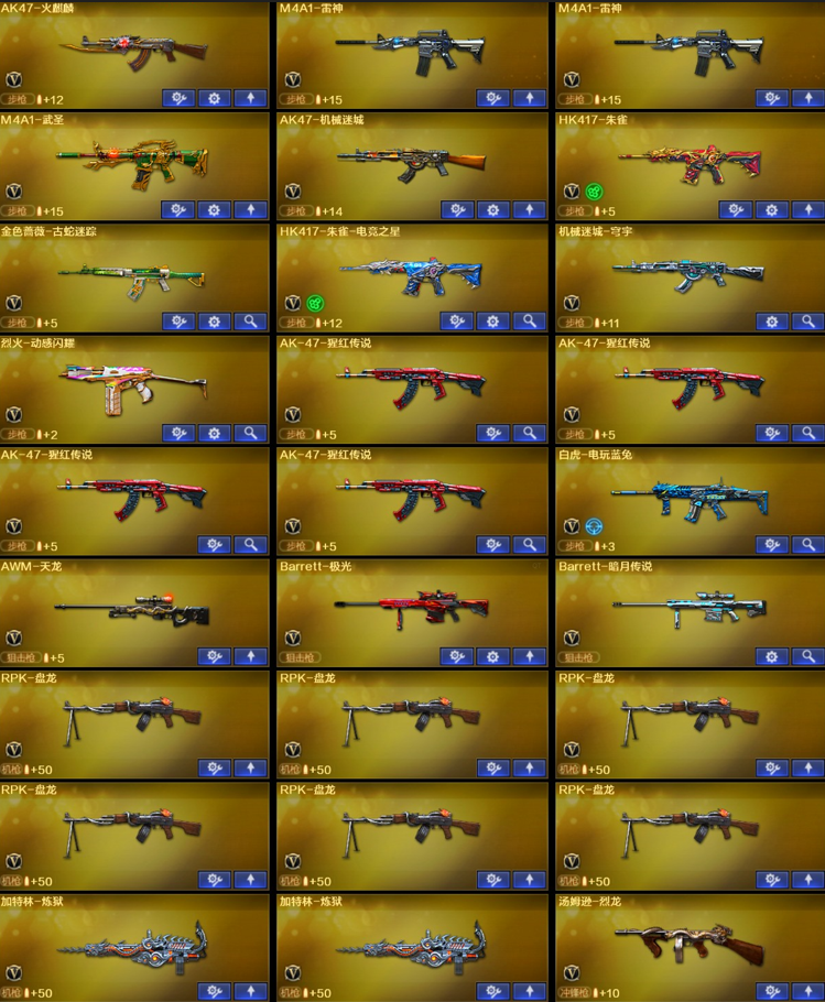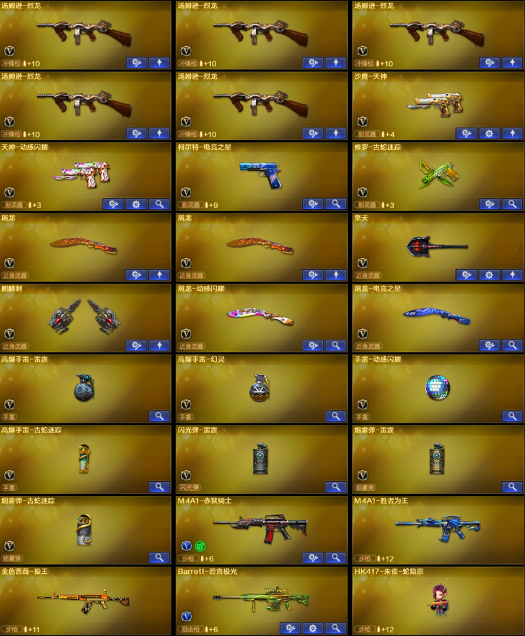 【稀有武器】:HK417-朱雀/天神-动感闪耀/修罗-古蛇迷踪/金色蔷薇-古蛇迷踪/AK47-火麒麟/M4A1-雷神(2)/白虎-电玩蓝兔/Barrett-极光/RPK-盘龙(6)/加特林-炼狱(2)/汤姆逊-烈龙(6) 【热门角色】:沙漠玫瑰/奇洋探员/乔伊教练/蛇隐宗/潘多拉-X 【其他亮点】:斯泰尔-蝴蝶/斯泰尔-枪娘暗刃;沙漠玫瑰,RPK-盘龙,