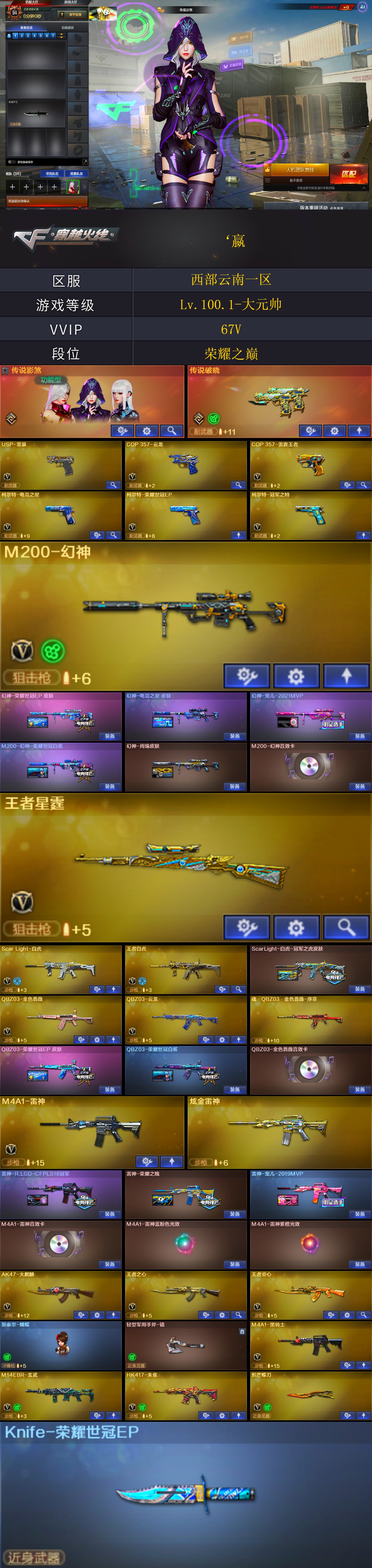 【商品标题】:西部云南一区-67V-可二次实名-【Lv.100.1-大元帅】-【段位:荣耀之巅】 【稀有武器】:传说破晓/M200-幻神/ScarLight-白虎/M14EBR-玄武/HK417-朱雀/USP-雷暴/COP357-云龙/COP357-雷霆王者-觉醒版/柯尔特-冠军之特/QBZ03-云龙/QBZ03-金色蔷薇(2)/AK47-火麒麟/M4A1-黑龙/M4A1-雷神/M4A1-黑骑士/Barrett-毁灭/炽芒蝶刃/斩神刀-雷暴(2)/幻灵之锋/云龙扇 【王者武器】:王者之心-觉醒版/王者白虎-觉醒版/M4A1-雷霆王者-觉醒版/王者星霆 【热门角色】:传说影煞/奇洋探员/王者影豹/灵狐者-职业经理/潘多拉-X/幽/潘多拉 【热门音效卡】:M200-幻神音效卡/QBZ03-金色蔷薇音效卡/M4A1-雷神音效卡/Barrett-毁灭音效卡/M4A1-黑骑士音效卡 【热门皮肤】:幻神-宠儿-2021MVP/M200-幻神-荣耀世冠白鲨/幻神-周瑜皮肤/屠龙-星火燎原(2)/雷神-R.LGD-CFPLS18冠军/QBZ03-荣耀世冠白鲨/毁灭-战神张飞/雷神-宠儿-2019MVP/ScarLight-白虎-冠军之虎皮肤/屠龙-荣耀之锋/毁灭-荣耀之怒/雷神-荣耀之魄 【其他亮点】:斯泰尔-蝴蝶/贝雷塔687-射手座 (截图展示段位不代表实际段位,如赛季更新等不可抗拒因素发生变化,其余道具看截图或咨询客服);USP-雷暴,柯尔特-冠军之特,炽芒蝶刃,传说影煞,QBZ03-金色蔷薇,M200-幻神,Scar Light-白虎,