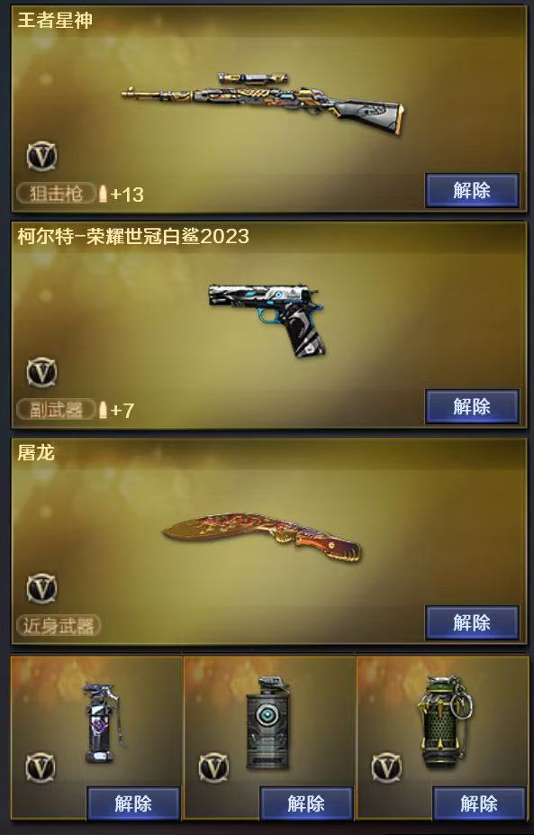 王者武器:王者星神-觉醒版;王者之力;王者之魄-觉醒版;王者之势-觉醒版;炫金雷神 英雄武器:Barrett-碧霄极光;高爆手雷-玄豹;机械迷城-穹宇;黑骑士-海王;柯尔特-荣耀世冠白鲨2023;AN94-超新星;M200-幻神;Scar Light-白虎;M4A1-雷神;AWM-裁决;烟雾弹-云龙;黑武士-锦绣游龙;无影-神兵利器;QBZ03-金色蔷薇;沙鹰-天神;擎天;汤姆逊-烈龙;AK47-雷暴;USP-雷暴;斩神刀-雷暴;高爆手雷-雷暴;烟雾弹-雷暴;闪光弹-雷暴;Barrett-毁灭;AK47-B-战神;AK47-B-战士;雷霆之锋;M4A1-雷霆;高爆手雷-雷霆;烟雾弹-雷霆;闪光弹-雷霆;屠龙;龙啸 角色:春;隼;猎狐者;飞虎队;刀锋;潘多拉;曼陀罗;幻影;雷霆-β;复仇者;堕天使;兰;G.E.M.邓紫棋;夜玫瑰;威锋;陈龙野;陈龙野-X;陈龙野-Y;新斯沃特-英特尔;猎狐者-英特尔;娜塔莎;救世主;精英部队;灵狐者;烈锋;零-水下丽影;兰-海滩派对;影武者-X;新娜塔莎;王者-救世主;龙儿;救世主-X;蜀雪;潜龙队-X;剑齿虎;暗夜-X;雪莉杨;青霞仙子;妲己;白狼-X