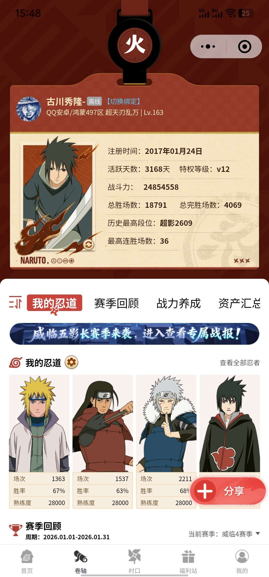 • 火影段位: 影级3阶