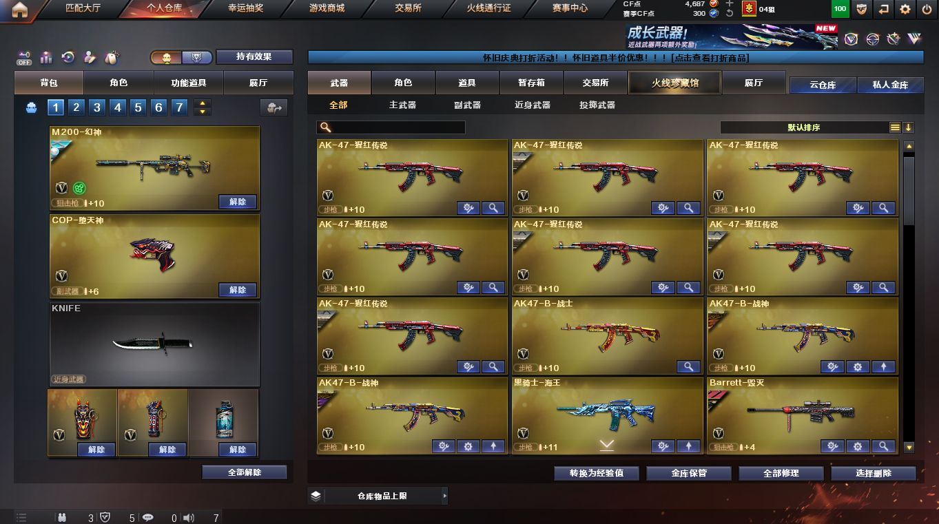 【M200-幻神+幻神-荣耀世冠白鲨2023皮肤+M200-幻神音效卡】【AWM-裁决】【COP-堕天神】【1盘龙】【1烈龙】【1炼狱】【M4A1-雷神+雷神-虎将+雷神-耀金皮肤+雷神-星空】【AK47-火麒麟+火麒麟-AG+火麒麟-平天大圣+火麒麟-冠军之心+AK47-火麒麟音效卡】【Barrett-毁灭+毁灭-战神张飞+Barrett-毁灭音效卡】【M4A1-黑骑士+黑骑士-海王】【魅影/迷迭香/战地猎狐/代号:翼/灵狐者-黄金海岸】【Barrett-极光/Barrett-暗月传说/王者之光-觉醒版/M4A1-堕天神/M4A1-龙血(2)/M4A1-玫瑰精灵/王者之势-觉醒版/AK-47-猩红传说(8)/AK47-B-战士/AK47-B-战神(2)+AK47-B-常胜将军-孙权+AK47-B-常胜将军-曹操/9A91-烈火(2)/沙鹰-修罗(2)+修罗-古蛇迷踪/麒麟刺+麒麟刺-堕天神/龙啸-堕天神(2)/擎天(2)/金色蔷薇-古蛇迷踪/唐刀-古蛇迷踪/王者之心(2)】【HK417-朱雀-蛇隐宗/巴雷特-零-水下丽影(2)/KAC锯式机枪-黑桃战神/迷你牛牛】【Barrett-极光-能量核心】【战神-流金岁月皮肤+战神-紫绶金章皮肤+战神-粉色甜心皮肤】【黄金幸运猪猪玩偶;RPK-盘龙,M200-幻神,