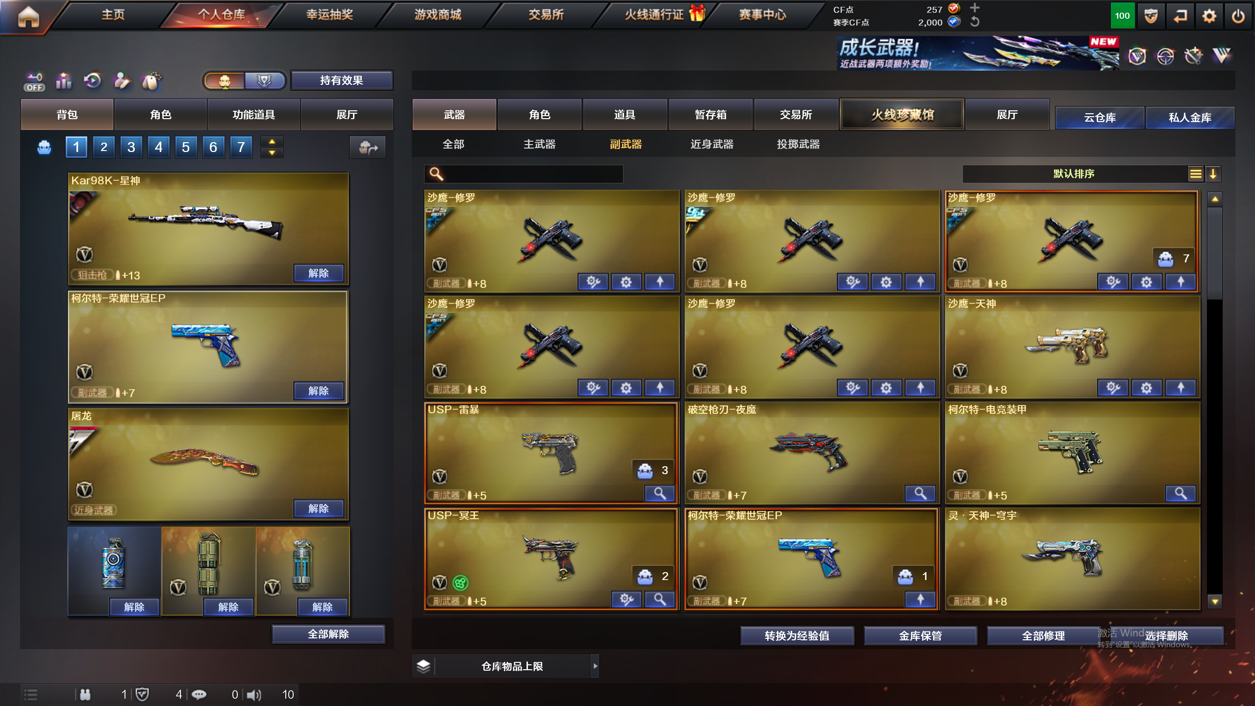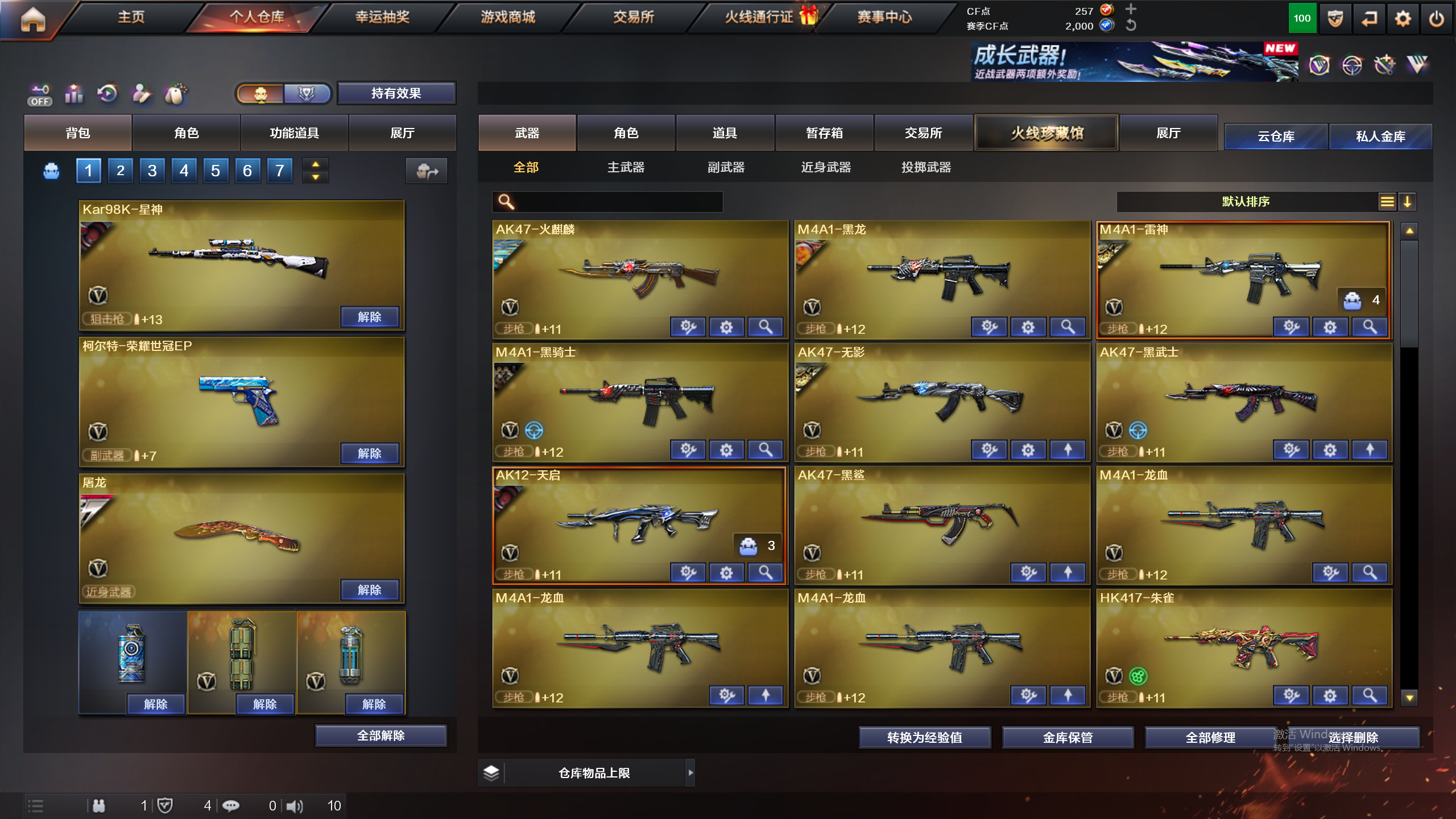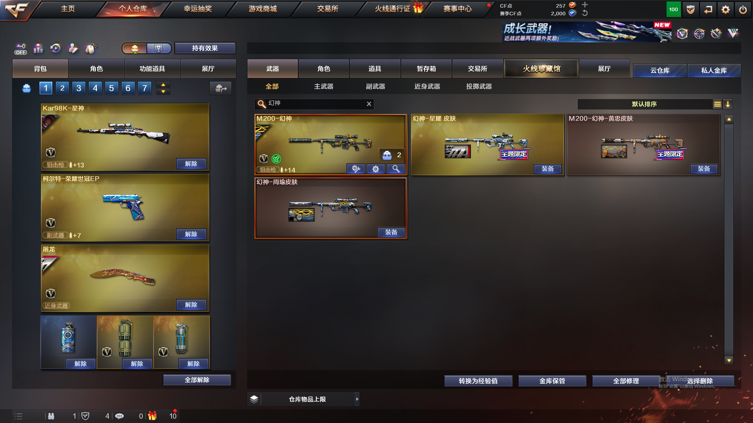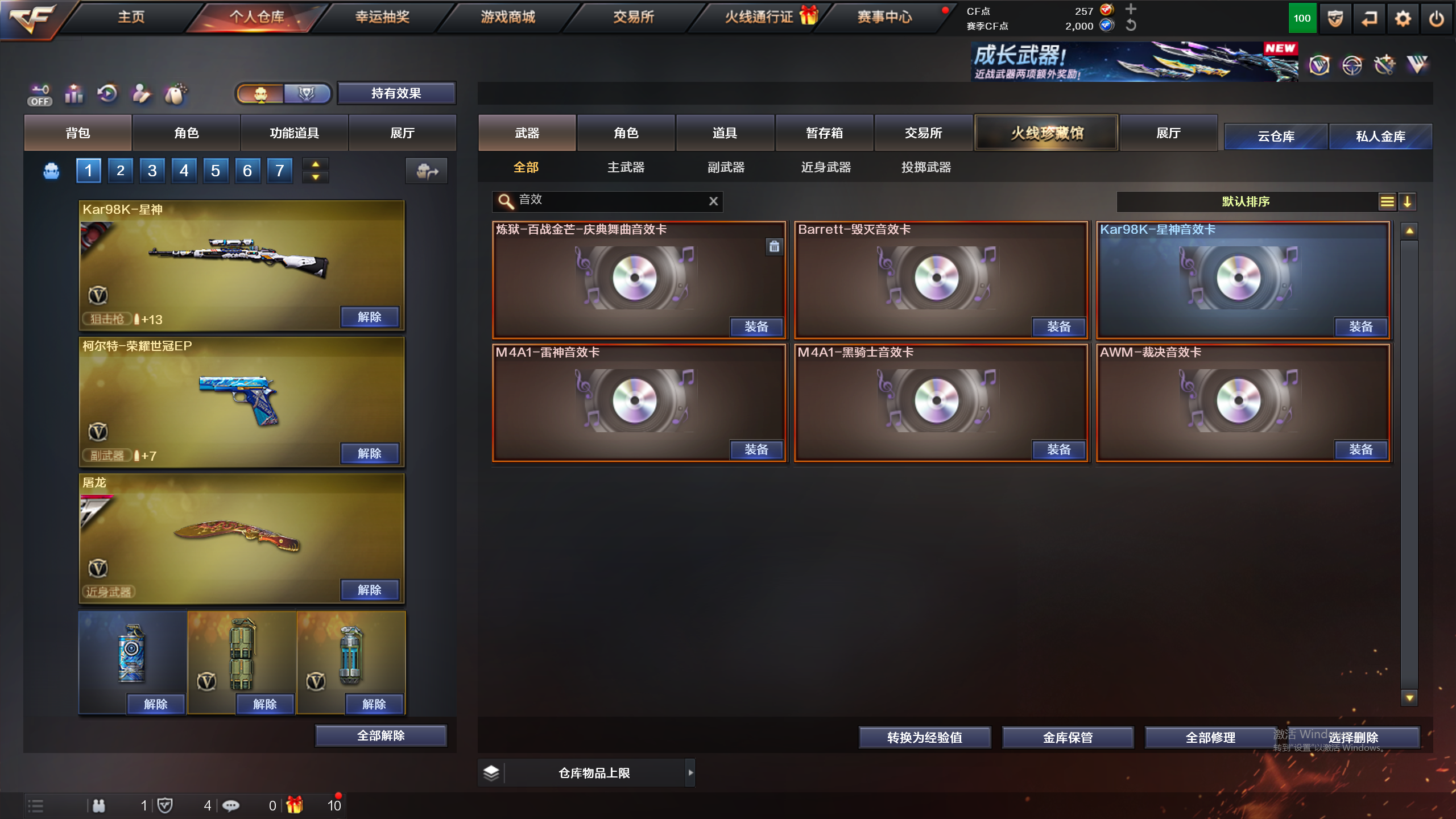 星神音效卡,裁决音效卡,柯尔特荣耀世冠EP,M200-幻神,荆棘;USP-雷暴,QBZ03-金色蔷薇,M200-幻神,Kar98K-星神,