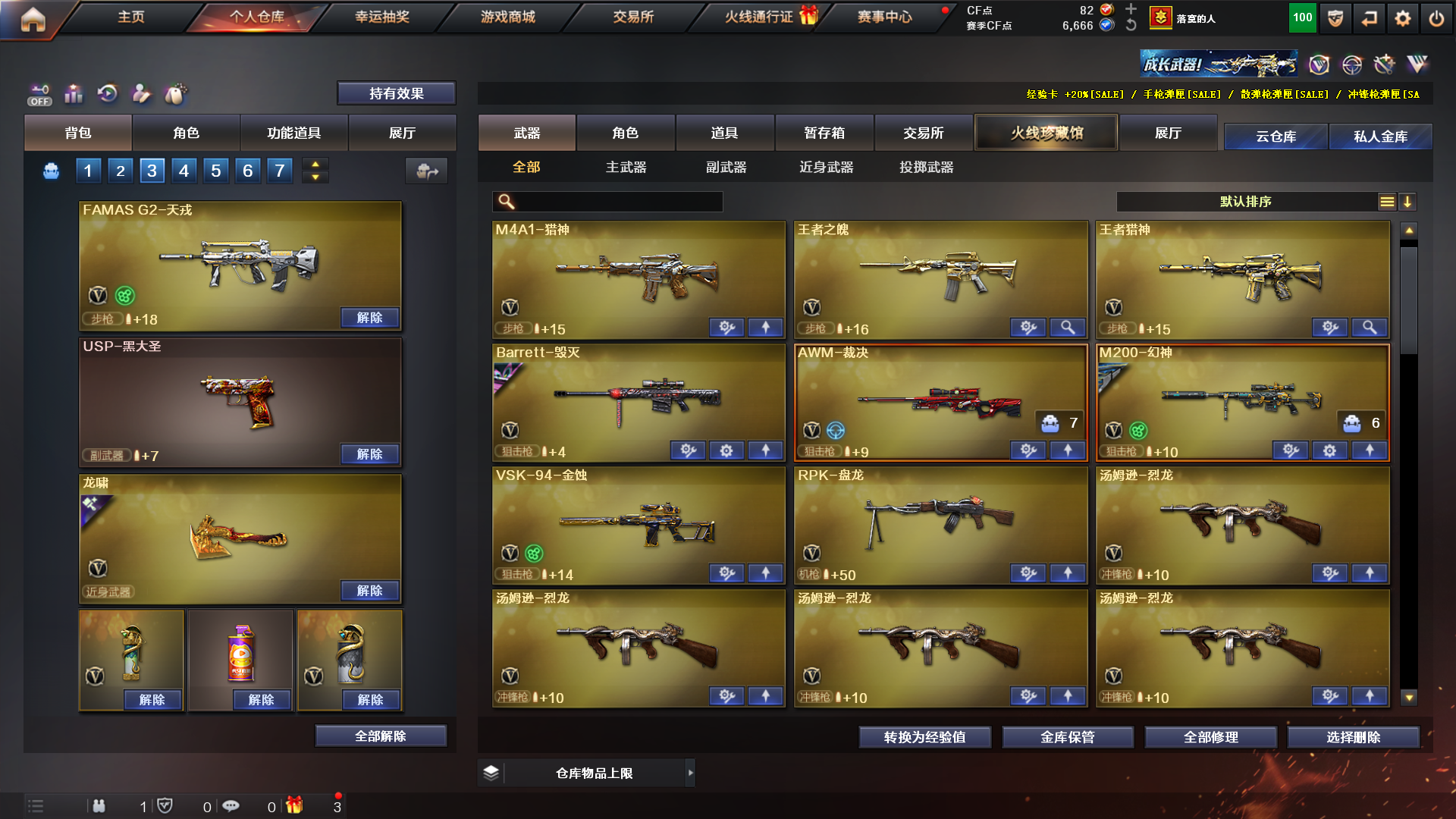 法马斯电流幻神金蚀天罚裁决+6烈龙+毒蜂+6修毁灭3件套;炽芒蝶刃,RPK-盘龙,M200-幻神,Scar Light-白虎,Kar98K-星神,