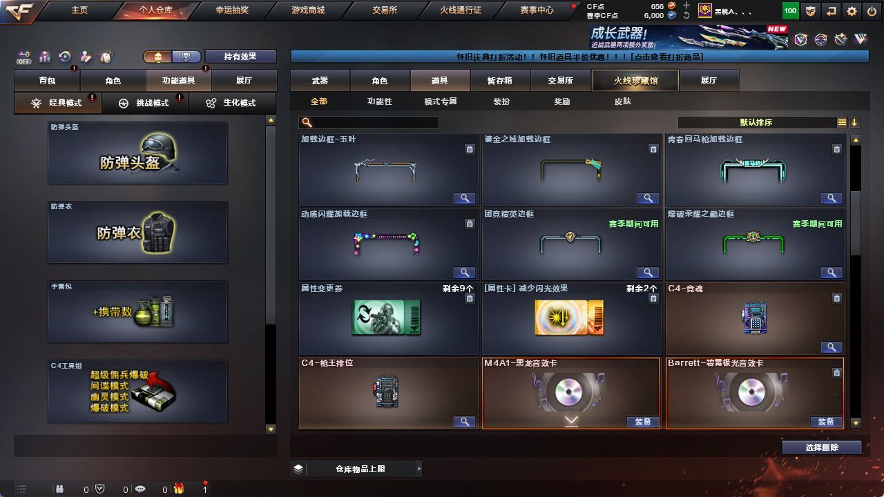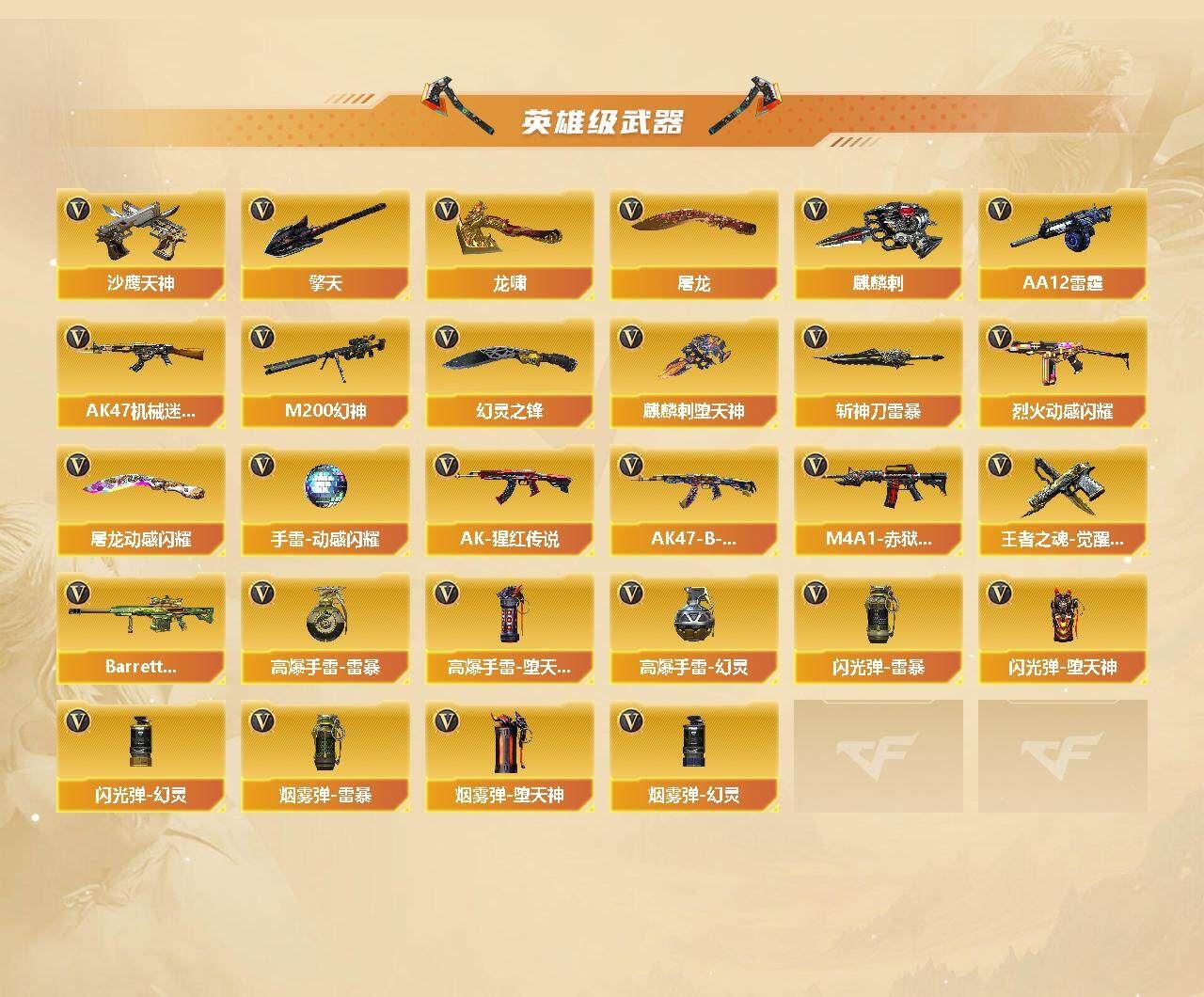 【热门武器】:QBZ03-金色蔷薇,HK417-朱雀,M200-幻神,死亡之眼,金色小号,C.A.T,汤姆逊-烈龙*6,加特林-炼狱,火麒麟-绝迹,沙鹰-修罗*4【王者炫金武器】:王者之魄,炫金毁灭【音效卡】:M200-幻神音效卡,M4A1-黑龙音效卡,Barrett-毁灭音效卡,Barrett-碧霄极光音效卡【皮肤】:烈龙-星空,雷神-虎将*2,火麒麟-华夏之心,火麒麟-平天大圣,毁灭-星空,黑龙-暗月,M4A1-黑龙-361,战神-粉色甜心皮肤*3,战神-紫绶金章皮肤*9,战神-流金岁月皮肤*7,AK47-B-常胜将军-孙权,天龙-能量核心,极光-能量核心,修罗-能量核心【角色】:零,瞳,战地猎狐,王者-瞳-闭月羞花,雪域霜狐,乔伊教练,修道士,芳心审判者,风暴女,嘉年华灵狐,娟娟,兰-新年限定,龙儿,潘多拉-甜心教官,潜龙队-X,斯沃特-X,蜀雪,铁骑-乘风破浪,新娜塔莎,影武者-X,海豹突击队【人偶武器】:火麒麟-绝迹,迷你钢铁终结者,迷你救赎猎手,C.A.T,迷你深渊冰龙*3,夺魂,迷你生化手雷,生化手雷-机甲核心,闪光弹-小乔,迷你超能女侍【暴走生化】:死亡之眼【挑战大师】:激光毁灭者III-白马银枪,激光毁灭者III【英雄级武器】:AK47-火麒麟,AK47-麒麟,M4A1-黑龙,M4A1-雷神*2,AK47-机械迷城,HK417-朱雀,QBZ03-金色蔷薇,烈火-动感闪耀,AK-47-猩红传说*3,AK47-B-战神*2,AWM-天龙*3,Barrett-毁灭,Barrett-极光,M200-幻神,加特林-炼狱,汤姆逊-烈龙*6,AA-12-雷霆,沙鹰-修罗*4,沙鹰-天神*2,王者之魂-觉醒版,屠龙,龙啸,麒麟刺-堕天神,擎天,麒麟刺,幻灵之锋,屠龙-动感闪耀,斩神刀-雷暴,高爆手雷-雷暴,高爆手雷-堕天神,高爆手雷-幻灵,手雷-动感闪耀,闪光弹-雷暴,闪光弹-堕天神,闪光弹-幻灵*2,烟雾弹-雷暴,烟雾弹-堕天神,烟雾弹-幻灵,M4A1-赤狱骑士,Barrett-碧霄极光【道具】:Q9战队炫彩背包,云山科技背包,女皇终结者-背包,战舰背包,炫彩背包,超级背包,女皇终结者-魔龙之吻,救世主-黑桃战神,绿色巨人,灵魂忍者,变异宝贝,迷雾幽灵,夺命之镰,防化服*3,流光-鎏金之域,电玩兔兔表情,动感闪耀表情,防弹头盔*2,防弹衣*2,C4工具钳*3,手雷包*4【特殊枪械】:6烈龙,1炼狱;QBZ03-金色蔷薇,M200-幻神,