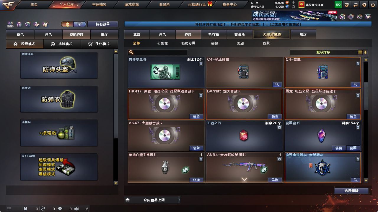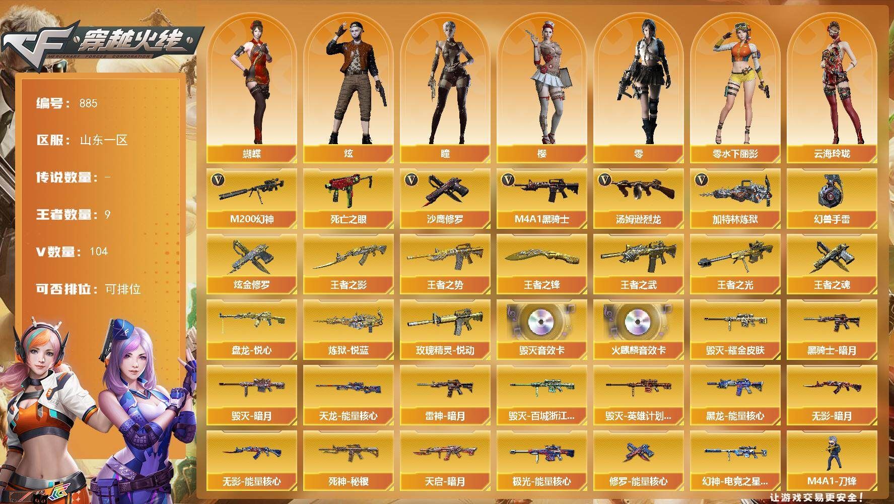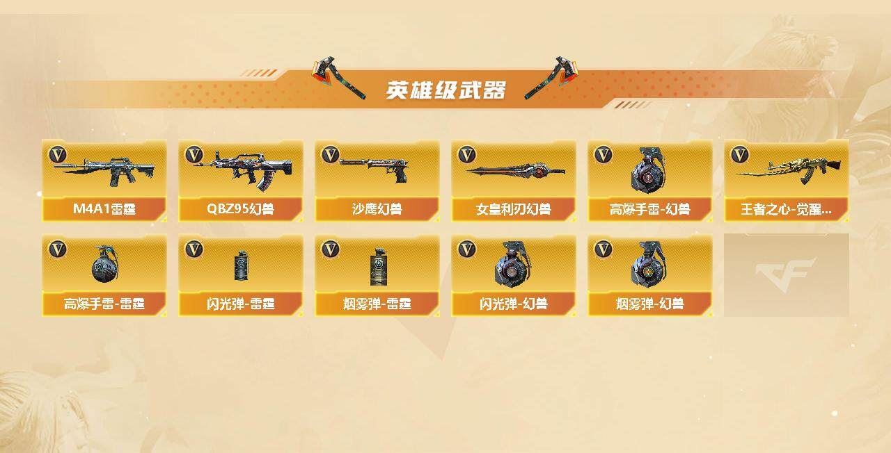 【热门武器】:M200-幻神,死亡之眼*2,M4A1-黑骑士*2,汤姆逊-烈龙*4,加特林-炼狱,沙鹰-修罗*5,高爆手雷-幻兽*6【王者炫金武器】:王者之势,王者之武,玫瑰精灵-悦动,王者之影,王者之光*2,盘龙-悦心*2,炼狱-悦蓝,王者之魂,王者之锋*2,炫金修罗*2【音效卡】:AK47-火麒麟音效卡,Barrett-毁灭音效卡【皮肤】:幻神-电竞之星 皮肤,雷神-暗月,毁灭-暗月*4,毁灭耀金皮肤,毁灭-百城浙江 皮肤,毁灭-英雄计划 皮肤,黑龙-能量核心,黑骑士-暗月*2,无影-暗月,无影-能量核心,死神-秘银,天启-暗月,天龙-能量核心,极光-能量核心,修罗-能量核心*3【角色】:零,樱,瞳,蝴蝶,炫,云海玲珑,空,零-水下丽影,潘多拉-甜心教官,影武者-X【人偶武器】:COP-旗袍,M4A1-刀锋【暴走生化】:死亡之眼*2【挑战大师】:阐释者III【英雄级武器】:AK47-火麒麟,M4A1-黑龙*5,M4A1-雷神,M4A1-黑骑士*2,AK47-无影,M4A1-死神,AK47-黑武士*3,AN94-超新星,M4A1-雷霆,M4A1-玫瑰精灵,QBZ95-幻兽,王者之心-觉醒版,AWM-天龙*3,Barrett-毁灭,Barrett-极光,M200-幻神,Barrett-金色蔷薇,加特林-炼狱,汤姆逊-烈龙*4,沙鹰-修罗*5,沙鹰-天神*5,COP-雷霆,破空枪刃,沙鹰-幻兽*6,屠龙*4,龙啸*2,擎天*2,麒麟刺,女皇利刃-幻兽,高爆手雷-雷霆*6,高爆手雷-幻兽*6,闪光弹-雷霆*6,闪光弹-幻兽*6,烟雾弹-雷霆*6,烟雾弹-幻兽*6【道具】:CFS限定背包,战舰背包,炫彩背包,绿色巨人,灵魂忍者,变异宝贝,迷雾幽灵,夺命之镰,防化服*2,EP战队收纳包,防弹头盔*2,防弹衣*2,C4工具钳*2,手雷包*2【特殊枪械】:2黑骑士,4烈龙,1炼狱;M200-幻神,