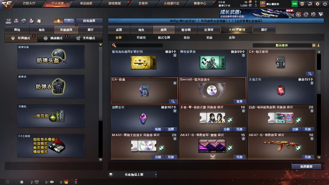 【热门武器】:QBZ03-金色蔷薇,HK417-朱雀,M200-幻神,死亡之眼*3,金色小号,C.A.T,M4A1-黑骑士,汤姆逊-烈龙*4,RPK-盘龙,毁灭-孙三炮,沙鹰-修罗*5【王者炫金武器】:王者之戮,王者之翼,王者之武,炫金武士,炫金超新星,炫金天龙,炫金修罗【音效卡】:M4A1-雷神音效卡,M4A1-黑骑士音效卡,Barrett-毁灭音效卡【皮肤】:幻神-宠儿-2021MVP,雷神-暗月,雷神-星空,火麒麟-雷神,火麒麟-心动糖果,毁灭-BEAN-2020MVP,黑骑士耀金皮肤,战神-紫绶金章皮肤,天龙-秘银【角色】:葵,樱,瞳,战地猎狐,王者-瞳-闭月羞花,王者-零,王者涂鸦,乔伊教练,修道士,云海玲珑,暗夜-X,初恋灵狐,芳心审判者,风暴女*2,虎妞,嘉年华灵狐,灵狐者-X,龙儿,龙儿-小淘气,麻雀,萌儿,潘多拉-X,潘多拉-甜心教官,青霞仙子,蛇姬,斯沃特-X,兔囡囡,新娜塔莎,雪莉杨-摸金校尉,夜玫瑰-幻能朋克,幽【人偶武器】:毁灭-孙三炮,火麒麟-灵狐,迷你宝贝*2,加特林-机械猎手,AWM-灵狐-15周年嘉年华,COP-旗袍,C.A.T,迷你深渊冰龙,迷你牛牛,生化手雷-机甲核心*2【暴走生化】:死亡之眼*3【挑战大师】:神圣爆裂者III,冰龙粉碎者-白马银枪,激光毁灭者III【英雄级武器】:AK47-火麒麟*2,M4A1-黑龙,M4A1-雷神*3,M4A1-黑骑士,AK47-黑武士,AK12-天启*2,AK47-黑鲨,HK417-朱雀,无影-神兵利器,M4A1-玫瑰精灵,QBZ03-金色蔷薇,烈火-动感闪耀,王者之心-觉醒版,王者之武-觉醒版,AWM-天龙,Barrett-毁灭,Barrett-极光*2,AWM-裁决,M200-幻神,Barrett-金色蔷薇,RPK-盘龙,汤姆逊-烈龙*4,烈龙-悦心-觉醒版*2,沙鹰-修罗*5,天神-动感闪耀,屠龙*4,龙啸,擎天*2,麒麟刺,屠龙-动感闪耀,高爆手雷-雷霆,手雷-动感闪耀,闪光弹-雷霆,烟雾弹-雷霆,烟雾弹-竞技荣光,M4A1-赤狱骑士,M4A1-苍鸣雷神,Barrett-碧霄极光【道具】:CFS限定背包,亚洲杯纪念炫彩背包,全能枪王背包,战舰背包,炫彩背包,超级背包*2,女皇终结者-魔龙之吻,救世主-黑桃战神,绿色巨人,灵魂忍者,迷雾幽灵,生化弹匣,夺命之镰,防化服*3,金色流光-枪王排位*2,星辰流光-枪王排位,流光-鎏金之域,枪王排位28赛季金色流光,枪王排位29赛季金色流光,电玩兔兔表情,斯沃特表情,动感闪耀表情,C4-再燃火线,防弹头盔*11,防弹衣*11,C4工具钳*6,手雷包*6【特殊枪械】:1黑骑士,4烈龙,1盘龙;RPK-盘龙,QBZ03-金色蔷薇,M200-幻神,