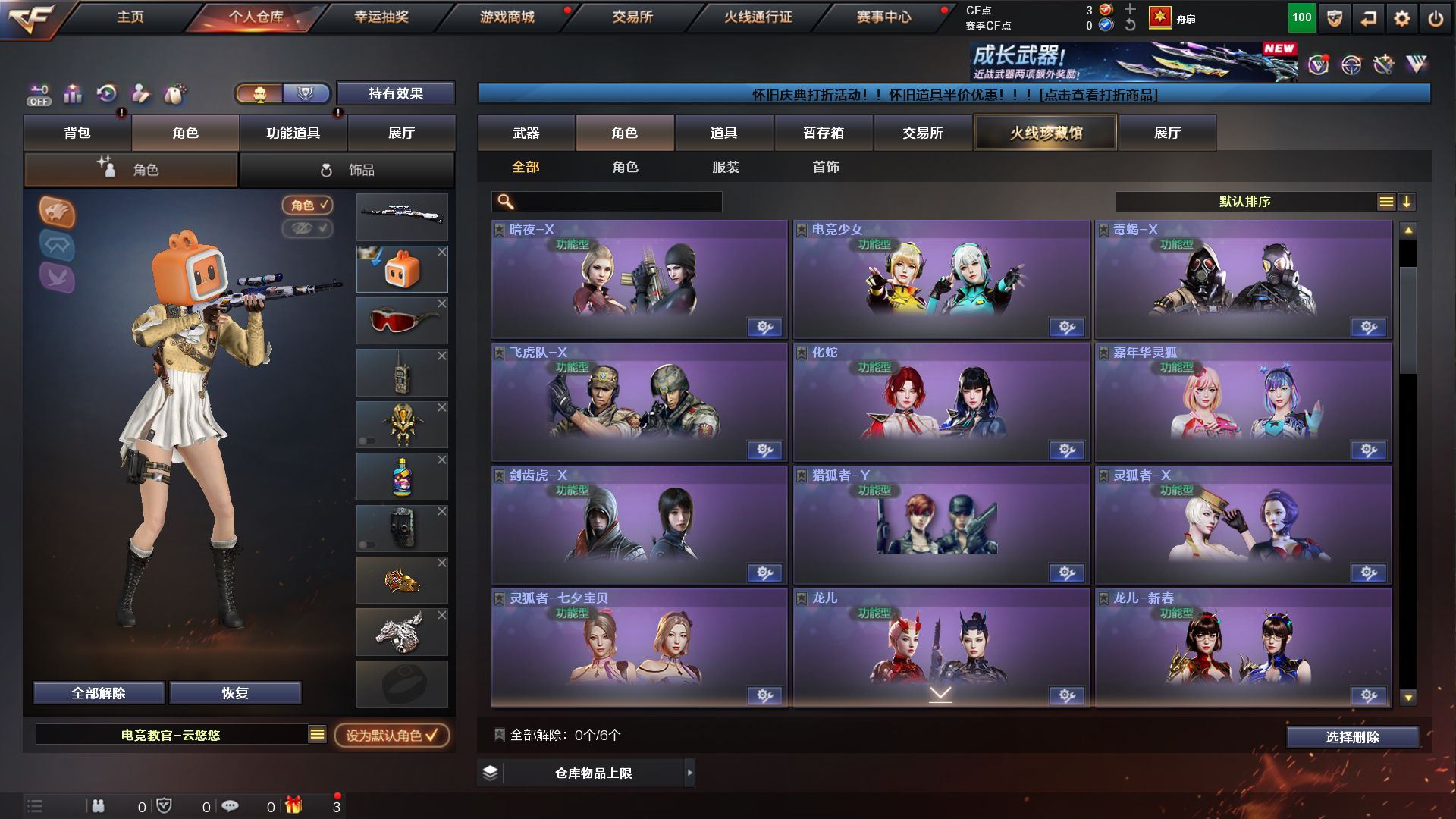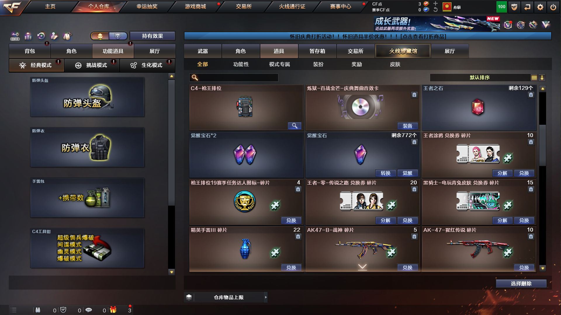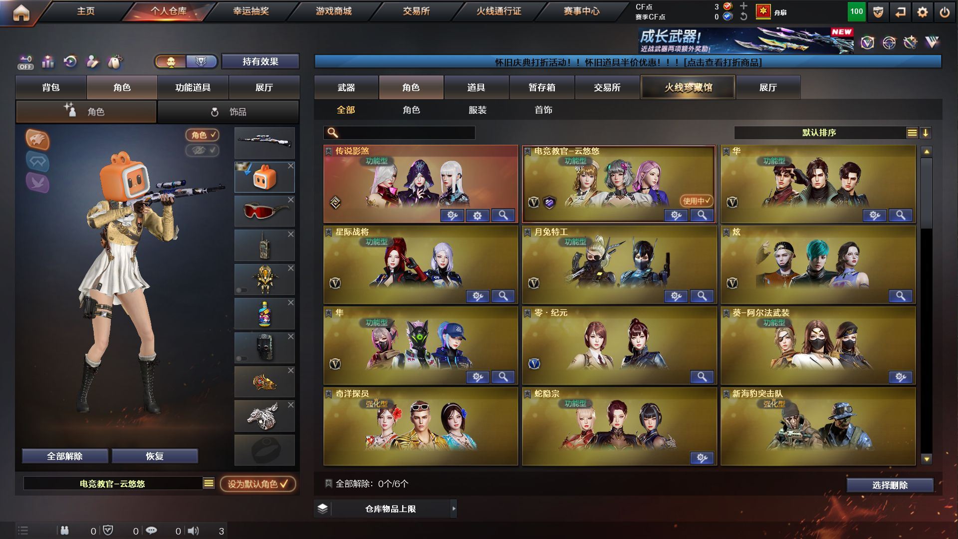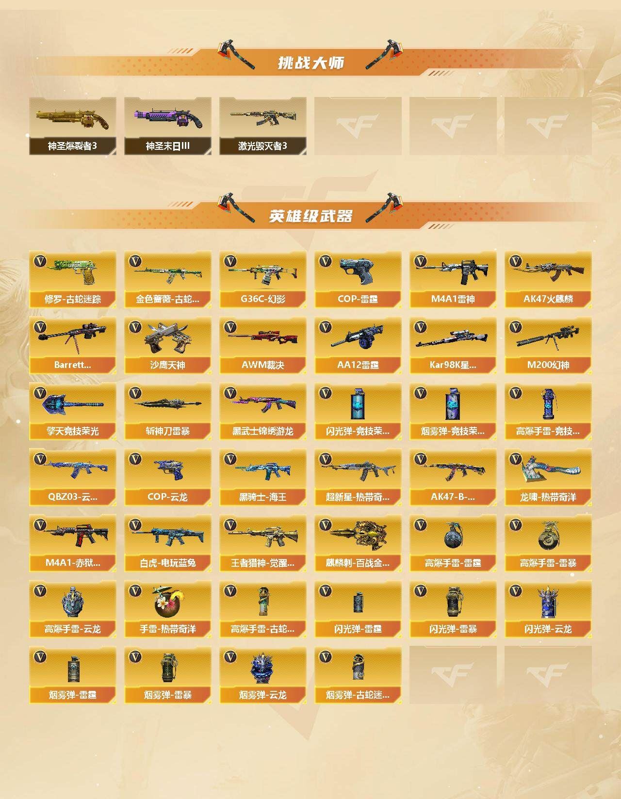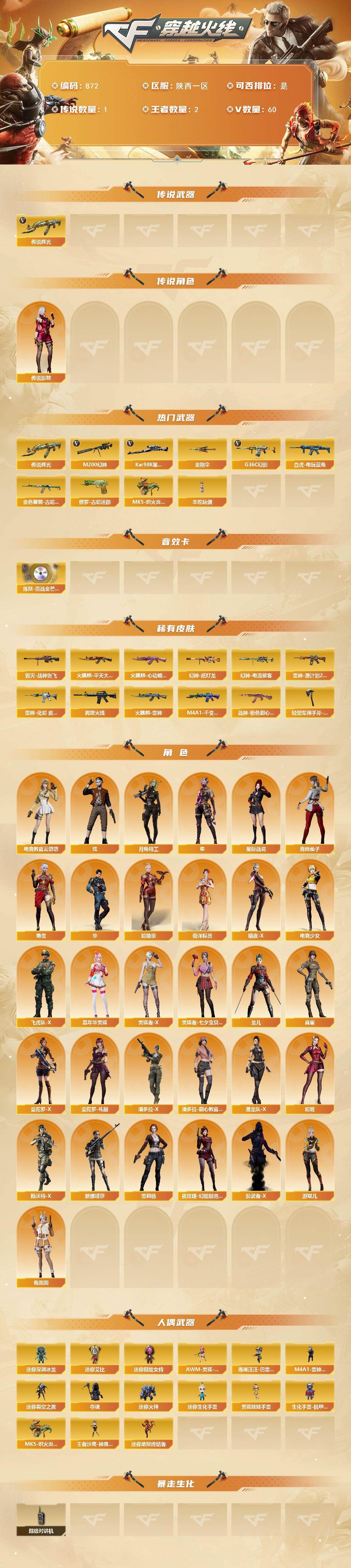 【传说影煞】【传说辉光】【G36C-幻影,M200-幻神,金色蔷薇-古蛇迷踪,修罗-古蛇迷踪,白虎-电玩蓝兔,Kar98K-星神,MK5-炽火炎龙,羊驼玩偶,金刚伞】【AK47-火麒麟,M4A1-雷神,G36C-幻影,QBZ03-云龙,黑武士-锦绣游龙,超新星-热带奇洋,金色蔷薇-古蛇迷踪,AK47-B-战神*2,黑骑士-海王*2,白虎-电玩蓝兔,王者猎神-觉醒版,Barrett-毁灭,AWM-裁决,M200-幻神,Kar98K-星神,AA-12-雷霆,沙鹰-天神,COP-雷霆,COP 357-云龙,修罗-古蛇迷踪,擎天-竞技荣光,龙啸-热带奇洋,斩神刀-雷暴,麒麟刺-百战金芒,高爆手雷-雷霆*6,高爆手雷-雷暴,高爆手雷-竞技荣光,高爆手雷-云龙,手雷-热带奇洋,高爆手雷-古蛇迷踪,闪光弹-雷霆*5,闪光弹-雷暴,闪光弹-竞技荣光,闪光弹-云龙*2,烟雾弹-雷霆*5,烟雾弹-雷暴,烟雾弹-竞技荣光,烟雾弹-云龙,烟雾弹-古蛇迷踪,M4A1-赤狱骑士】【炼狱-百战金芒-庆典舞曲音效卡】【幻神-纸灯龙皮肤,幻神-电流骇客 皮肤,雷神-源计划2.0专属 皮肤,雷神-化蛇 皮肤,M4A1-再燃火线,火麒麟-雷神,火麒麟-平天大圣,火麒麟-心动糖果,毁灭-战神张飞,M4A1-千变-孔明皮肤,战神-粉色甜心皮肤,轻型军用手斧-再燃火线】【炫,电竞教官-云悠悠,月兔特工,隼,星际战将,华,蛇隐宗,奇洋探员,暗夜-X,电竞少女,飞虎队-X,嘉年华灵狐,灵狐者-X,灵狐者-七夕宝贝,龙儿,麻雀,曼陀罗-X,曼陀罗-礼服,潘多拉-X,潘多拉-甜心教官,潜龙队-X,青霞仙子,蛇姬,斯沃特-X,蜀雪,兔囡囡,新娜塔莎,雪莉杨,夜玫瑰-幻能朋克,影武者-X,游珑儿】【人偶武器:M4A1-雷神-精英刀锋,王者沙鹰-神勇金戈,MK5-炽火炎龙,迷你地狱终结者,AWM-灵狐-15周年嘉年华,海滩汪汪-巴雷特,迷你深渊冰龙,迷你裂空之翼,夺魂,迷你火种,迷你生化手雷,生化手雷-机甲核心,迷你艾比,迷你超能女侍,灵狐娃娃手雷】【BS战队炫彩背包,属背包,古蛇迷踪炫彩背包,奇洋探员-海龟背包,热带奇洋炫彩背包,百战金芒炫彩背包,臻选金狐背包,裂空之翼背包-金色,超级背包,女皇终结者-魔龙之吻,救世主-黑桃战神,绿色巨人,灵魂忍者*3,变异宝贝,妖姬,迷雾幽灵*2,夺命之镰,防化服*2,金色流光-枪王排位,星辰流光-枪王排位,枪王排位28赛季金色流光,枪王排位29赛季金色流光,语音特效-盛典烟火,古蛇迷踪特效,蛇隐宗表情,萌萌小葵表情,电玩兔兔表情,热带奇洋表情,C4-黑曜,防弹头盔*2,防弹衣*2,C4工具钳*2,手雷包*2】;传说影煞,隼,电竞教官-云悠悠,G36C-幻影,M200-幻神,Kar98K-星神,