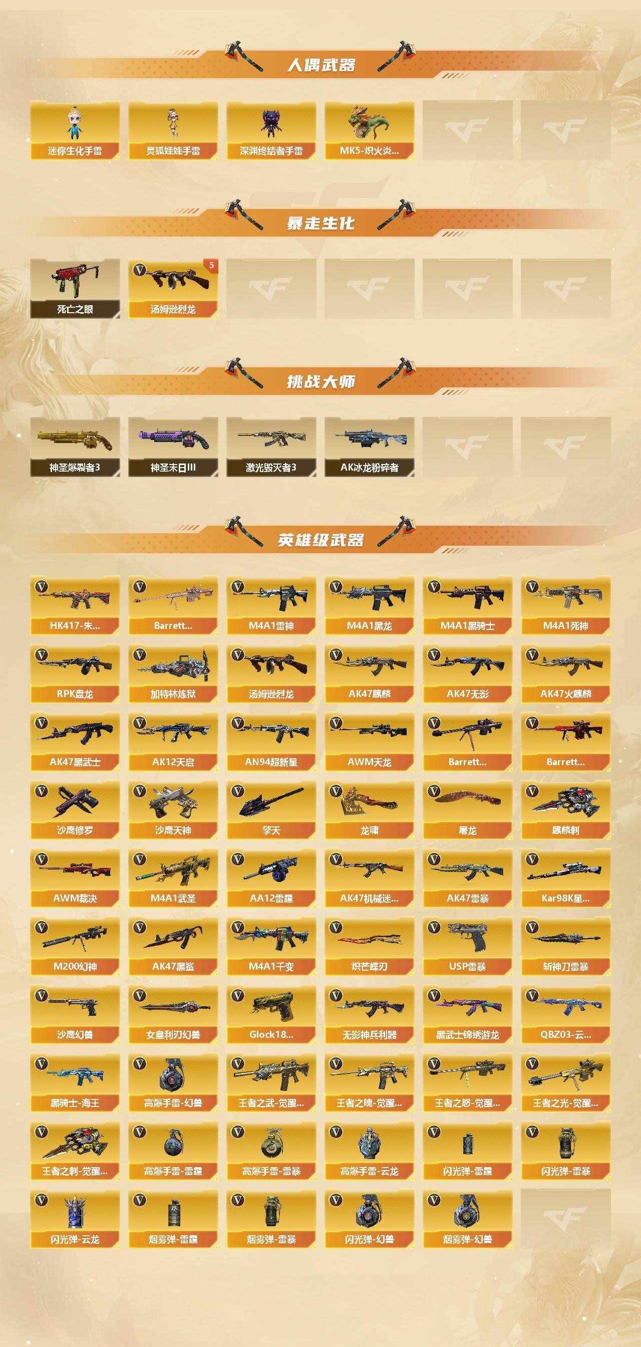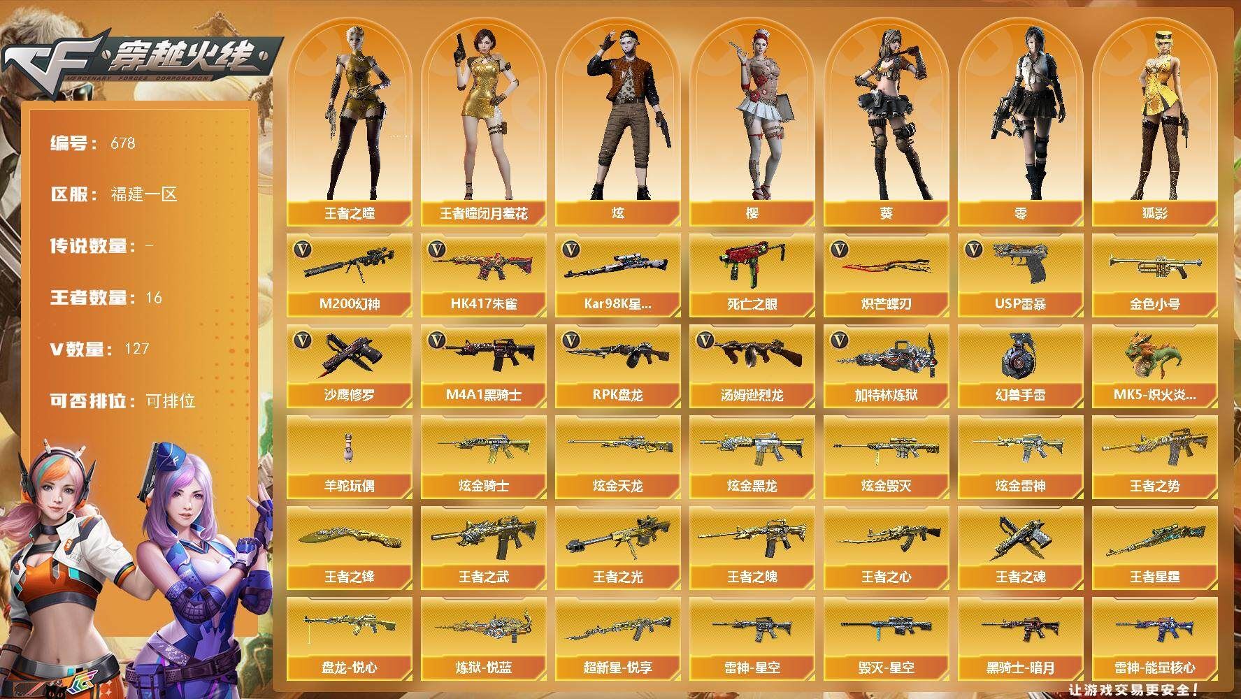 传说角色】:传说影煞【幻兽套-手雷套】【热门武器】:M200-幻神,USP-雷暴,HK417-朱雀,死亡之眼*2,Kar98K-星神,金色小号,M4A1-黑骑士*2,汤姆逊-烈龙*5,RPK-盘龙,加特林-炼狱*4,MK5-炽火炎龙,羊驼玩偶,沙鹰-修罗*9,炽芒蝶刃,高爆手雷-幻兽【稀有套装】:雷暴套【王者炫金武器】:超新星-悦享,王者之势,王者之武,王者之魄,王者之心,王者之光,王者星霆,盘龙-悦心,炼狱-悦蓝,王者之魂,王者之锋,炫金骑士,炫金黑龙,炫金雷神,炫金毁灭,炫金天龙【皮肤】:雷神-暗月,雷神-能量核心,雷神-星空,火麒麟-雷神,火麒麟-平天大圣,火麒麟-心动糖果,毁灭-暗月*3,毁灭-星空,M4A1-千变-孔明皮肤,黑骑士-暗月*2,无影-暗月*3,极光-能量核心*2,修罗-能量核心*5,天神-暗月,屠龙-星火燎原【角色】:零,葵,樱,炫,华,王者-瞳-闭月羞花,王者之瞳,狐影,暗夜-X,飞虎队-X,风暴女,虎妞,嘉年华灵狐,娟娟,兰-海滩派对,兰-新年限定,零-水下丽影,灵狐者-黄金海岸,龙儿,曼陀罗-X,潜龙队-X,邱刚敖,青霞仙子,斯沃特-X,蜀雪,铁骑荣耀,新娜塔莎,影武者-X,游珑儿【人偶武器】:天龙-曼陀罗,MK5-炽火炎龙,AWM-灵狐-15周年嘉年华,COP-旗袍,迷你深渊冰龙*2,迷你牛魔王,夺魂,迷你生化手雷,深渊终结者手雷*2,灵狐娃娃手雷【暴走生化】:死亡之眼*2【挑战大师】:神圣爆裂者III,AK47-冰龙粉碎者*2,激光毁灭者III*2,神圣爆裂者-末日III【英雄级武器】:M4A1-千变*2,AK47-火麒麟*4,AK47-麒麟,M4A1-黑龙*3,M4A1-雷神*3,M4A1-黑骑士*2,AK47-无影,M4A1-死神,AK47-黑武士*2,AK12-天启*4,AN94-超新星,M4A1-武圣*2,AK47-机械迷城,AK47-黑鲨,AK47-雷暴,HK417-朱雀,无影-神兵利器,QBZ03-云龙,黑武士-锦绣游龙,王者之武-觉醒版,王者之魄-觉醒版,黑骑士-海王,AWM-天龙*2,Barrett-毁灭*6,Barrett-极光*2,AWM-裁决,M200-幻神,Kar98K-星神,Barrett-金色蔷薇,王者之怒-觉醒版,王者之光-觉醒版,RPK-盘龙,加特林-炼狱*4,汤姆逊-烈龙*5,AA-12-雷霆*2,沙鹰-修罗*9,沙鹰-天神*5,USP-雷暴,沙鹰-幻兽,Glock18-武圣,屠龙*4,龙啸*2,擎天*3,麒麟刺*4,炽芒蝶刃,斩神刀-雷暴,女皇利刃-幻兽,王者之刺-觉醒版,高爆手雷-雷霆,高爆手雷-幻兽,高爆手雷-雷暴*5,高爆手雷-云龙,闪光弹-雷霆,闪光弹-幻兽,闪光弹-雷暴*5,闪光弹-云龙,烟雾弹-雷霆,烟雾弹-幻兽,烟雾弹-雷暴*5【道具】:Q9战队炫彩背包,WE炫彩背包,XROCK炫彩背包,战舰背包,炫彩背包,背包-葫芦兄弟,超级背包*2,妩媚妖姬,绿色巨人,灵魂忍者*2,变异宝贝,迷雾幽灵,生化弹匣,夺命之镰,防化服*2,金色流光-枪王排位,星辰流光-枪王排位,枪王排位28赛季金色流光,防弹头盔*6,防弹衣*6,C4工具钳*5,手雷包*4,;USP-雷暴,炽芒蝶刃,传说影煞,RPK-盘龙,M200-幻神,Kar98K-星神,