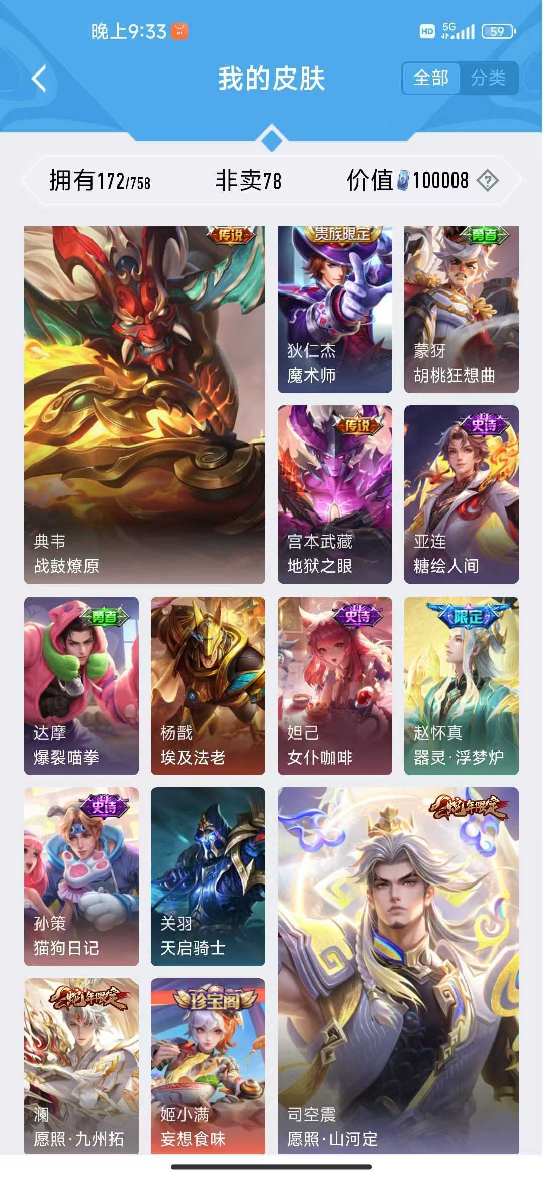 v10、12典藏520皮、马超无双飞将、韩信典藏、马可深海之熄、瑶珍品传说大耳狗之梦、青丘·九尾、枫霜尽、绯月行、前尘镜、至尊宝、天魔缭乱