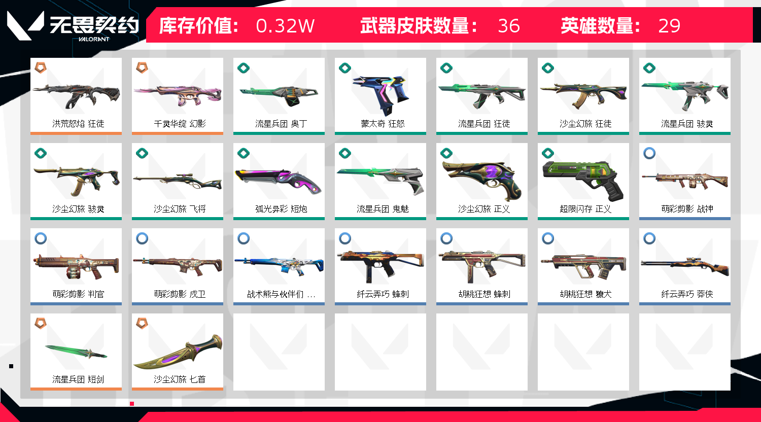 允许 英雄26 武器皮肤数量35,有流脓ak,莲花m4,通行证反手刀;洪荒怒焰 狂徒,