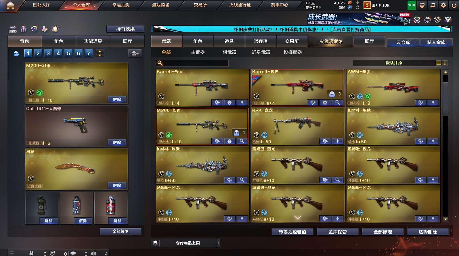 4炫金 3王者 《传说光耀》《m200幻神》《裁决》《王者之决/怒》《1911大黄蜂》《朱雀》《青龙》《王者之戮》《烈火》《毁灭》《火麒麟》《雷神》《黑骑士》《黑武士》《盘龙 炼狱 6烈龙》《雷神精英刀锋》《死亡之眼》《王者瞳闭月羞花》《黑龙音效卡 火麒麟音效卡 毁灭音效卡 极光音效卡 黑骑士音效卡》;RPK-盘龙,M200-幻神,