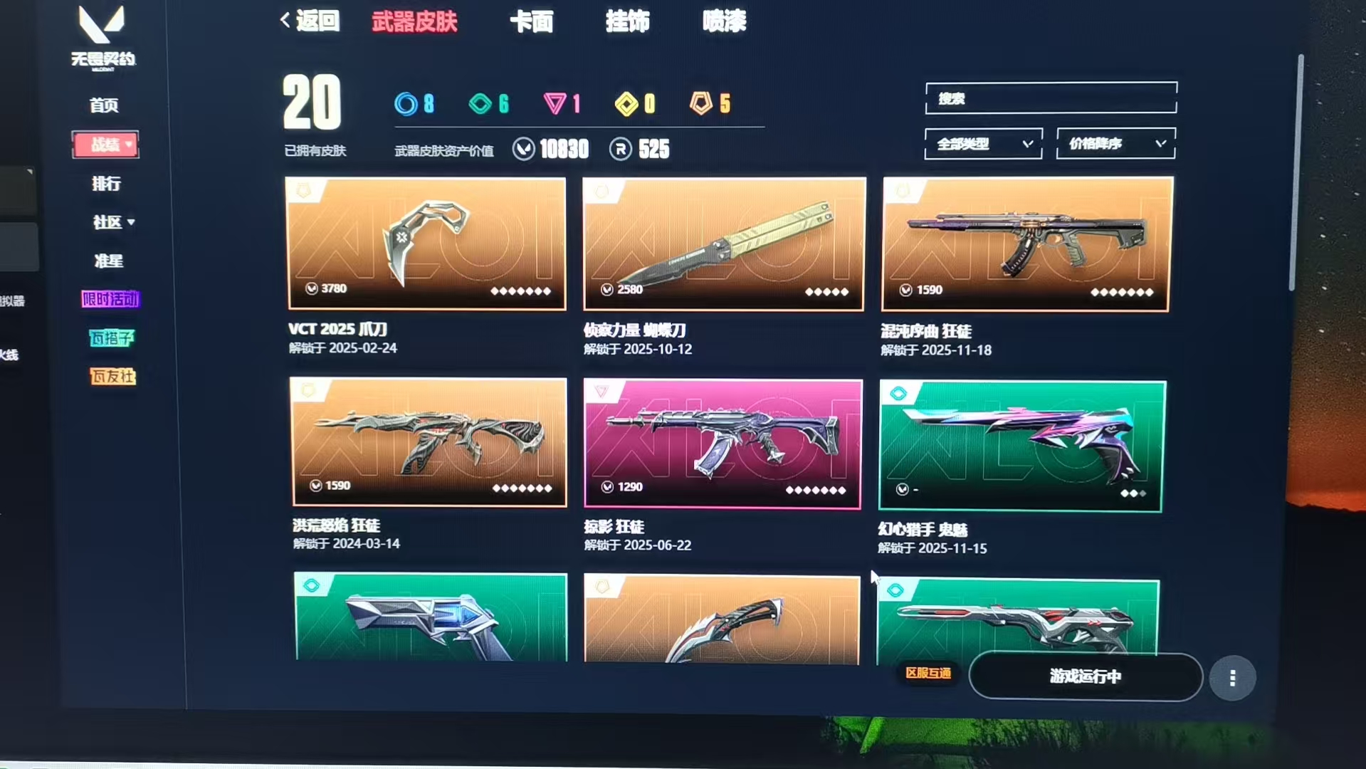 可排位 英雄24 武器皮肤数量20;VCT 2025 爪刀,洪荒怒焰 狂徒,掠影 狂徒,混沌序曲 狂徒,