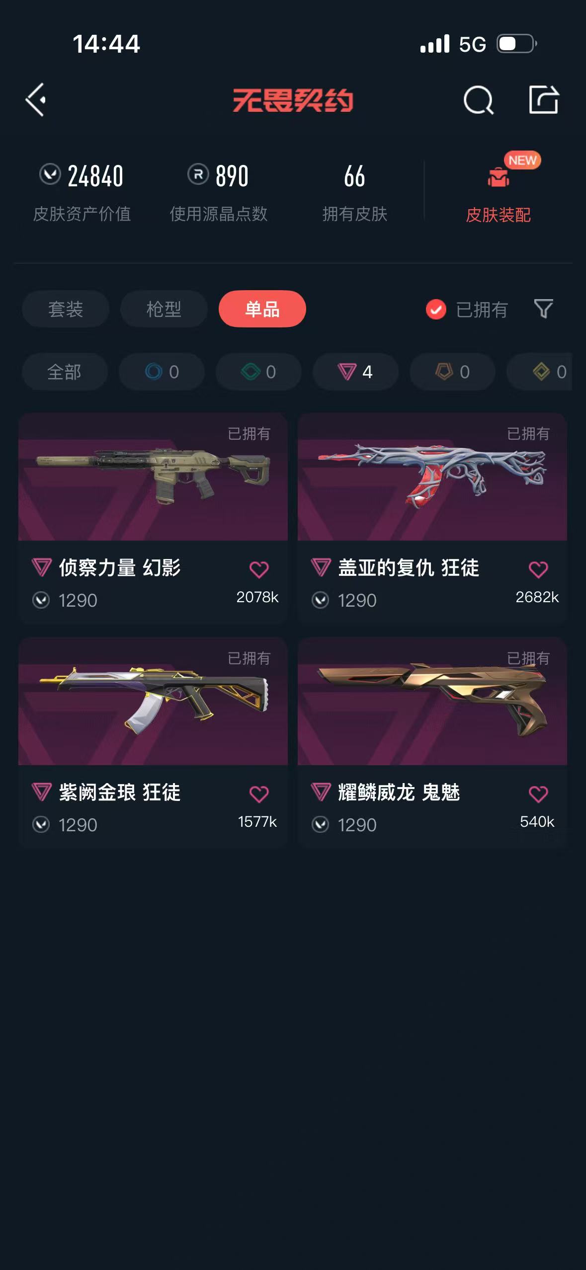 可排位 英雄28 武器皮肤数量66;盖亚的复仇 狂徒,洪荒怒焰 狂徒,侦察力量 幻影,紫阙金琅 狂徒,千灵华绽 正义,
