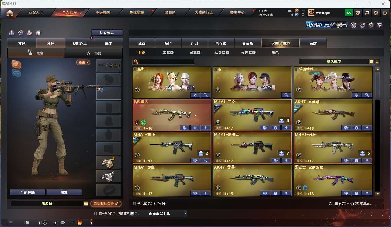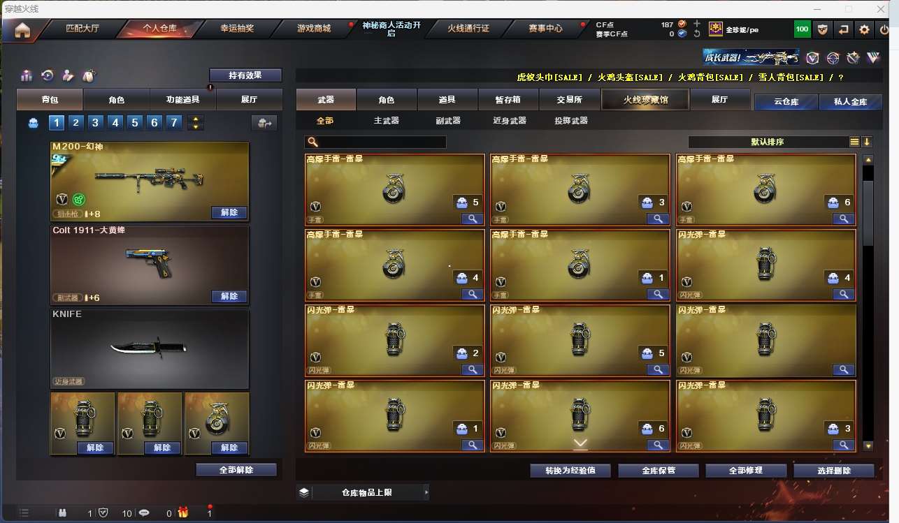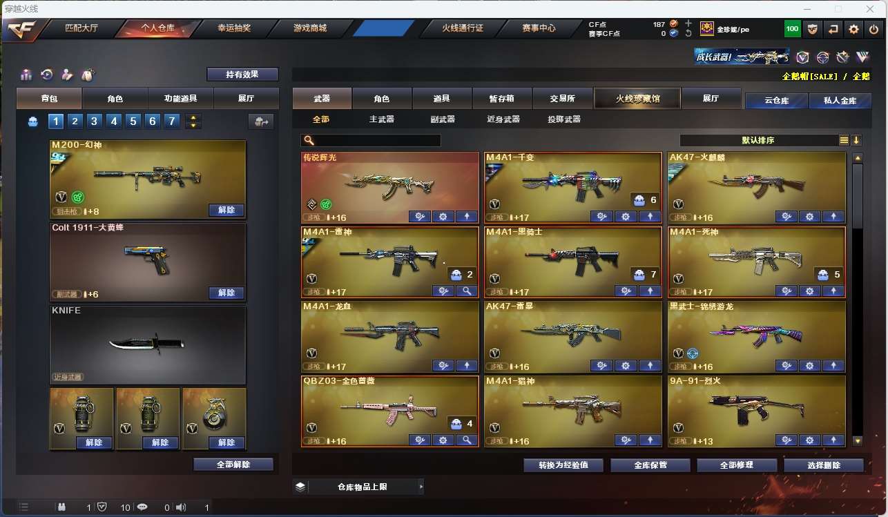 m200幻神+冠军之幻+usp雷暴+冠军之刃】【6烈龙 炼狱*3 盘龙 斯太尔蝴蝶】【传说辉光】【qbz金色蔷薇+卡+巅峰荣耀】【火麒麟+横秒之巅】【雷神+卡+s18冠军+巅峰荣耀+荣耀之魄】【黑骑士】【毁灭+卡】【裁决】【雷暴套】 【武器:雷暴 王者之戮 王者之幻 王者炎心 白虎电玩蓝兔 】 【5手呛:修罗*2 天神*2 usp雷暴】 【8刀具:屠龙*5 龙啸 擎天 麒麟刺 】 【7雷套:雷暴雷*7】 【音效卡: 雷神音效卡 金色蔷薇音效卡 毁灭音效卡 】 【角色:春 荒漠琉璃 魅影;USP-雷暴,Knife-冠军之刃,RPK-盘龙,QBZ03-金色蔷薇,M200-幻神,