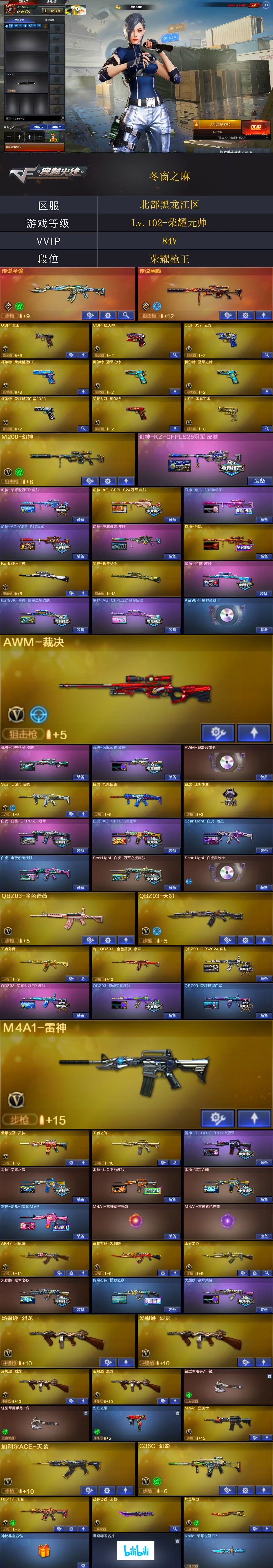 【商品标题】:北部黑龙江区-80V-可二次实名-【Lv.102-荣耀元帅】-【段位:荣耀枪王】喜欢可包月 【稀有武器】:传说幽瞳/M200-幻神/Kar98K-星神/G36C-幻影/ScarLight-白虎/HK417-朱雀/QBZ03-天罚/加利尔ACE-天袭/COP-堕天神/COP357-云龙/柯尔特-荣耀世冠白鲨2023/荣耀世冠-柯尔特/柯尔特-冠军之特(2)/QBZ03-金色蔷薇/AK47-火麒麟/M4A1-黑龙/M4A1-雷神(2)/M4A1-黑骑士/荣耀世冠-火麒麟/荣耀世冠-雷神/Barrett-毁灭/AWM-裁决/汤姆逊-烈龙(4)/炽芒蝶刃/云龙扇 【王者武器】:王者之心-觉醒版/王者之魄/王者芳薇/王者之怒/王者之力 【热门角色】:星际战将/奇洋探员/王者潘多拉/空/潘多拉-X/兔囡囡/职业选手/潘多拉 【热门音效卡】:Kar98K-星神音效卡/AWM-裁决音效卡/Scar Light-白虎音效卡/QBZ03-天罚音效卡/Barrett-毁灭音效卡 【热门皮肤】:幻神-KZ-CFPLS25冠军皮肤/幻神-AG-CFPLS24冠军皮肤/幻神-宠儿-2021MVP/幻神-AG-CFPLS17冠军/幻神-电流骇客皮肤/幻神-丹凤/白虎-白鲨-CFPLS23冠军/裁决-巅峰荣耀皮肤/龙啸-巅峰荣耀皮肤/QBZ03-CFS2024皮肤/QBZ03-巅峰荣耀皮肤/屠龙-星火燎原/Kar98K-星神-冠军之星皮肤/Kar98K-星神-AG-CFPLS21冠军皮肤/星神-拼搏皮肤/雷神-R.LGD-CFPLS18冠军/火麒麟-巅峰荣耀/白虎-AG-CFPLS20冠军/白虎-电玩粉兔皮肤/传奇石头-横秒之巅/QBZ03-荣耀世冠白鲨/雷神-宠儿-2019MVP/ScarLight-白虎-暗星/极光-高能霹雳皮肤/ScarLight-白虎-冠军之虎皮肤/火麒麟-冠军之心/屠龙-荣耀之锋/雷神-斗鱼平台皮肤/毁灭-荣耀之怒/雷神-冠军之魄/雷神-荣耀之魄 【其他亮点】:白虎-迷你小艾/白虎-九尾白狐/MK5-炽火炎龙/M14EBR-冠军金牛/烟雾弹-荣耀世冠白鲨2023(2)/哔哩哔哩名片 (截图展示段位不代表实际段位,如赛季更新等不可抗拒因素发生变化,其余道具看截图或咨询客服);