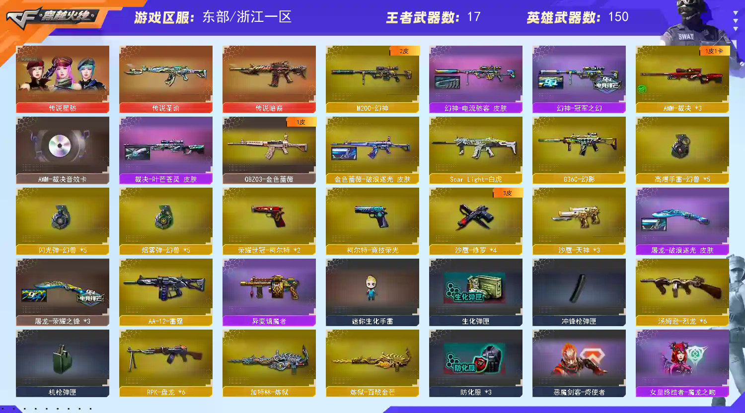传说星骇暗裔圣谕✅6烈龙幻面灵狐+6盘龙炼狱✅幻神双皮+QBZ破浪跳跳鲨✅幻兽套✅幻影+2世冠柯尔特✅裁决3件套 稀有武器:传说暗裔、传说圣谕、M200幻神、烈龙X6+斯泰尔-幻面灵狐、盘龙X6+炼狱+炼狱百战金芒、G36C幻影、荣耀世冠柯尔特X2、M200竞技荣光、柯尔特竞技荣光、擎天竞技荣光、破空枪刃、Scarlight白虎、QBZ金色蔷薇、QBZ幻兽X2、沙鹰幻兽、女皇利刃幻兽、青龙、HK朱雀、荣耀世冠火麒麟、荣耀世冠雷神、天龙、毁灭X2、裁决X3、火麒麟X2、黑龙、雷神X2、黑骑士X6、无影、死神X2、黑武士、天启、超新星X2、机械迷城X2、黑鲨、龙血、无影神兵利器、死神雪域霜狐、机械迷城穹宇、朱雀电竞之星、烈火、玫瑰精灵、黑骑士海王X3、BARRETT朱雀、源雷神、源毁灭、BARRETT金色蔷薇、A12雷霆、修罗X3、天神X3、屠龙X5、龙啸X2、擎天、麒麟刺X3、尼泊尔雷霆、斩神刀雷暴、麒麟刺堕天神、龙啸堕天神、麒麟刺百战金芒、屠龙电竞之星、荣耀世冠龙啸、碧霄极光、赤狱骑士、竞魂无影、冰龙粉碎者-白马银枪、圣炎切割者、封神放逐者、巨龙咆哮者、试炼破坏者、异变镇魔者 稀有角色:传说星骇、电竞教官云悠悠(捕食者之眼+生化觉醒狂暴化+佣兵觉醒无需换弹)、蝴蝶、葵、零、迷迭香、瞳、樱、王者-葵-貂蝉(四防:减少闪光效果+免疫队友炸弹伤害+减少掉落伤害+副武器自动装弹)、王者-魅影(四防)、王者之瞳、新海豹突击队、雪域霜狐、云海玲珑、零纪元、战地猎狐、幻面灵狐、葵阿尔法武装、奇洋探员、乔伊教练、炽天使、芳心审判者、空 音效卡:黑骑士音效卡、毁灭音效卡、裁决音效卡、雷神音效卡、火麒麟音效卡、碧霄极光音效卡、炼狱百战金芒庆典舞曲音效卡、死神雪域霜狐怀旧音效卡、屠龙电竞之星竞星悦动音效卡 稀有皮肤:幻神电流骇客皮肤/冠军之幻皮肤、QBZ金色蔷薇破浪逐光皮肤、裁决叶芒苍灵皮肤、黑鲨电流骇客皮肤、屠龙破浪逐光皮肤/荣耀之锋皮肤、修罗百战金芒皮肤/冠军之魂皮肤/CFstar皮肤/能量核心皮肤、黑龙暗月皮肤/能量核心皮肤、天龙传奇白鲨皮肤/CFstar皮肤/能量核心皮肤、天启暗月皮肤、毁灭暗月皮肤/星空皮肤/荣耀之怒皮肤CFS2018皮肤/黑大圣皮肤/英雄计划皮肤/冠军之怒皮肤、雷神星空皮肤/荣耀之魄皮肤/暗月皮肤/能量核心皮肤、无影暗月皮肤/耀金皮肤、黑骑士暗月皮肤、火麒麟雷神皮肤/CFstar皮肤/平天大圣皮肤/传奇EVEN皮肤/冠军之心皮肤/AG战队皮肤 王者炫金武器:王者之魄觉醒、王者之势觉醒、王者之鲨、王者炎心、王者之啸、王者之幻、王者之魄X3、王者之势、王者之怒X4、王者之灵、王者之锋、炫金火麒麟、炫金雷神、炫金武士、炼狱悦蓝 投掷套装:雷霆套、雷暴套、堕天神套X4、竞技荣光套、幻兽套X5、音乐手雷X3 小人枪武器特殊武器:QBZ威猛焊鲨、火麒麟-零纪元、火麒麟灵狐X4、巴雷特-零-水下丽影、黑桃战神、加特林-机械猎手、斯泰尔-幻面灵狐、跳跳鲨、C.A.T、迷你生化手雷;荣耀世冠-柯尔特,传说星骇,电竞教官-云悠悠,晴雅,RPK-盘龙,QBZ03-金色蔷薇,G36C-幻影,