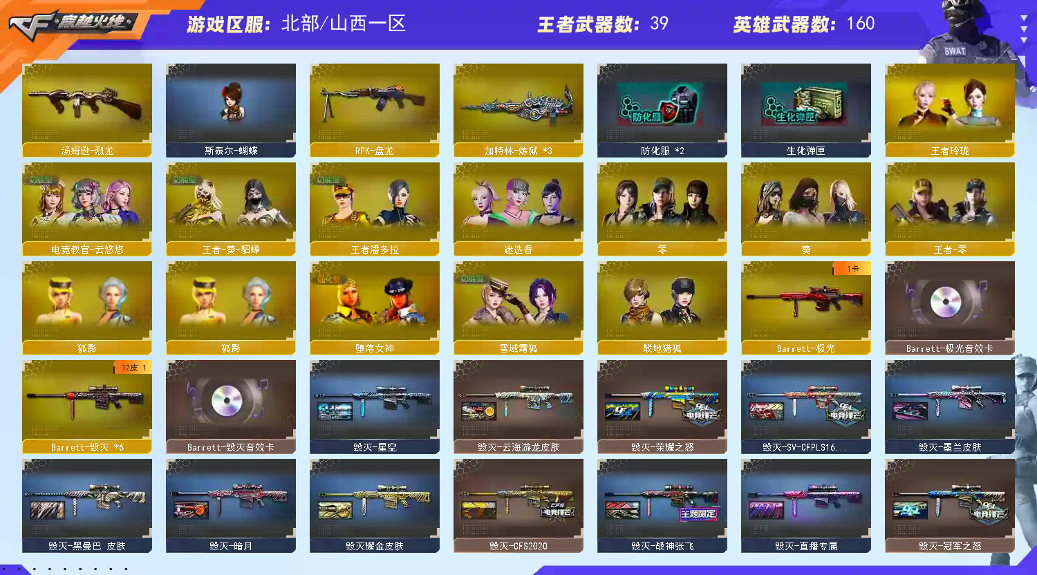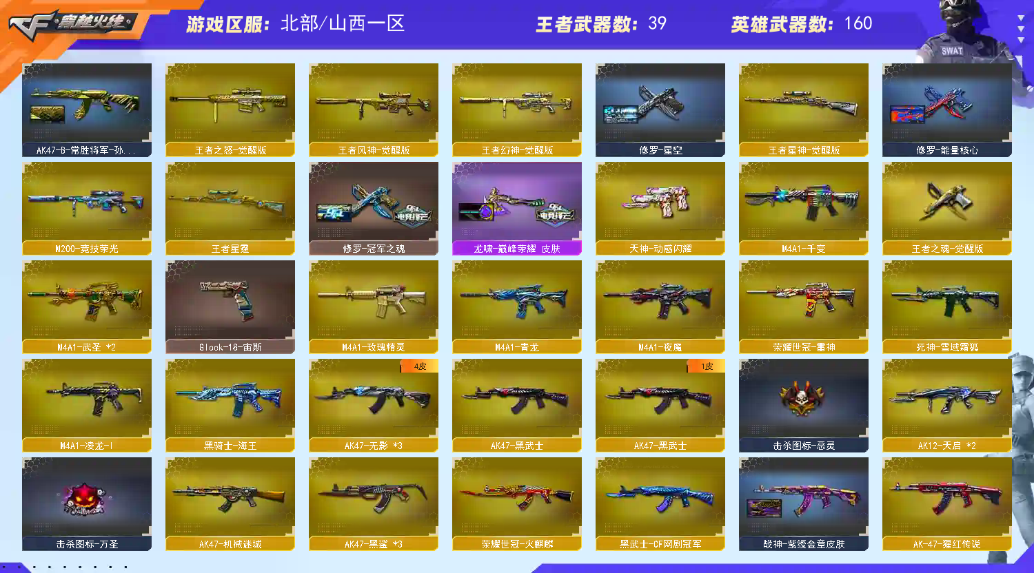 1-最重要的一点:(排位)禁止挂机 禁止中途退出,挂机退出会被禁赛,一天之内由于排位挂机已经被处罚禁赛好几次,大家互相理解一下,细水长流。 2-各类常用武器都有皮肤和音效卡,雷神 火麒麟 幻神 毁灭 黑武士 白虎 裁决 星神 g36c 夜魔套装投掷道具,各种粉烟 生化手雷,4 防角色角色有传说影煞,王者潘多拉 海豹突击队等。 3- 戒指属性洗满 ,还有各类玩偶以及枪械光效,弹夹 烟雾头盔 防弹头盔防弹衣 c4 皮肤以及c4 加速器都有。;