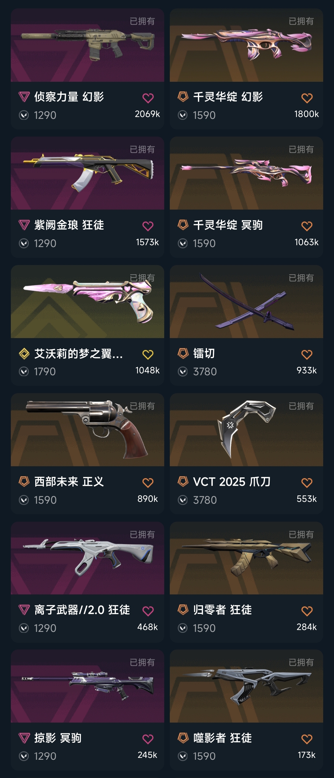 VCT爪刀⭐镭切⭐紫金离子 归零噬影狂徒⭐侦查 莲花幻影⭐西部正义⭐猫猫鬼魅⭐莲华 掠夺冥驹🈲炸鱼