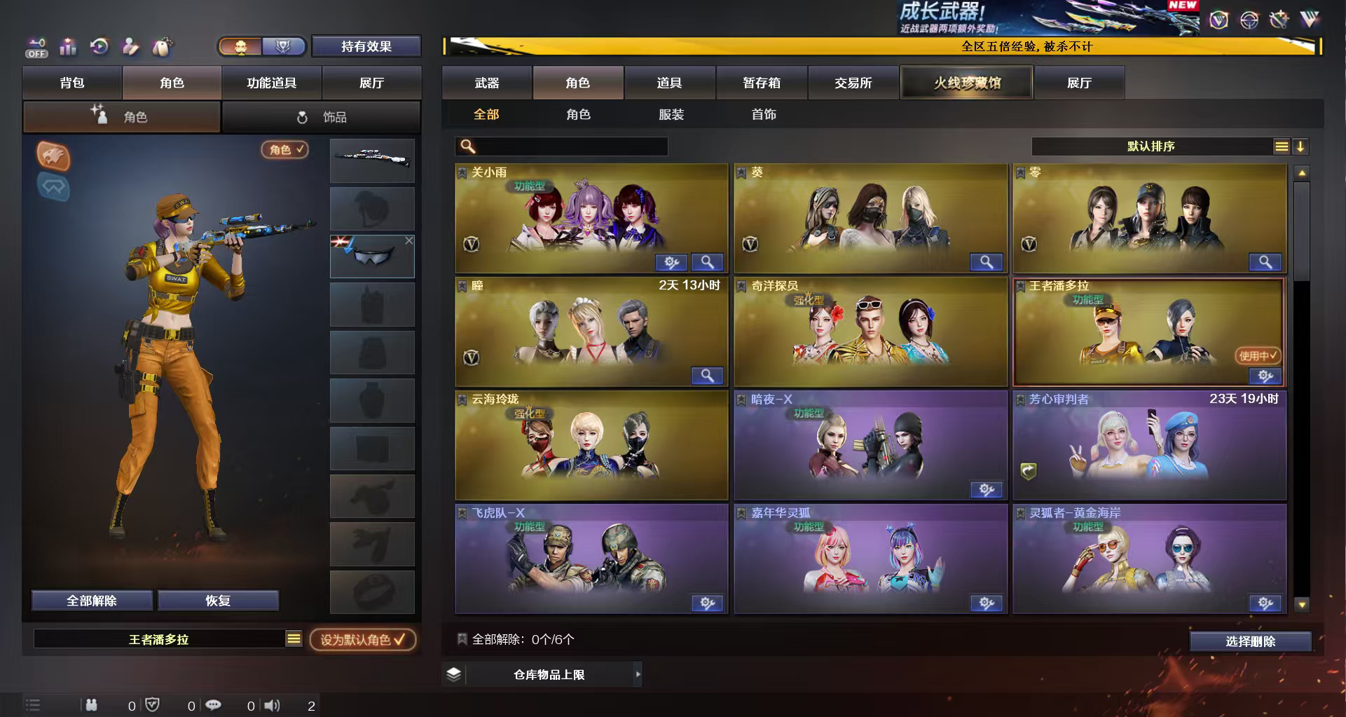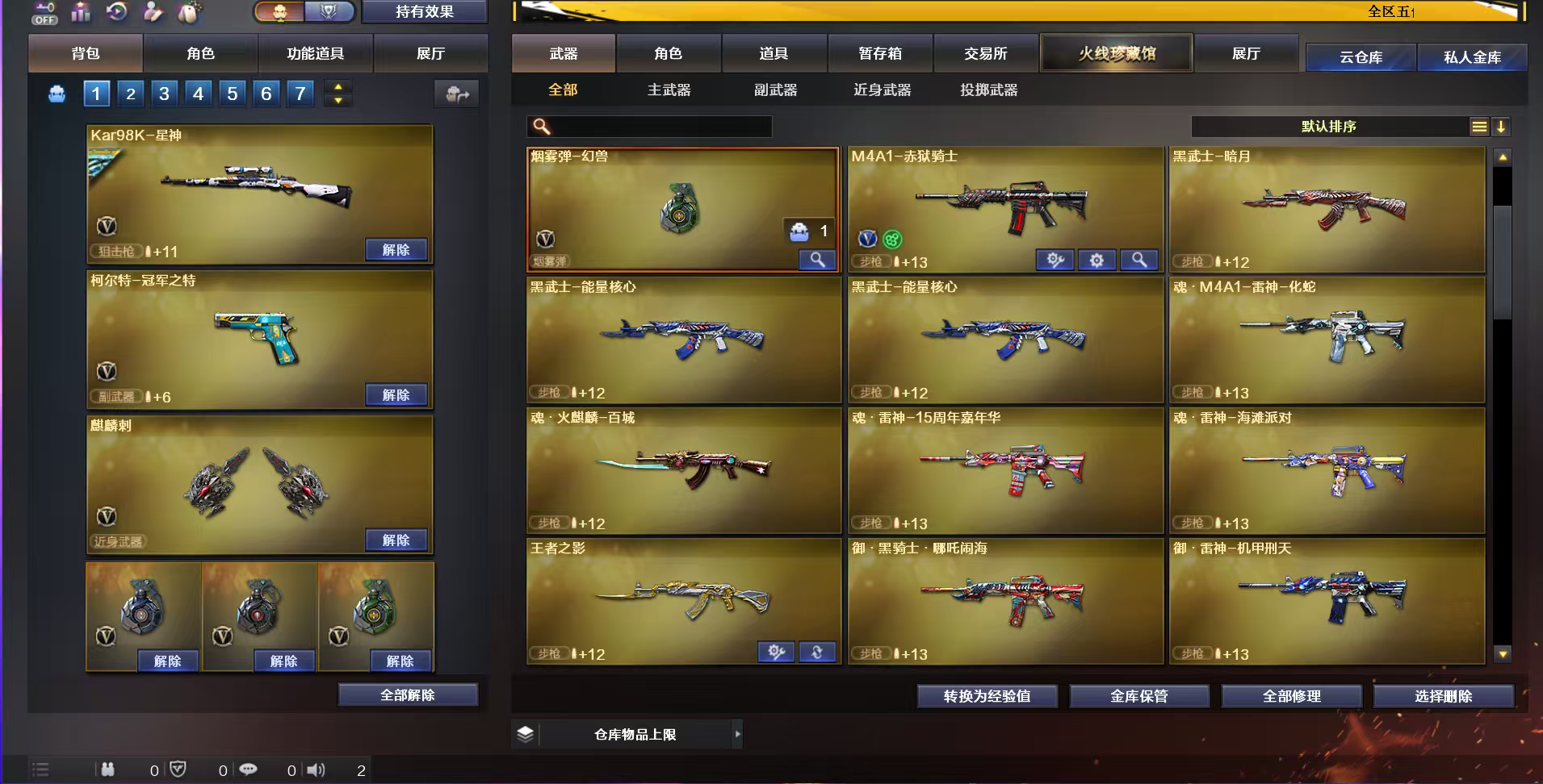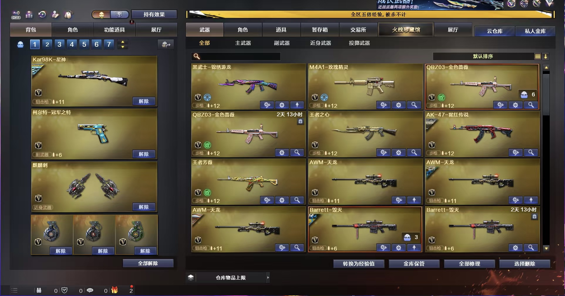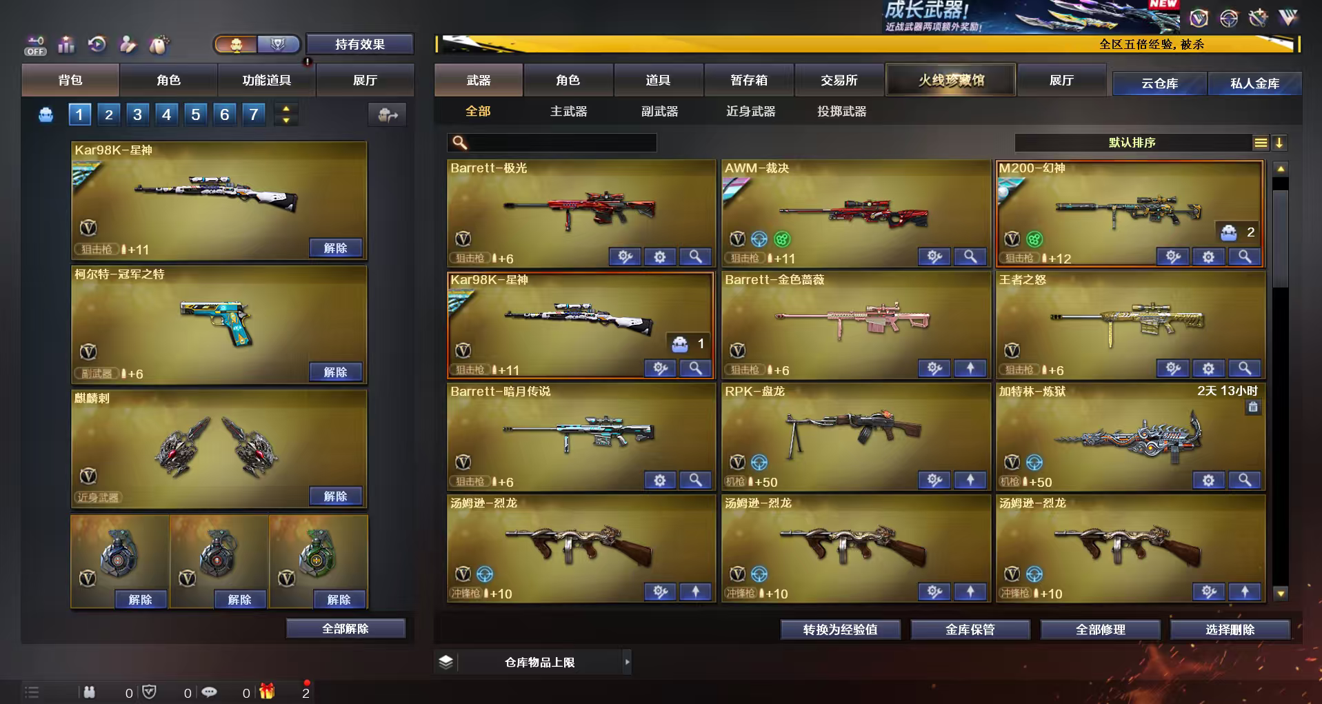 狙击枪: 98k星神(冠军之星皮肤) M200幻神(荣耀世冠白鲨皮肤) 王者之怒觉醒版 王者蔷薇 炫金天龙,普通天龙 毁灭(音效卡),极光,暗月传说 步枪: 王者之影,王者之心,王者芳薇,炫金黑龙 G36C幻影,m141br玄武,qbz03金色蔷薇,天罚 Ak47火麒麟,无影,猩红传说 M4A1雷神,黑龙,武圣,玫瑰精灵,黑骑士 3烈龙 角色:王者潘多拉,关小雨,葵,零;