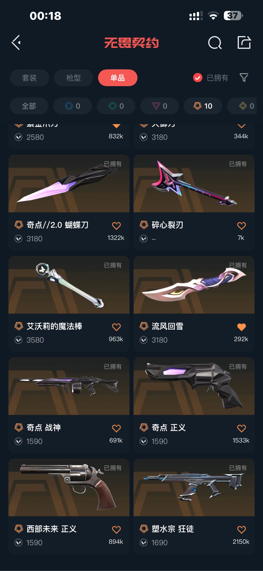 5把神刀皮⭐蝴蝶刀⭐流风回雪刀⭐艾茉莉魔法棒⭐紫爪刀⭐塑水狂徒⭐金狼狂徒⭐侦查幻影⭐神兵茂卫和鬼魅⭐奇点正义⭐西部正义⭐;奇点 战神,紫金爪刀,侦察力量 幻影,紫阙金琅 狂徒,天界神兵 戍卫,塑水宗 狂徒,西部未来 正义,