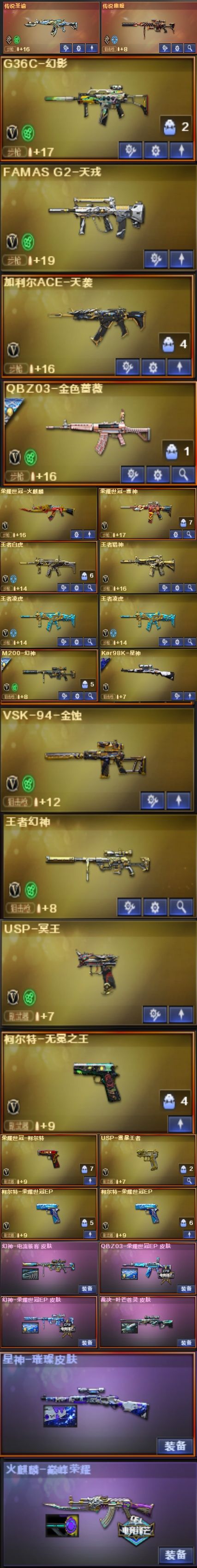 合 北部 河南一区 116v 【传说圣瑜/传说幽瞳】【幻神三件套】【98k星神】【m200幻神】【g36c幻影】【famas天戒】【加利尔天袭】【qbz金色蔷薇】【王者白虎】【王者凌虎x2】【vsk金蚀】【王者幻神】【usp冥王】【柯尔特无冕之王】【usp雷暴王者x2】 】【柯尔特荣耀世冠epx3】【玄豹手雷包/雷霆王者手雷包】【传说星骇/星际战将/玄豹/隼/王者炫/樱】【永久烟雾头护目镜】具体看图