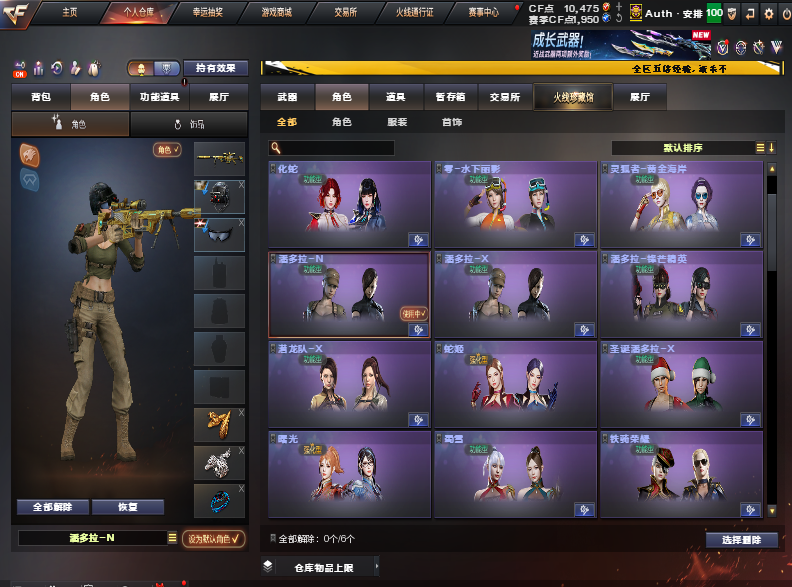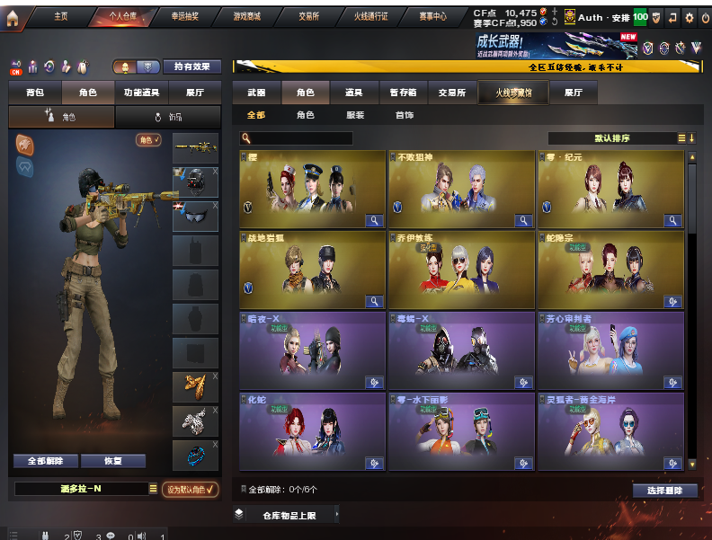 王者武器:王者森力;王者之武-觉醒版;王者冰锋;王者雷影;王者之武;王者之力 英雄武器:M4A1-千变;AK47-火麒麟;沙鹰-修罗;Anaconda-玄豹;丛林匕首-玄豹;传说圣谕;高爆手雷-玄豹;闪光弹-玄豹;烟雾弹-玄豹;SCAR Light-玄豹;龙啸-烈火龙威;机械迷城-穹宇;AWM-裁决;黑骑士-海王;擎天-竞技荣光;闪光弹-竞技荣光;烟雾弹-竞技荣光;M200-竞技荣光;高爆手雷-竞技荣光;加特林-炼狱;屠龙;M4A1-雷神;AK-47-猩红传说;AK47-B-战神;麒麟刺-堕天神;烟雾弹-堕天神;高爆手雷-堕天神;闪光弹-堕天神;AK47-B-战士;雷霆之锋;高爆手雷-雷霆;烟雾弹-雷霆;闪光弹-雷霆;M4A1-黑骑士;AK47-黑鲨;汤姆逊-烈龙;RPK-盘龙;9A91-烈火;Barrett-极光;沙鹰-天神;龙啸;斩神刀-雷暴;高爆手雷-雷暴;烟雾弹-雷暴;闪光弹-雷暴;AA-12-雷霆;M4A1-黑龙;麒麟刺;M4A1-死神;Barrett-毁灭;AN94-超新星;AK47-黑武士;AK47-无影;AWM-天龙;擎天 角色:樱;猎狐者;飞虎队;刀锋;潘多拉;波塞冬