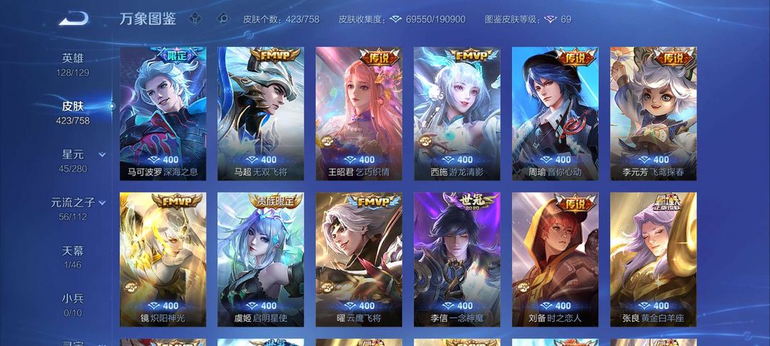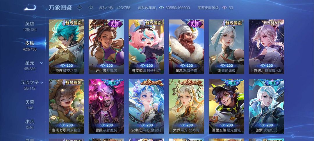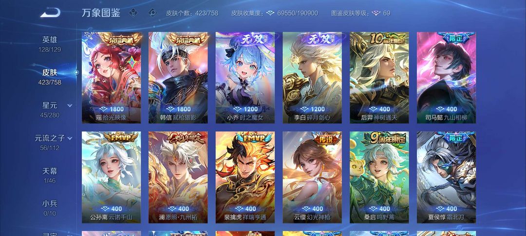 v10、12水562皮、死亡执政官、刘备星传说时之思念、小兵皮肤大耳狗甜茶、瑶无双真我赫兹、愿照·九州拓、怪盗基德、画中仙、至尊宝、凤求凰、神威、天魔缭乱