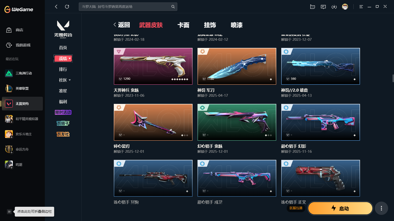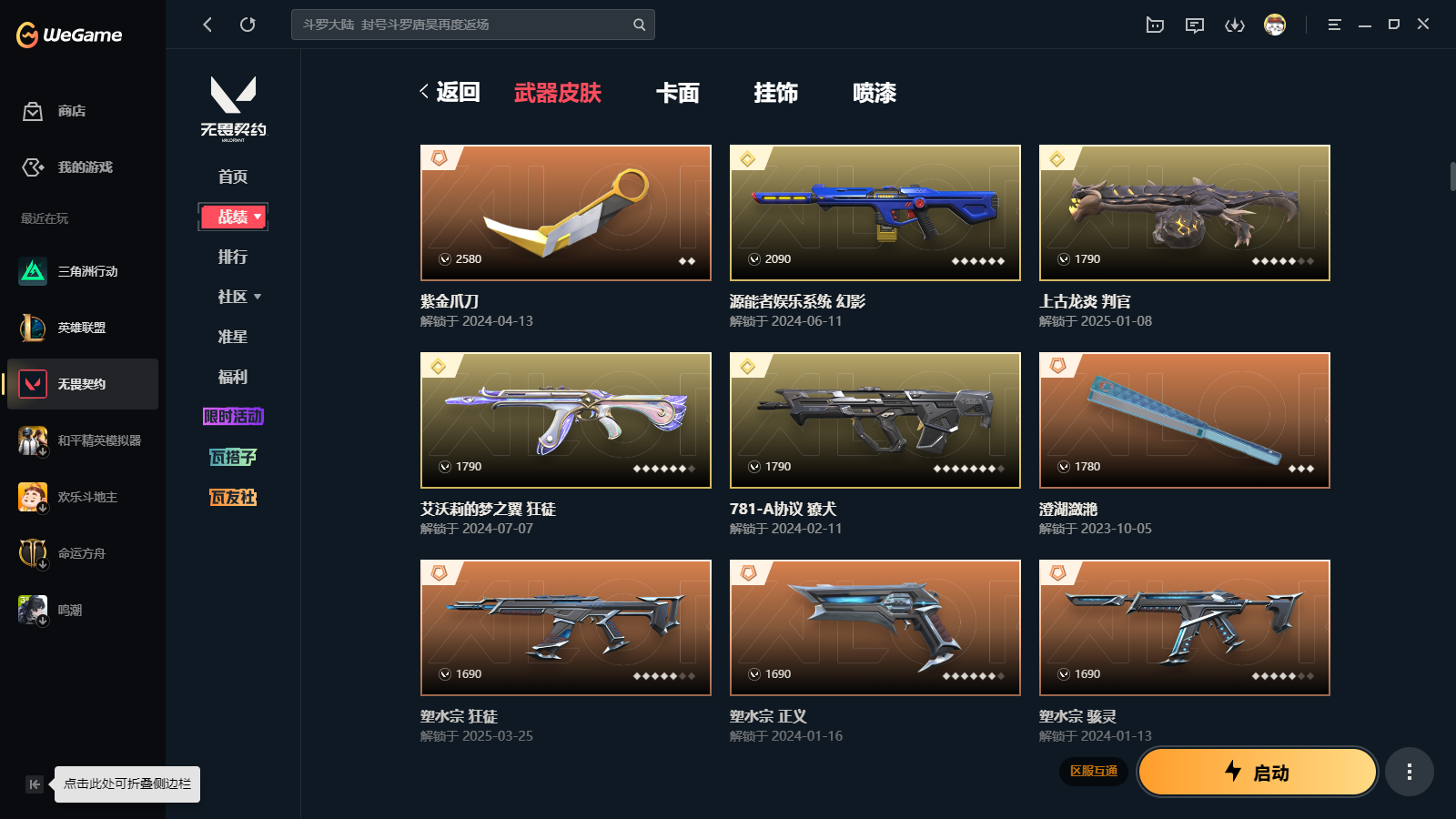 wegame无畏契约★皮肤数量194,塑水宗套装,西部未来套装,海洋之星套装,诛心猎手,生物分子解离器,影钩,未来开拓者,RGX蝴蝶刀,穿花蝴蝶,落英飞旋