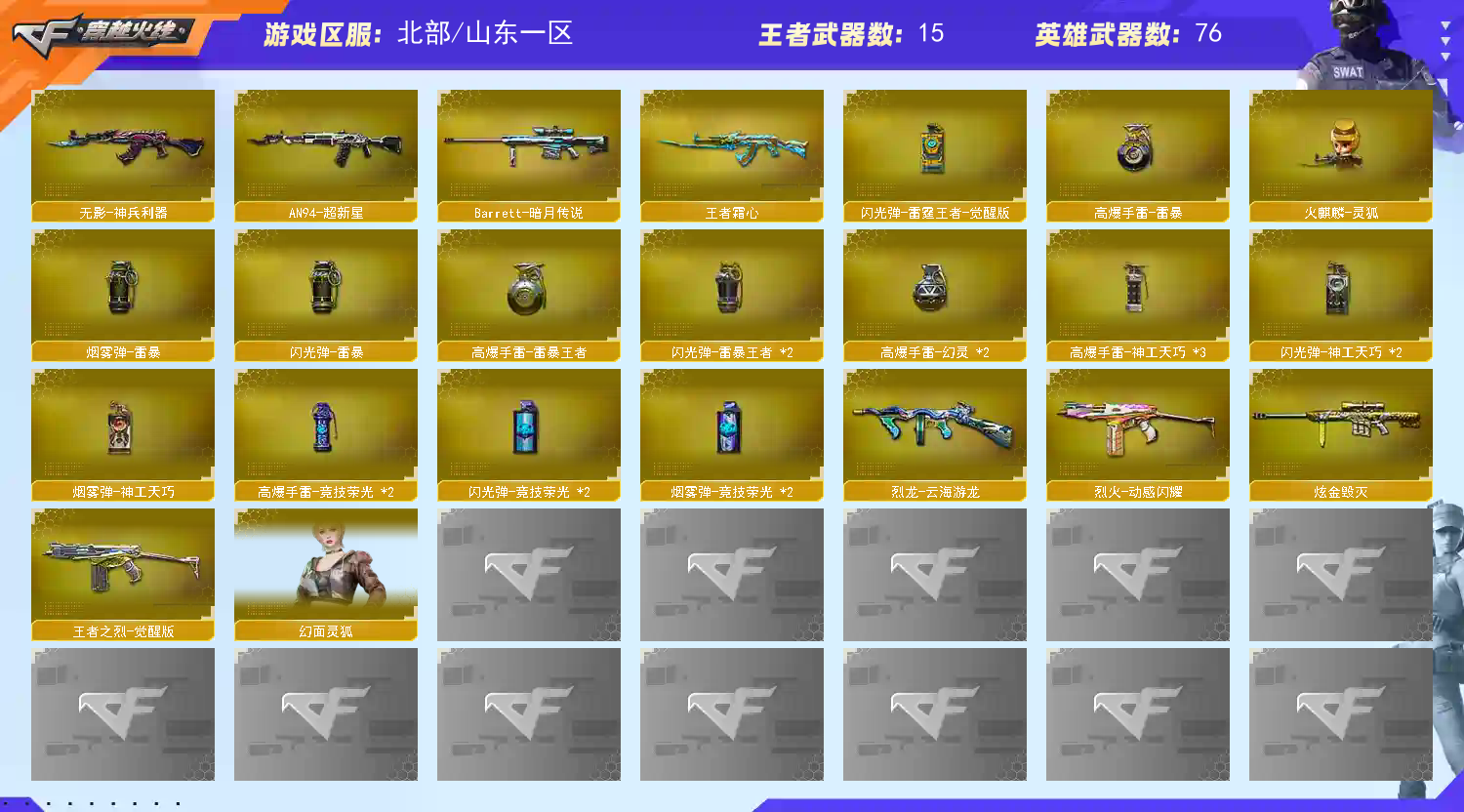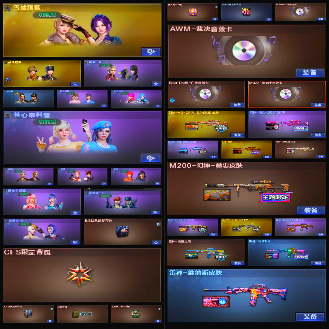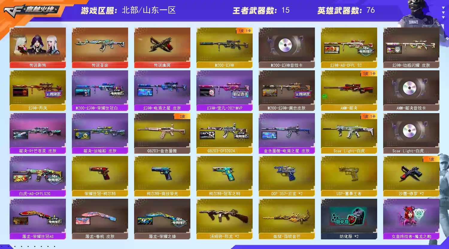 【山东一区】【幻神三件套】【幻神7皮】【白虎三件套】【雷暴套装X1套】【幻灵套装X2套】【神工天巧套装X3套】【竞技荣光套装X2套】【传说影煞】【传说圣谕】【传说幽冥】【M200-幻神】【幻神-AG-CFPL S24冠军 皮肤】【幻神-宠儿-2021MVP】【M200-幻神-荣耀世冠白鲨】【幻神-丹凤】【幻神-动感闪耀 皮肤】【M200-幻神-黄忠皮肤】【M200-幻神音效卡】【M200-竞技荣光】【王者星神-觉醒版】【AWM-裁决】【AWM-裁决音效卡】【裁决-叶芒苍灵 皮肤】【裁决-胜者为王 皮肤】【Scar Light-白虎】【白虎-AG-CFPLS20冠军】【Scar Light-白虎音效卡】【白虎-电玩蓝兔】【QBZ03-金色蔷薇】【QBZ03-CFS2024 皮肤】【金色蔷薇-空】【USP-雷暴王者】【柯尔特-冠军之特】【荣耀世冠-柯尔特】【柯尔特-竞技荣光】【COP 357-云龙】【炽芒蝶刃】【炼狱-百战金芒】【魂·炼狱-玩具枪】【汤姆逊-烈龙】【烈龙-云海游龙】【传说影煞】【奇洋探员】【乔伊教练】【蛇隐宗】【王者葵-惊若翩鸿】【王者凌霄】【王者潘多拉】【王者炫】【云海玲珑】【M4A1-雷神】【雷神-荣耀之魄】【雷神-传奇N9】【雷神-维纳斯皮肤】【雷神-宇航兔皮肤】【雷神-机甲刑天皮肤】【雷神-源计划2.0专属 皮肤】【AK47-火麒麟】【火麒麟-平天大圣】【火麒麟-心动糖果】【火麒麟-CFSTAR】【黑骑士-摸金校尉】【M4A1-黑骑士音效卡】【Barrett-毁灭】【毁灭-SV-CFPLS16冠军】【毁灭-CFS2020】【毁灭-百城浙江 皮肤】【毁灭-暗月】【毁灭-黑大圣皮肤】;USP-雷暴王者,荣耀世冠-柯尔特,传说幽冥,柯尔特-冠军之特,炽芒蝶刃,传说影煞,QBZ03-金色蔷薇,