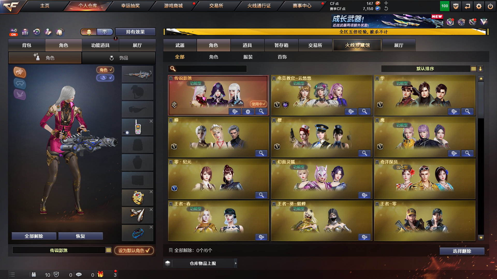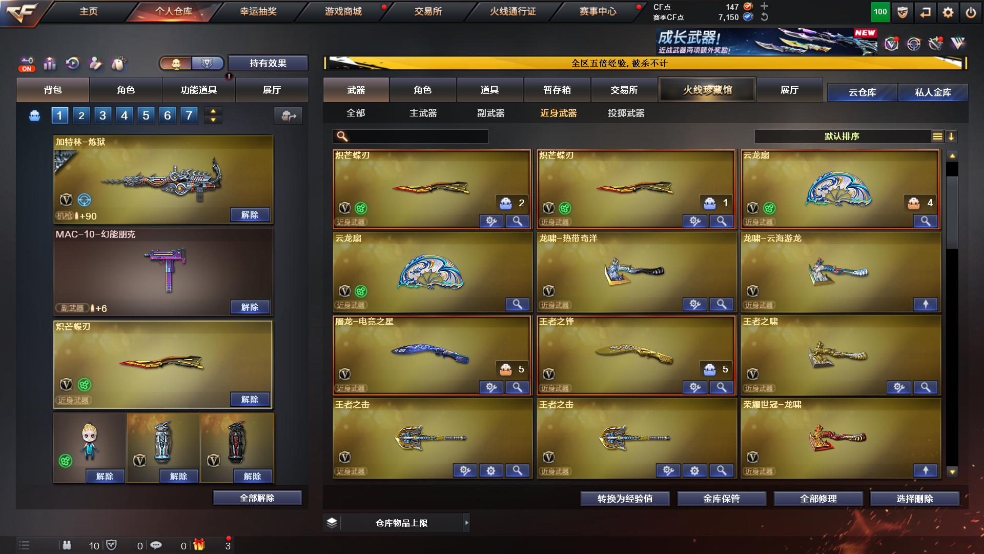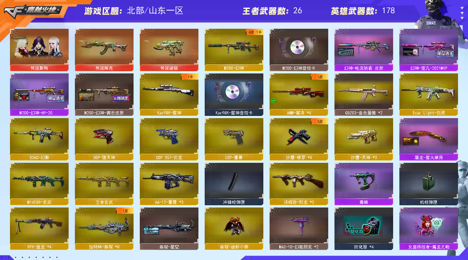 传说辉光 M200幻神 Kar98K星神 AWM裁决 ScarLight白虎 G36C-幻影 M200幻神音效卡 Kar98K星神音效卡 M4A1雷神音效卡 9把炼狱 双死亡之眼 双玄武 双蝴蝶刀 传说影煞 云悠悠4防角色;USP-雷暴,炽芒蝶刃,传说影煞,电竞教官-云悠悠,RPK-盘龙,QBZ03-金色蔷薇,G36C-幻影,