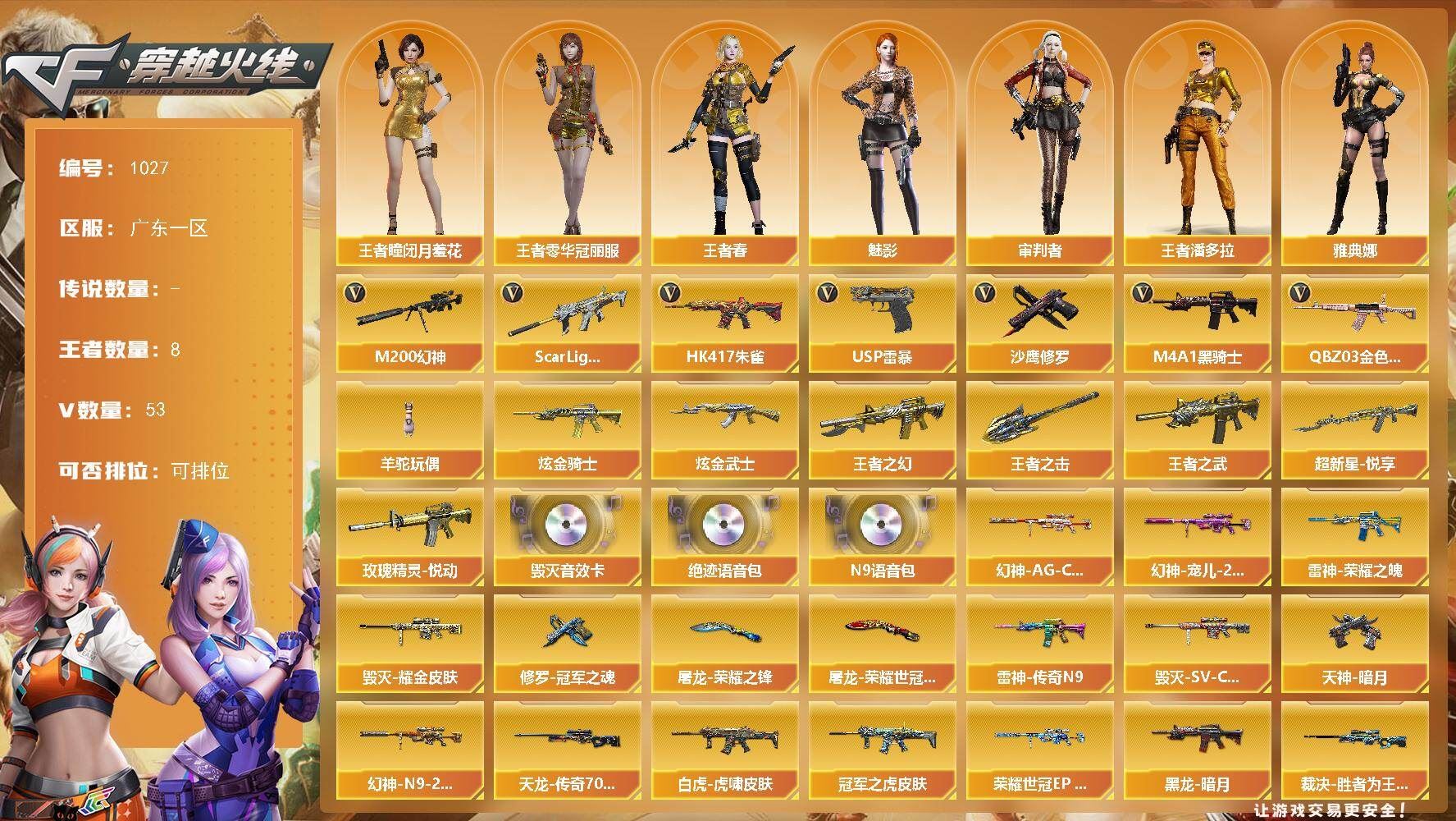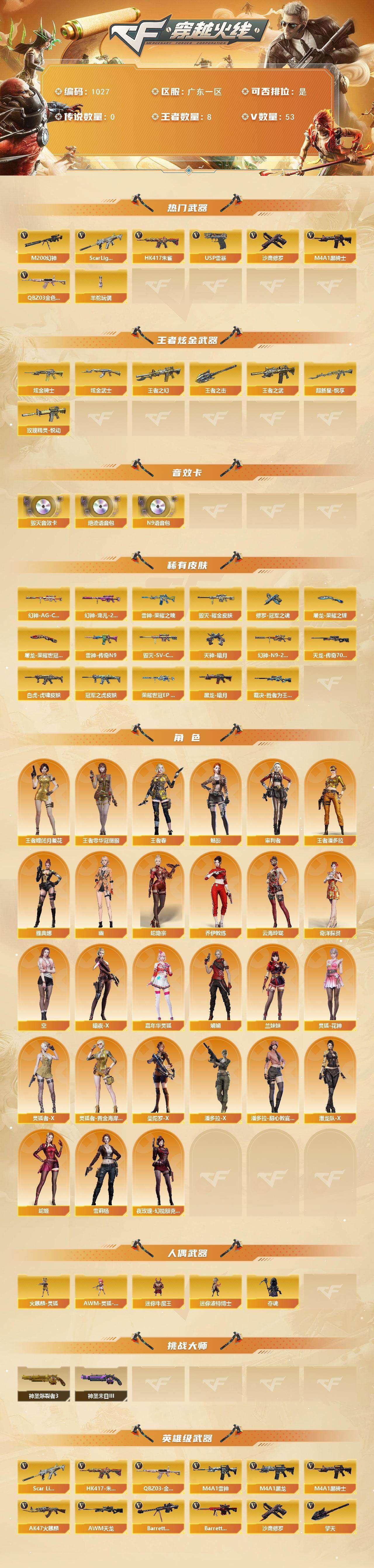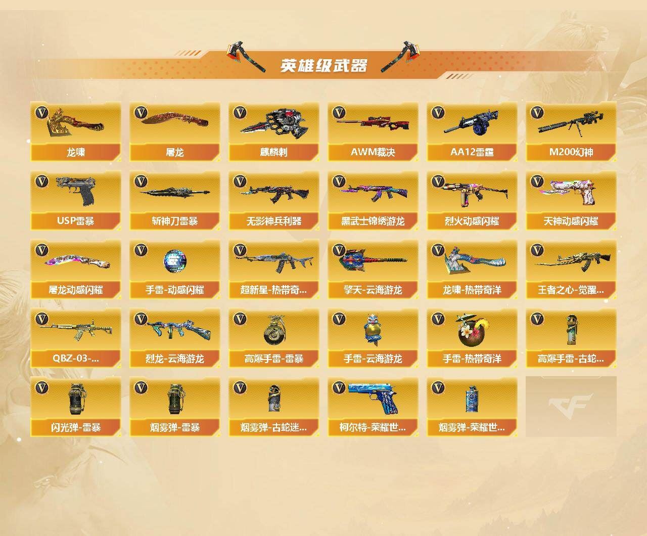 【热门武器】:QBZ03-金色蔷薇,Scar Light-白虎,HK417-朱雀,M200-幻神,M4A1-黑骑士,羊驼玩偶,USP-雷暴,沙鹰-修罗*3【王者炫金武器】:超新星-悦享,王者之幻,王者之武,玫瑰精灵-悦动*2,王者之击,炫金骑士,炫金武士*2【音效卡】:Barrett-毁灭音效卡,绝迹语音包,N9语音包【皮肤】:幻神-宠儿-2021MVP,M200-幻神-N9-2022MVP,幻神-AG-CFPL S24冠军 皮肤,幻神-荣耀世冠EP 皮肤,白虎-虎啸皮肤,ScarLight-白虎-冠军之虎皮肤,裁决-胜者为王 皮肤,雷神-荣耀之魄,雷神-传奇N9,毁灭耀金皮肤,毁灭-SV-CFPLS16冠军,黑龙-暗月,AWM-天龙-传奇70KG,修罗-冠军之魂,天神-暗月,屠龙-荣耀之锋,屠龙-荣耀世冠AG【角色】:魅影,审判者,王者-瞳-闭月羞花,王者零-华冠丽服,王者春,王者潘多拉,蛇隐宗,奇洋探员,乔伊教练,云海玲珑,空,暗夜-X,嘉年华灵狐,娟娟,兰妹妹,灵狐-花神,灵狐者-X,灵狐者-黄金海岸,曼陀罗-X,潘多拉-X,潘多拉-甜心教官,潜龙队-X,蛇姬,雪莉杨,夜玫瑰-幻能朋克,幽,雅典娜【人偶武器】:火麒麟-灵狐,AWM-灵狐-15周年嘉年华,迷你牛魔王,迷你波特博士,夺魂【挑战大师】:神圣爆裂者III,神圣爆裂者-末日III【英雄级武器】:AK47-火麒麟,M4A1-黑龙,M4A1-雷神*2,M4A1-黑骑士,HK417-朱雀,Scar Light-白虎,无影-神兵利器,黑武士-锦绣游龙,超新星-热带奇洋,QBZ03-金色蔷薇,烈火-动感闪耀,王者之心-觉醒版,QBZ-03-王者蔷薇-觉醒版,AWM-天龙,Barrett-毁灭,Barrett-极光,AWM-裁决,M200-幻神,烈龙-云海游龙,AA-12-雷霆*2,沙鹰-修罗*3,USP-雷暴,柯尔特-荣耀世冠EP,天神-动感闪耀,屠龙*3,龙啸,擎天,麒麟刺,屠龙-动感闪耀,擎天-云海游龙,龙啸-热带奇洋,斩神刀-雷暴,高爆手雷-雷暴*4,手雷-动感闪耀,手雷-云海游龙,手雷-热带奇洋,高爆手雷-古蛇迷踪,闪光弹-雷暴*4,烟雾弹-雷暴*4,烟雾弹-古蛇迷踪,烟雾弹-荣耀世冠EP*2【道具】:CFS限定背包,EP战队炫彩背包,云海游龙炫彩背包,亚洲杯纪念炫彩背包,全能枪王背包,奇洋探员-海龟背包,战舰背包,热带奇洋炫彩背包,绿色巨人,灵魂忍者,迷雾幽灵,生化弹匣,夺命之镰,防化服*4,金色流光-枪王排位*2,星辰流光-枪王排位,枪王排位28赛季金色流光,枪王排位29赛季金色流光,蛇隐宗表情,热带奇洋表情,动感闪耀表情,云海游龙表情,EP战队名片,EP战队喷图,防弹头盔*9,防弹衣*9,C4工具钳*8,手雷包*8,;USP-雷暴,QBZ03-金色蔷薇,M200-幻神,Scar Light-白虎,