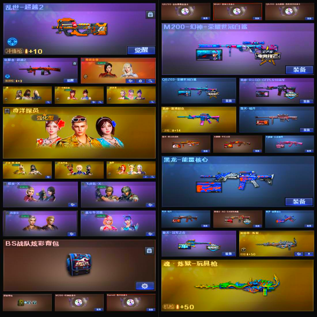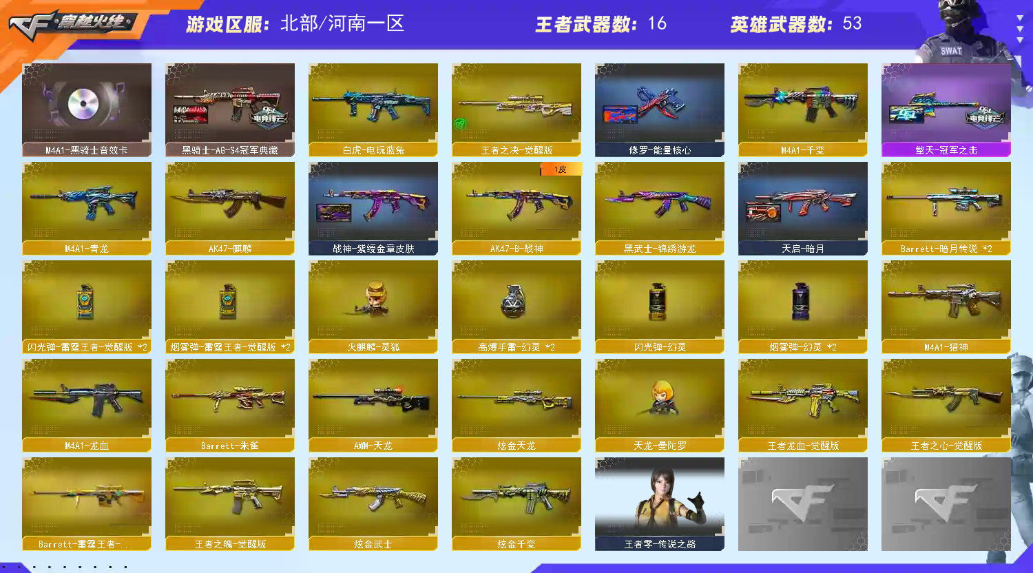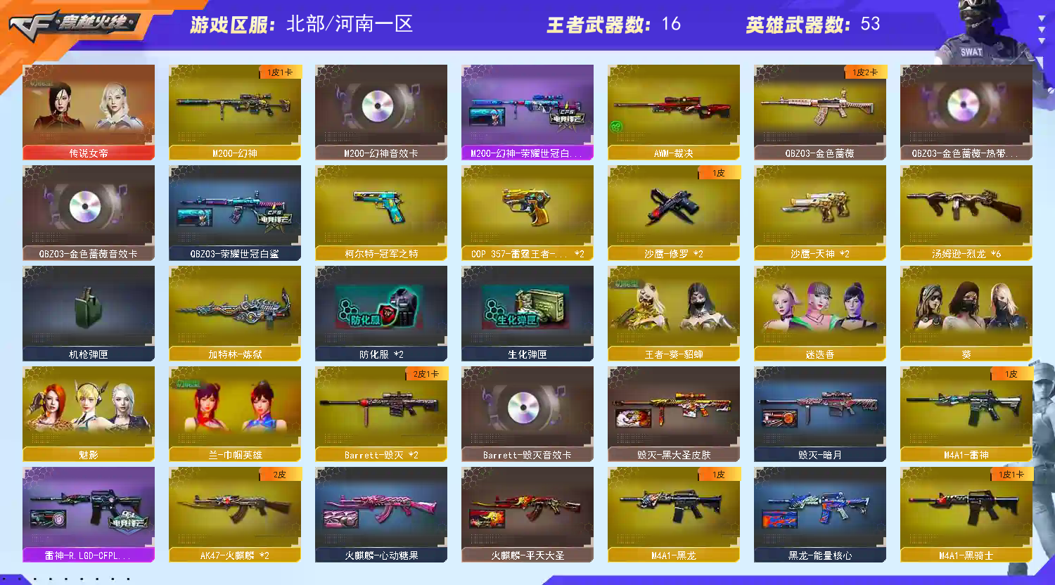 【河南一区】【传说女帝】【幻神三件套】【金色蔷薇三件套】【6烈龙】【幻灵套装X2套】【M200-幻神】【M200-幻神-荣耀世冠白鲨】【M200-幻神音效卡】【AWM-裁决】【白虎-电玩蓝兔】【QBZ03-金色蔷薇】【QBZ03-荣耀世冠白鲨】【QBZ03-金色蔷薇音效卡】【M4A1-青龙】【柯尔特-冠军之特】【COP 357-雷霆王者-觉醒版】【黄金猫猫手套-白鲨】【加特林-炼狱】【魂·炼狱-玩具枪】【汤姆逊-烈龙】【死亡之眼】【传说女帝】【葵】【兰-巾帼英雄】【迷迭香】【奇洋探员】【王者-葵-貂蝉】【云海玲珑】【魅影】【M4A1-雷神】【雷神-R.LGD-CFPLS18冠军】【雷神-赛博朋克】【AK47-火麒麟】【火麒麟-平天大圣】【火麒麟-心动糖果】【火麒麟-雷神】【M4A1-黑骑士】【黑骑士-AG-S4冠军典藏】【M4A1-黑骑士音效卡】【M4A1-黑龙】【黑龙-能量核心】【黑龙-暗月】【Barrett-毁灭】【毁灭-暗月】【毁灭-黑大圣皮肤】【Barrett-毁灭音效卡】;柯尔特-冠军之特,传说女帝,QBZ03-金色蔷薇,M200-幻神,