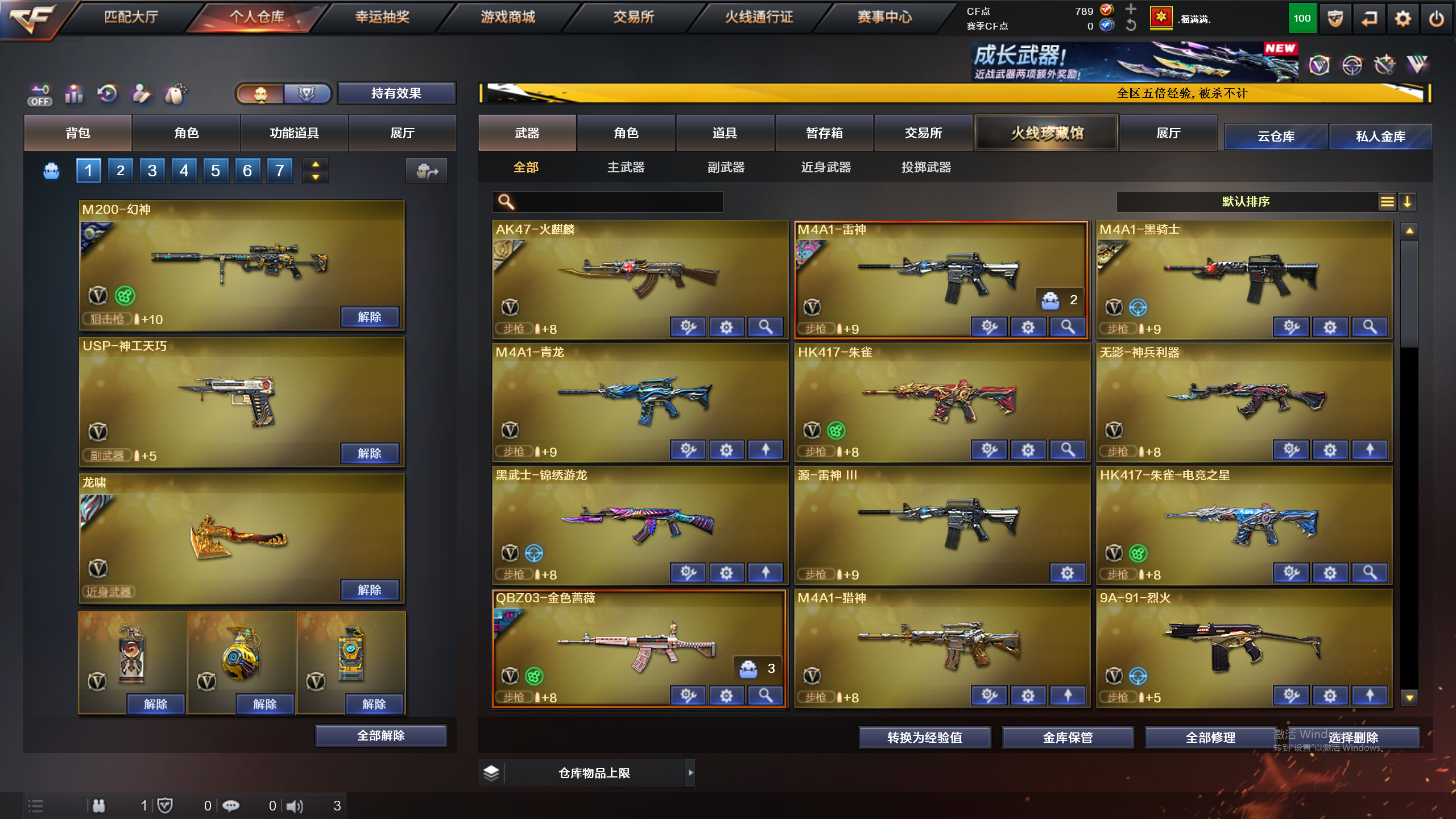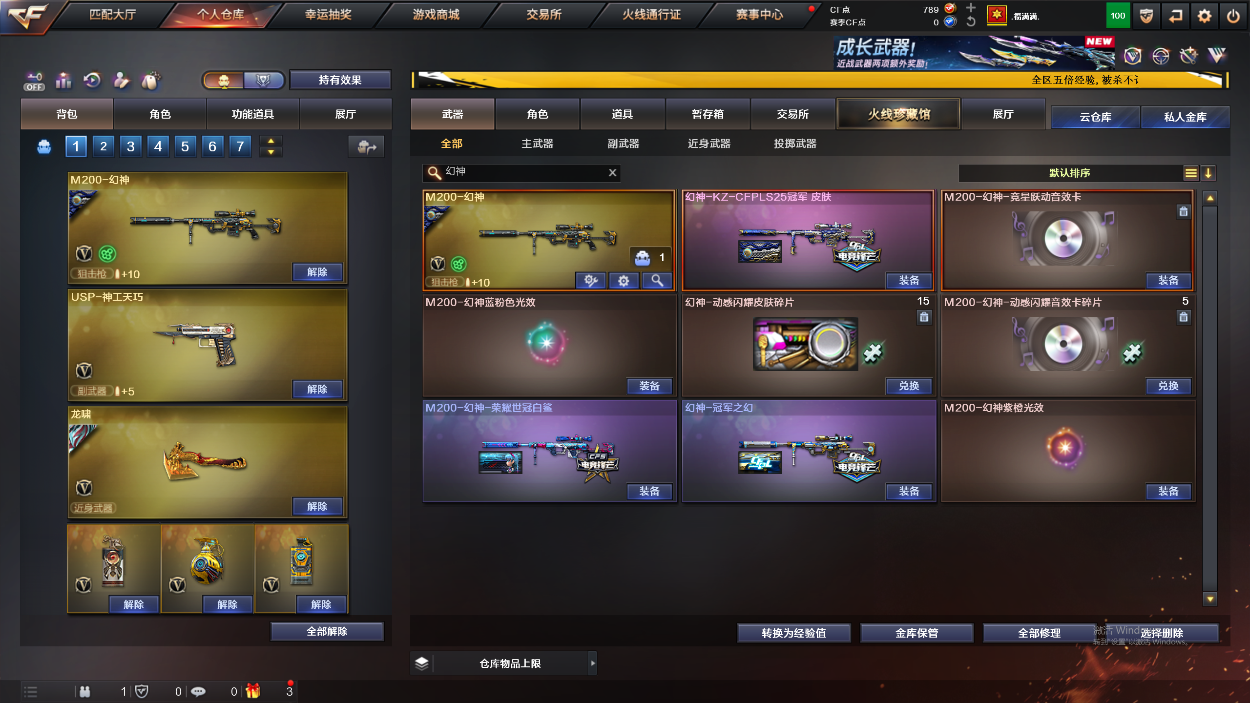 冠军之幻,幻神荣耀世冠白鲨,幻神KZ,7套雷,屠龙龙啸擎天都有皮肤;传说艾莉莎,QBZ03-金色蔷薇,M200-幻神,Kar98K-星神,