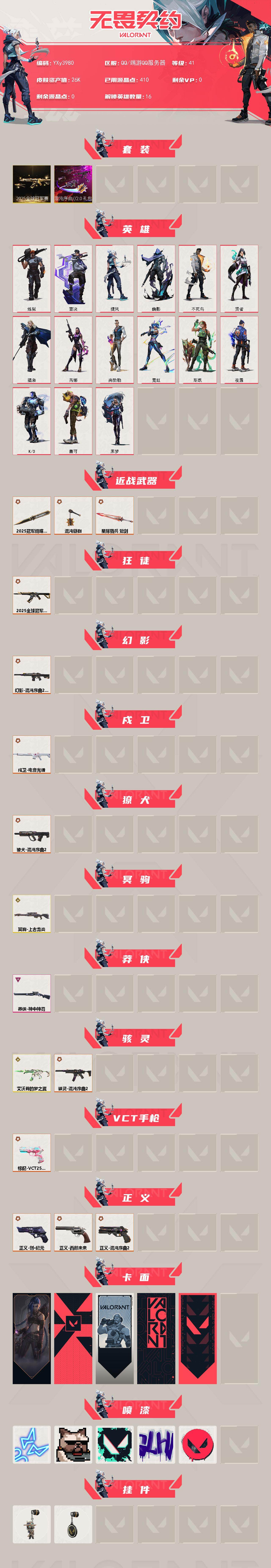 冻结三分钟内解除,短信通知重新上即可!喜欢收藏不迷路、游戏异常进小黑屋、时间不够请提前续租或者不要开局 【套装】:2025全球冠军赛套装,混沌序曲//2.0套装 【英雄】:炼狱,壹决,捷风,幽影,不死鸟,贤者,猎枭,芮娜,尚勃勒,霓虹,斯凯,夜露,K/O,盖可,黑梦 【近战武器】:近战武器-2025全球冠军赛 蝴蝶刀,近战武器-混沌链枷,近战武器-星际猎兵 短剑 【狂徒】:狂徒-2025全球冠军赛 【幻影】:幻影-混沌序曲//2.0 【戍卫】:戍卫-电音光谱,戍卫-电音光谱 【獠犬】:獠犬-混沌序曲//2.0 【冥驹】:冥驹-上古龙炎 【莽侠】:莽侠-神中神罚 【骇灵】:骇灵-艾沃莉的梦之翼,骇灵-混沌序曲//2.0 【VCT手枪】:标配-VCT25 x BLG 【正义】:正义-创·纪元,正义-西部未来,正义-混沌序曲//2.0 【卡面】:《双城之战》金克丝 卡面,代号红色 卡面,新兵报到 卡面,V契约 卡面,无畏契约 卡面 【喷漆】:霓光四射 喷漆,关门放狗 喷漆,胜利属于无畏契约 喷漆,GLHF 喷漆,无畏契约 喷漆 【挂饰】:无畏契约GO!第卷 零 挂饰,无畏契约 纪念币 挂饰;西部未来 正义,